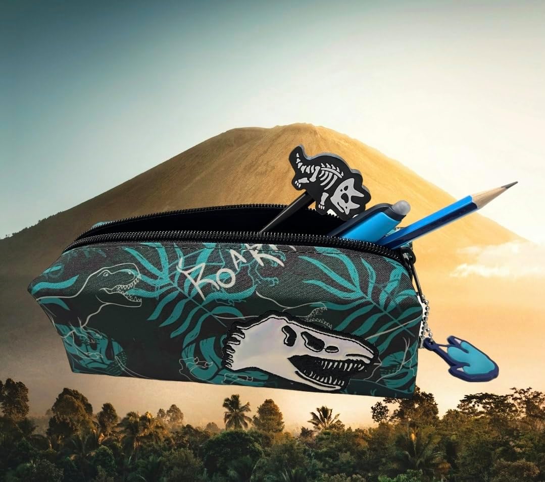Astucci per matite per bambini a scuola, all'asilo e per attività creative nel tempo libero Decorato con un motivo a foglie in nero e verde e un motivo a dinosauro in argento scintillante. Offre spazio sufficiente per penne stilografiche, matite, righelli, forbici e altri strumenti di scrittura Ottima idea regalo per un compleanno o per il primo giorno di scuola Dimensioni: 20 x 7 x 7 cm