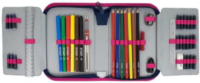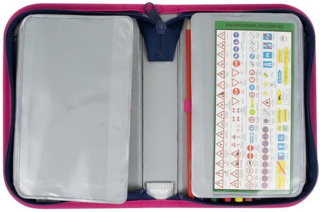 Valigia per studenti, 2 schede, riempita con 50 parti, 6 modelli diversi, l'imbottitura è composta da: 6 matite colorate senza legno 1 matita, senza legno, durezza HB 1 temperino, 1 gomma, 1 righello 17 cm