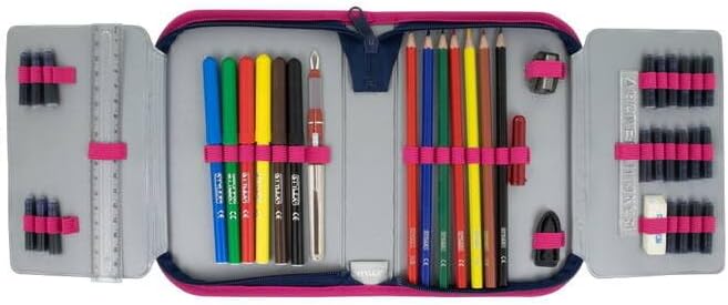 Valigia per studenti, 2 schede, riempita con 50 parti, 6 modelli diversi, l'imbottitura è composta da: 6 matite colorate senza legno 1 matita, senza legno, durezza HB 1 temperino, 1 gomma, 1 righello 17 cm