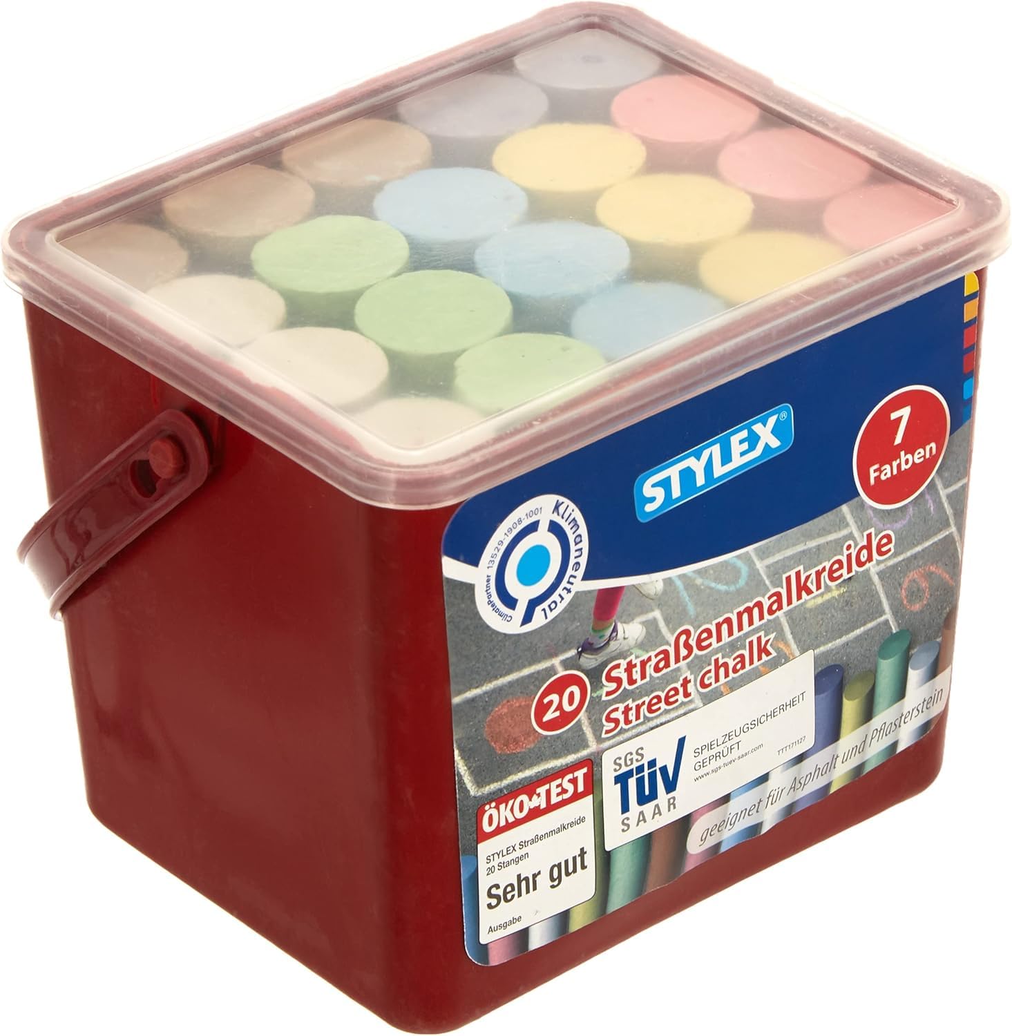 Adatto per dipingere e disegnare su asfalto e pavimentazione di pietre. In 7 diversi colori. In secchio di plastica rettangolare con maniglia. Certificazione ÖKO-TEST.