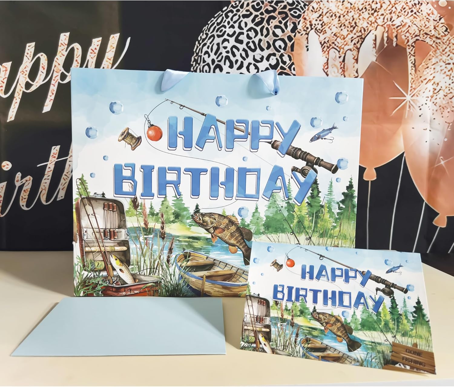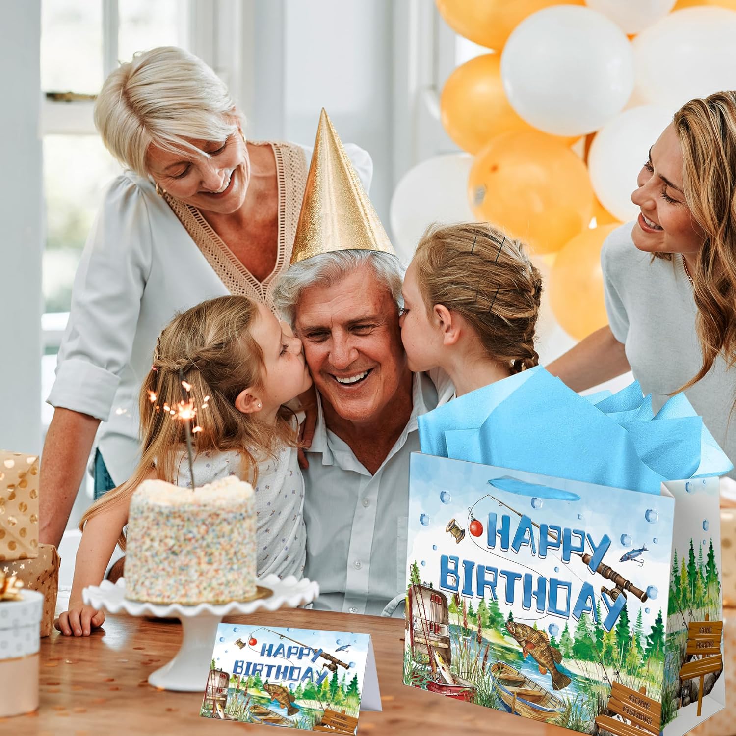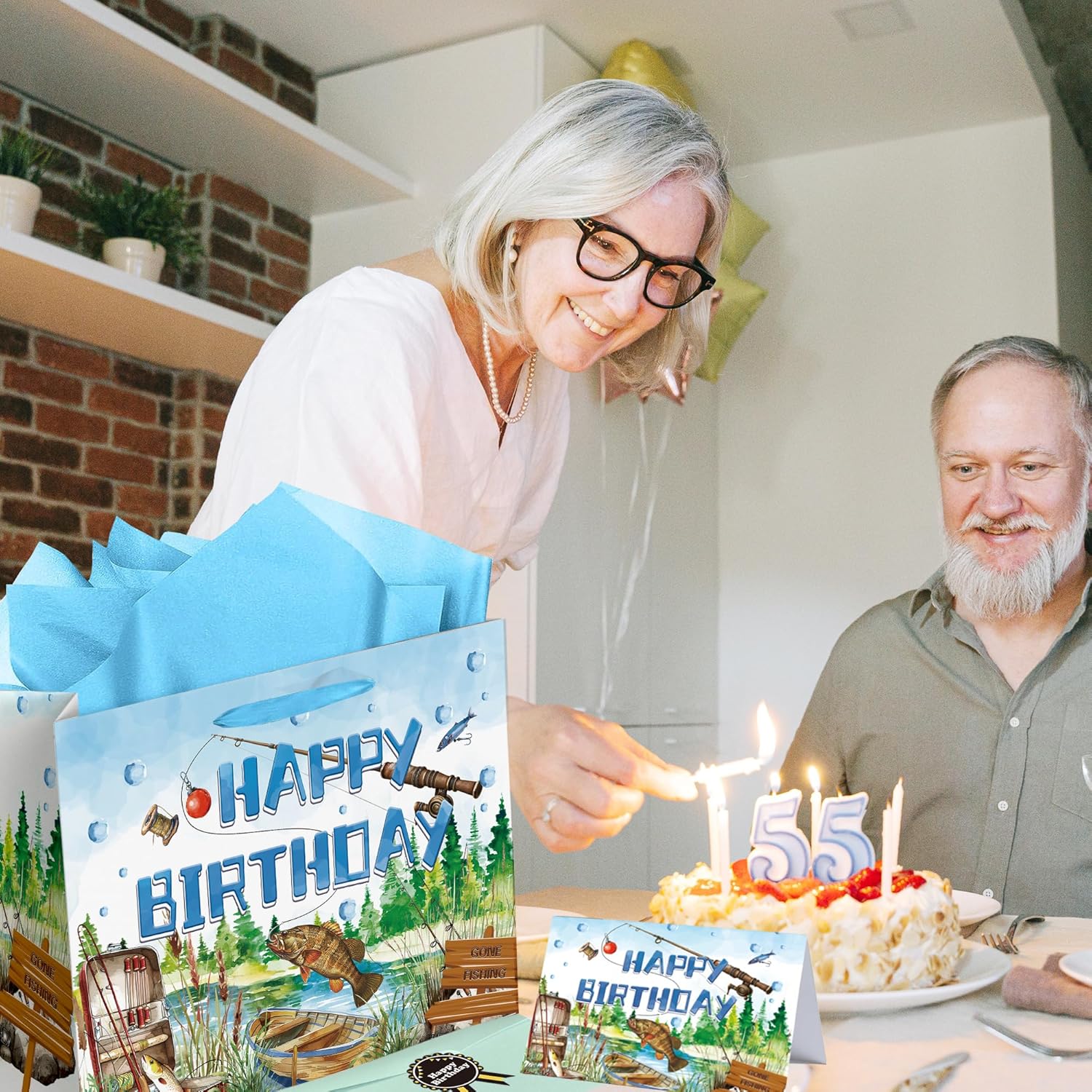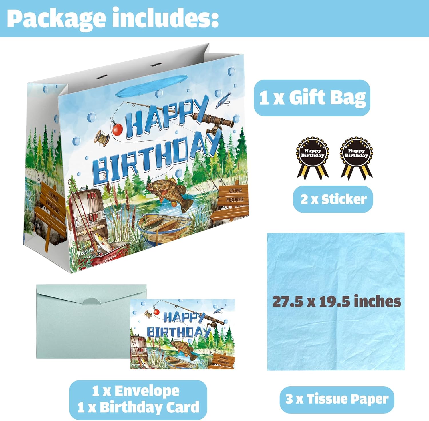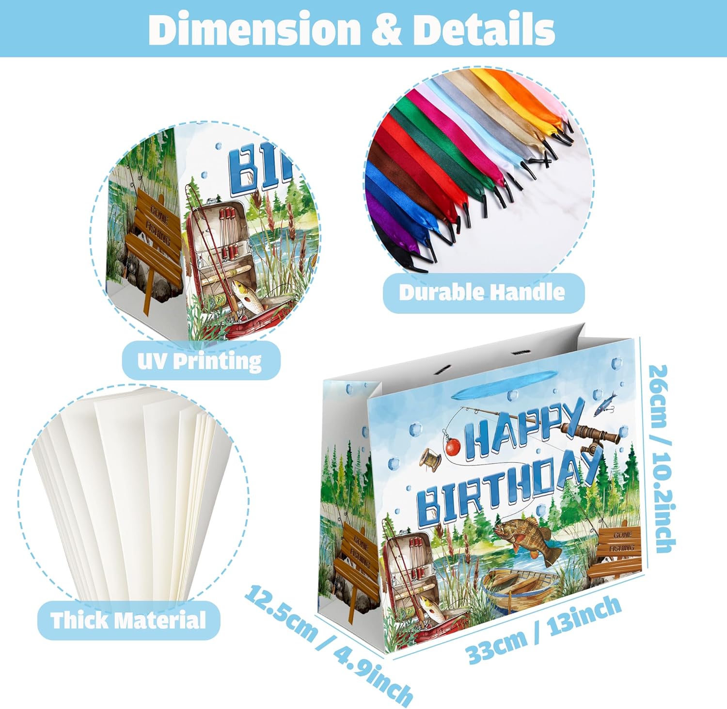 Confezione: riceverai 1 sacchetto regalo di compleanno per la pesca + 3 pezzi di carta velina blu + 2 adesivi di compleanno + 1 biglietto di compleanno con busta, soddisfa tutte le tue esigenze di confezione regalo e ti lascerà assolutamente un'impressione profonda. Stampa UV: la stampa UV rende il colore della borsa più vivido e luminoso. Il design unico della borsa fa risaltare i tuoi regali dalla massa. Abbiamo combinato il cielo azzurro e la scena della pesca, rendendolo più adatto per feste di compleanno a tema pesca per uomini e donne. Materiale: la borsa regalo di compleanno è realizzata in cartone spesso 300 g/m², ha manici blu e una base rinforzata, rendendo la borsa abbastanza robusta da contenere i tuoi regali di compleanno. La superficie del materiale è rivestita con una pellicola in PVC trasparente, che rende la borsa impermeabile e resistente ai colori. Grandi dimensioni: la dimensione della borsa compleanno è L 33 x P 12,5 x H 26 cm, la dimensione del biglietto d'auguri è L 15 x H 10 cm quando piegato (L 15 x H 20 cm quando aperto), la dimensione dell'adesivo compleanno è H 6,6 x L 4,6 cm e la dimensione della carta velina è L 70 x L 50 cm Utilizzo: perfetto per trasportare e confezionare regali di compleanno come giocattoli, libri, puzzle, giochi da tavolo, materiale artistico, attrezzature sportive e dispositivi elettronici. Porta più gioia alla tua festa ed esprimi pienamente il tuo amore speciale