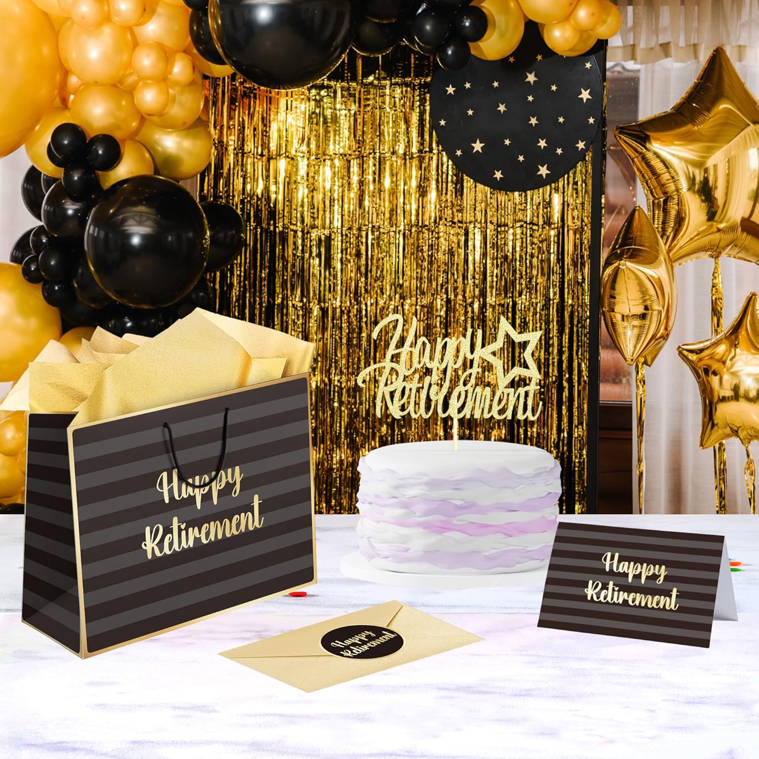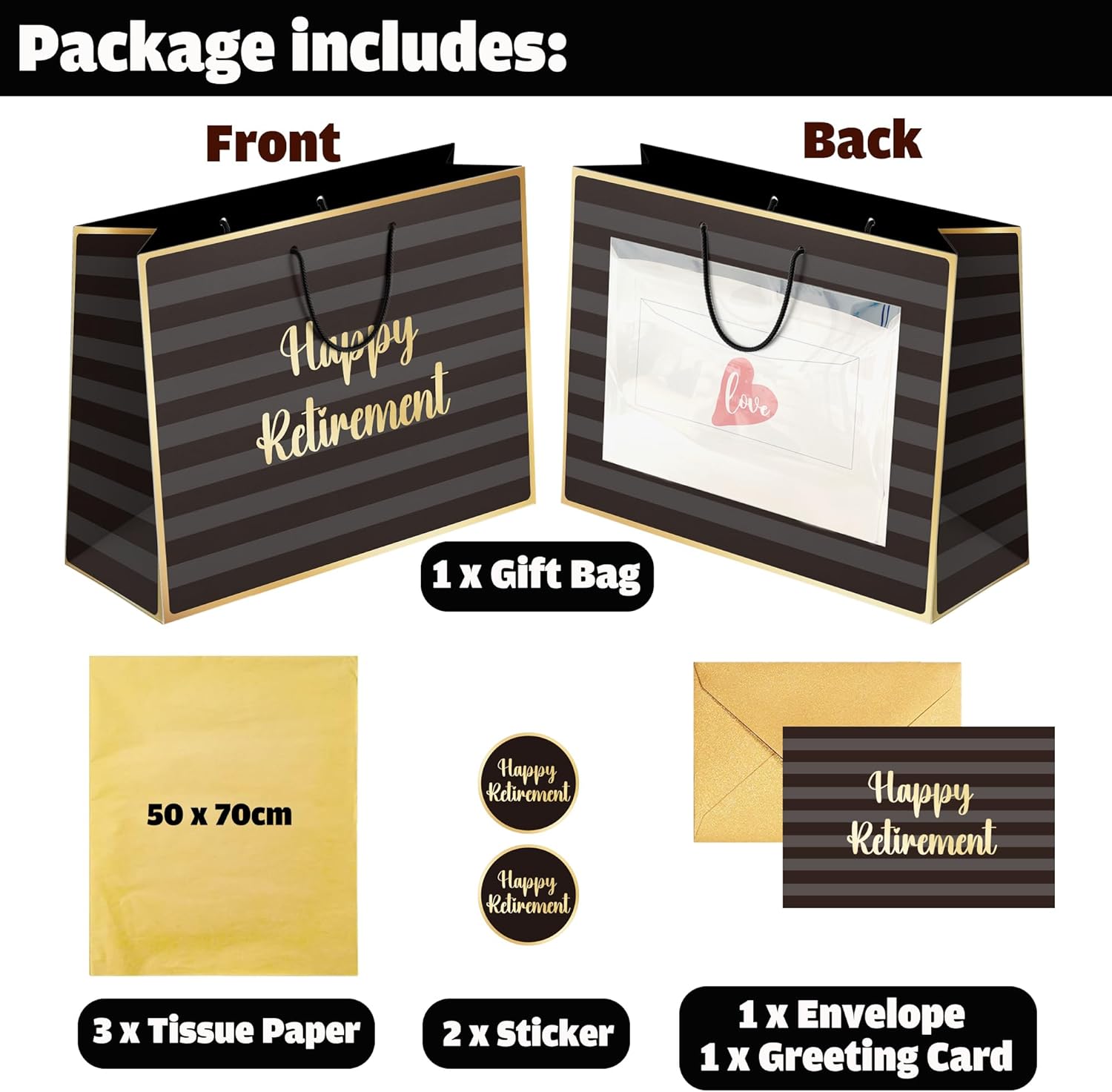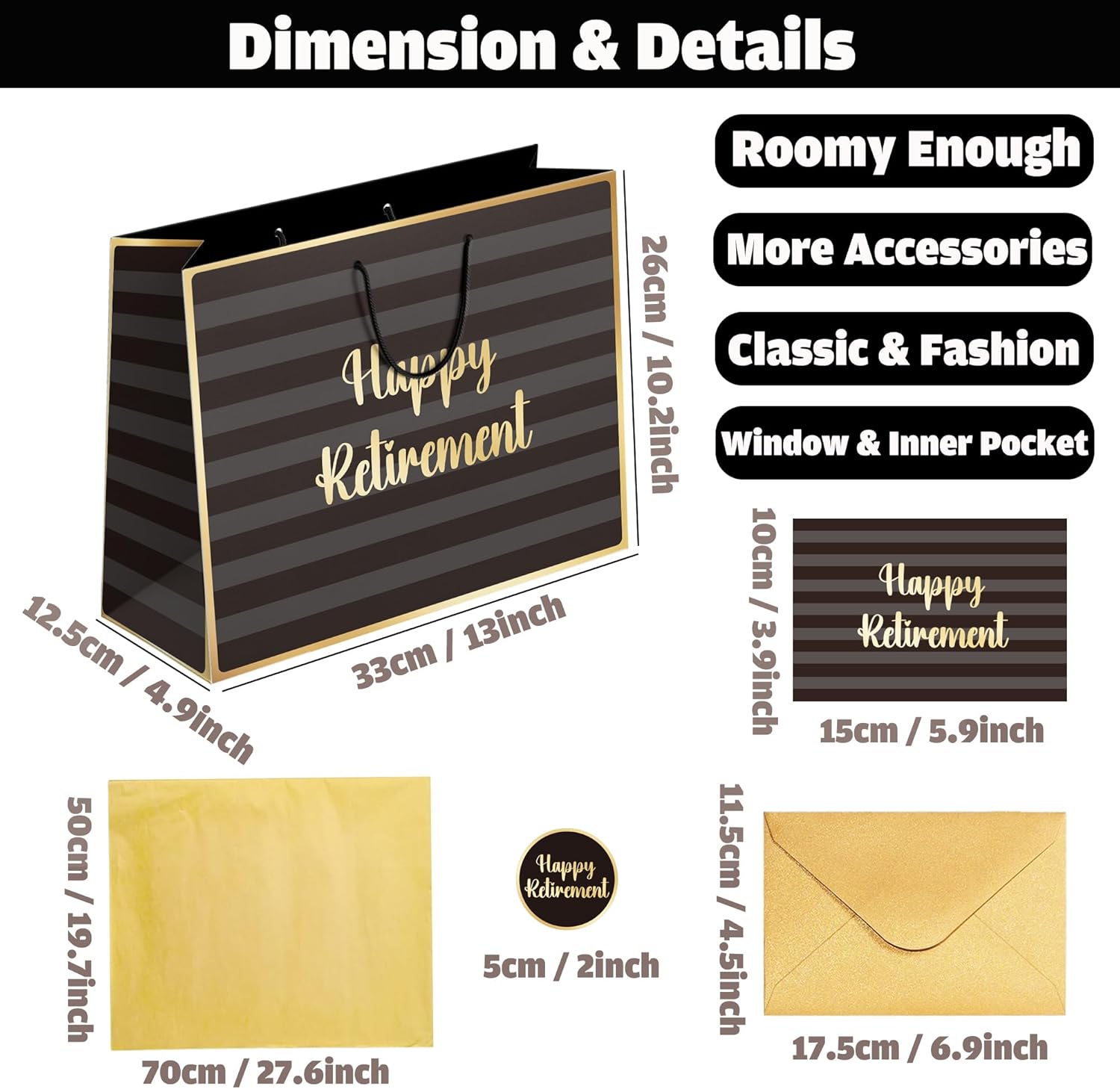 Pacchetto: riceverai 1 sacchetto regalo per la pensione + 3 carte veline dorate + 2 adesivi per la pensione + 1 carta di pensione con busta. Soddisfa tutte le tue esigenze di confezione regalo e lascia un'impressione profonda. Borsa regalo per la pensione: la stampa UV sulle strisce nere e grigie, la goffratura dorata per la scritta "Happy Retirement" e le strisce sui bordi garantiscono un look classico e alla moda. All'interno del sacchetto regalo è presente uno scomparto per busta e biglietto di auguri, che aggiunge un tocco celebrativo. Il retro trasparente del sacchetto regalo per la pensione ti consente di mostrare i tuoi squisiti regali attraverso la finestra di visualizzazione. Materiale: il sacchetto regalo per la pensione è realizzato in cartone da 300 g/m², ha manici in cotone nero e una base rinforzata, che lo rendono abbastanza robusto da trasportare i tuoi regali. La superficie è rivestita con pellicola in PVC trasparente, che rende la borsa impermeabile e resistente ai colori. La combinazione di nero e oro conferisce ai tuoi regali un aspetto alla moda ed elegante ed esprime il tuo amore speciale. Grandi dimensioni: la dimensione del sacchetto regalo per la pensione è L 33 x P 12,5 x A 26 cm, abbastanza grande per trasportare regali per la pensione come giocattoli, libri, puzzle, giochi da tavolo, materiali artistici, attrezzature sportive e dispositivi elettronici. La dimensione della carta di pensionamento è L 15 x H 10 cm quando piegata (L 15 x H 20 cm quando aperta), l'adesivo rotondo per la pensione ha un diametro di 5 cm e la dimensione della carta velina dorata è L 70 x L 50 cm Design unico: vogliamo mostrare un atteggiamento semplice ed elegante nei confronti della vita piuttosto che abbagliante. La striscia grigio nero rappresenta una giornata semplice, il colore oro metallizzato di "Happy Retirement" significa che dobbiamo vivere con eleganza ogni giorno anche se è semplice. Questi sono i nostri migliori auguri per ciascuno dei nostri clienti