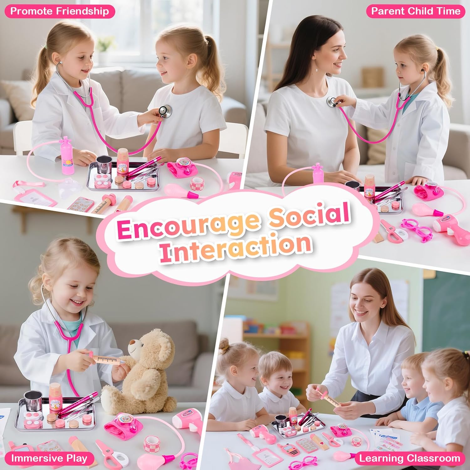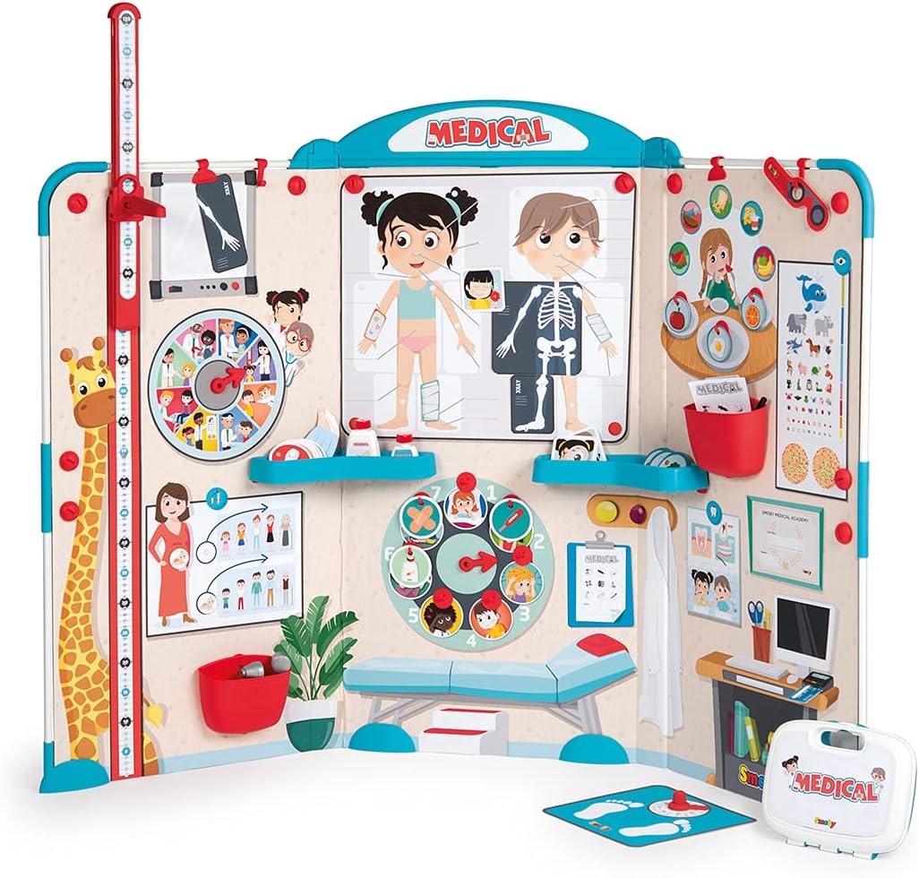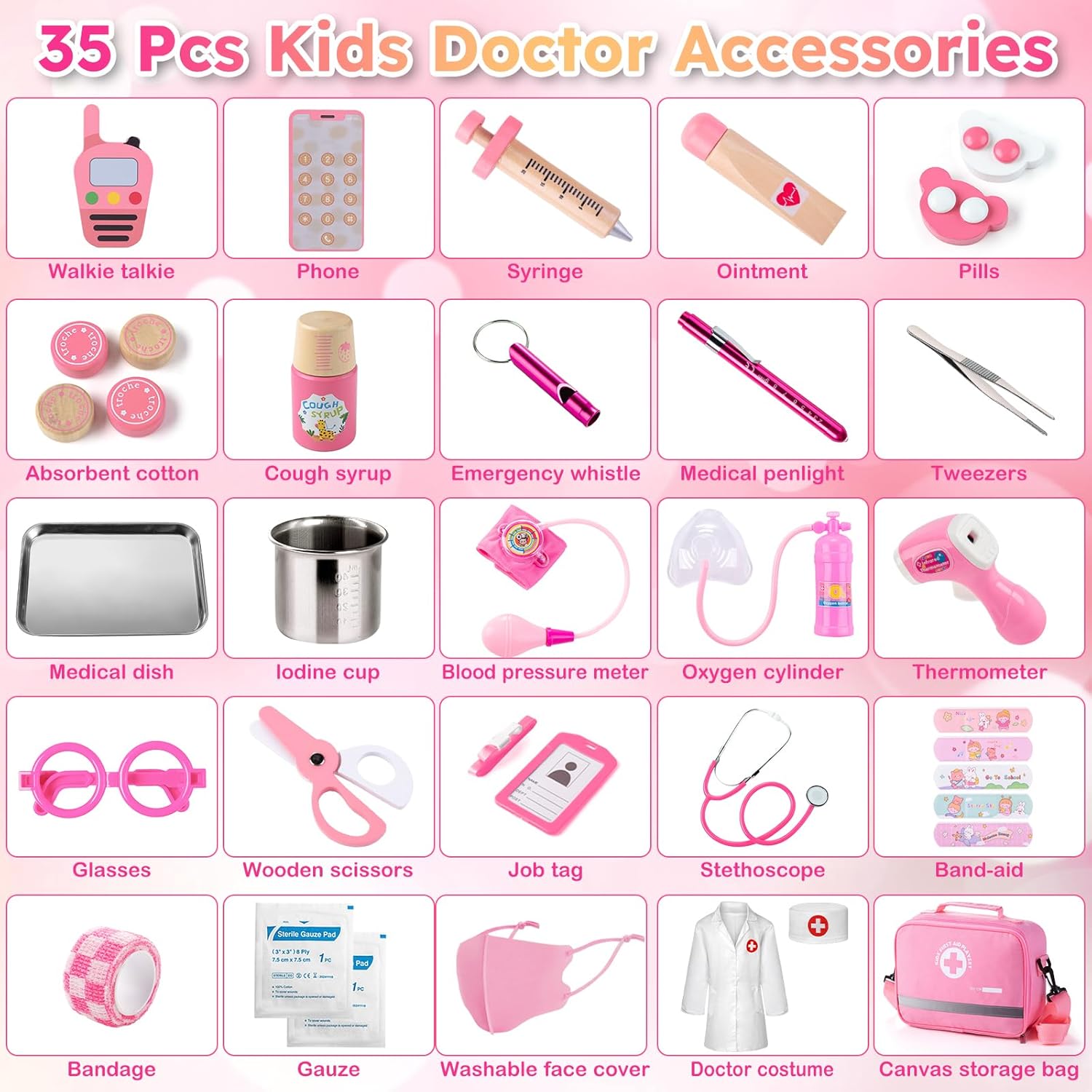 Valigetta Dottore Bambini: Il nostro kit medico giocattolo include camici e cuffie da dottore, stetoscopi iperrealistici, vassoi in acciaio inox, siringhe in legno sicure, pillole finte, telefoni giocattolo, walkie-talkie, kit per fasciature, mascherine pediatriche e accessori. Progettato per bambini 3-6 anni, ogni dettaglio è rifinito con cura. Gioco di Ruolo Dottore e Infermiera: Stimola l'immaginazione e sviluppa competenze multiple: i bambini indossano camici bianchi, usano stetoscopi professionali per visitare "pazienti" imparando l'anatomia; affinano la coordinazione occhio-mano con iniezioni e fasciature simulate; coltivano empatia e senso di responsabilità curando i "pazienti". Amplia anche le conoscenze mediche! Sicurezza Assoluta: Priorità alla sicurezza: componenti plastiche in ABS premium, parti in legno levigate senza schegge, strumenti metallici con bordi arrotondati. Ogni accessorio supera test di resistenza per uso intensivo. Offre un'esperenza medica realistica e sicura. Valigetta Portatile Pratica: Include una borsa medica in tela rinforzata, leggera e resistente. Contiene tutti gli accessori. Maniglia ergonomica per trasporto autonomo. A casa, all'asilo o in viaggio, l'avventura medica inizia ovunque! Regalo Perfetto per Piccoli Dottori: Confezione regalo premium, ideale per compleanni, Festa dei Bambini e Natale. Regalo significativo per le feste di fine asilo. Ottimo strumento didattico per attività genitore-figlio. I bambini acquisiscono conoscenze, gioia e crescita impersonando "angeli in camice bianco" - creando ricordi preziosi!