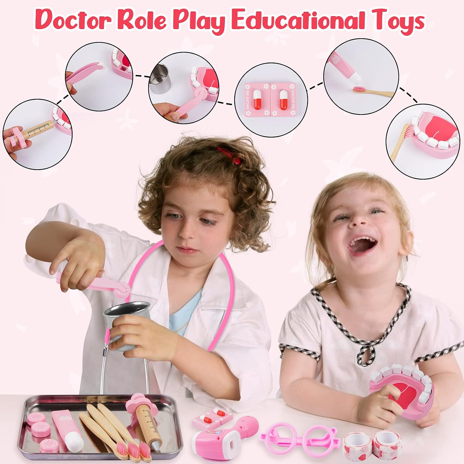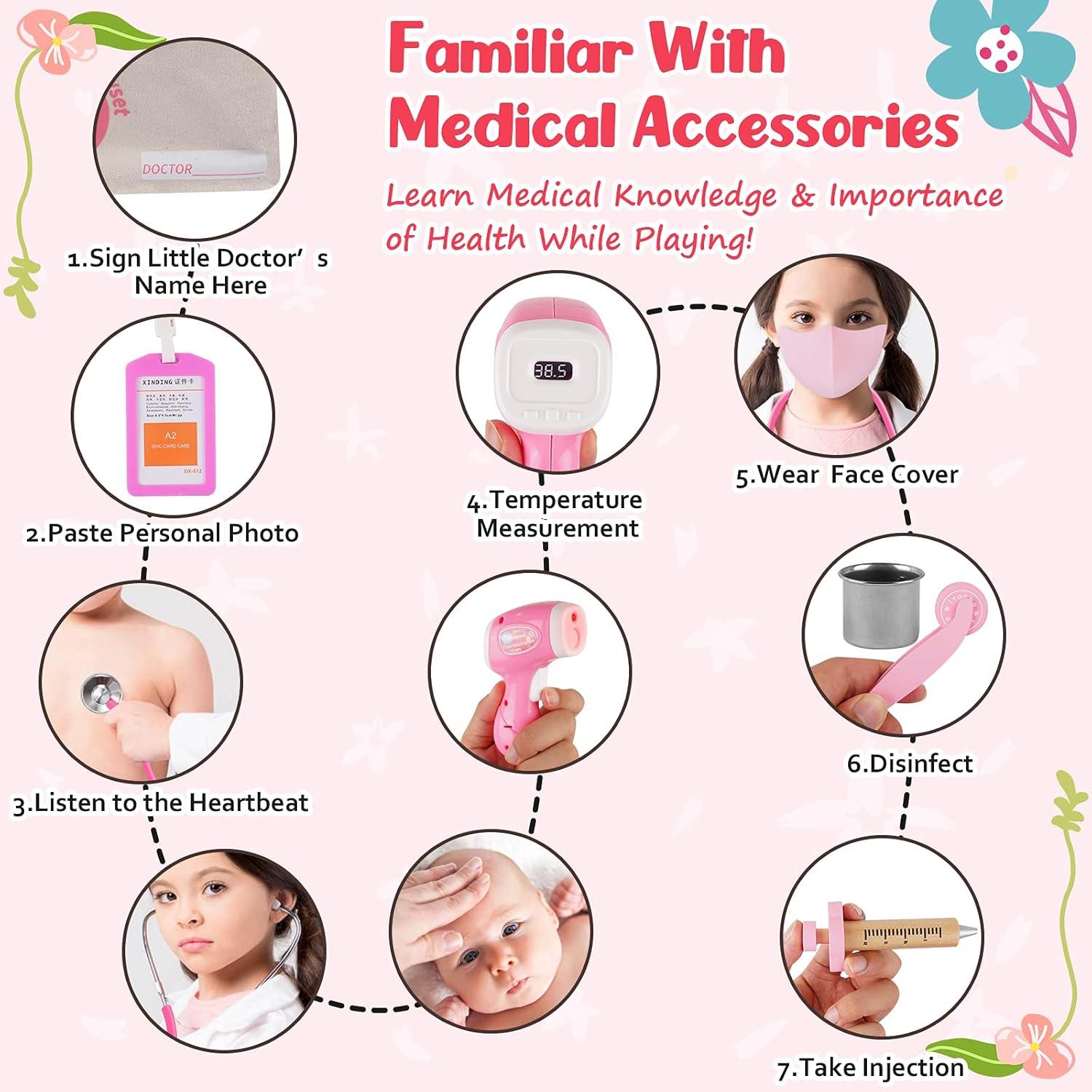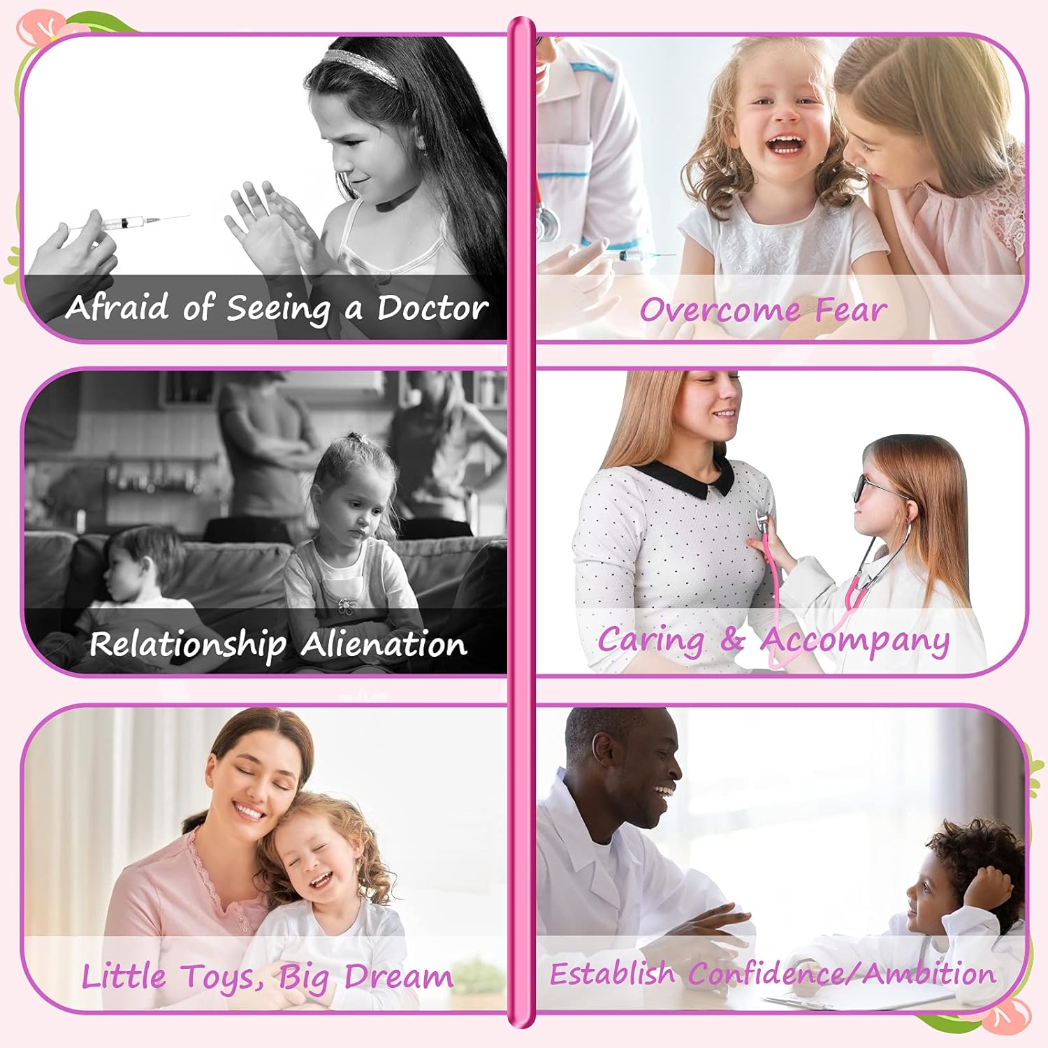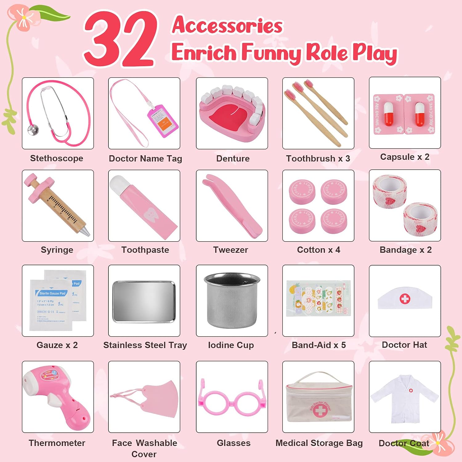 👩⚕【Abbondante Kit Dottore Bambini】Completo di 32 pezzi finta attrezzatura medica da gioco, contiene costume da dottore/cappello, stetoscopio, vassoio in acciaio inossidabile/tazza di iodio, siringa/pinzette/capsule/cotone, bicchieri, termometro, copertura per il viso lavabile, bende colorate casuali e vari accessori realistici per la cura dei denti per la pulizia e il trattamento. 💉【Kit Medico Giocattolo Educativo】Un modo divertente per aspiranti giovani medici di ispirare l'immaginazione e conoscere il corpo umano attraverso il gioco di ruolo medico/paziente. Riduci le paure dei bambini associate al vedere un medico e insegna loro le pratiche sanitarie. Aiuta a sviluppare l'espressione creativa, le abilità sociali, la fiducia quando si fa finta di giocare con la famiglia, gli amici. 💊【Design Robusto e Adatto ai Bambini】Teniamo a mente la qualità di lunga durata! I kit medico certificati di sicurezza al 100% non contengono BPA/prodotti chimici nocivi. Il bordo liscio in legno/plastica/acciaio inossidabile e le parti di dimensioni adeguate sono sicure per i bambini durante il gioco. La borsa in tessuto morbido è resistente per la manipolazione. Abituare i bambini al "vero mondo dei dottori" in modo giocoso. 📝【Facile da Riporre / Trasportare】Kit gioco dottore per bambini con robusta borsa medica dal design con cerniera, il medico junior può firmare il proprio nome su / imballare tutti gli accessori e portarli ovunque. Nel processo di gioco coltiva grandi abitudini di conservazione dei bambini. Tela lavabile Il materiale della borsa del medico mantiene il gioco di ruolo pulito e igienico! 🎁【Idea Regalo Perfetta】Il valigetta dottore bambini include costume da dottore/cappello/custodia medico/giocattoli sarà un ottimo regalo per i bambini dai 3 anni in su. Il gioco di simulazione dottore aiuta a ispirare l'immaginazione e far crescere l'ambizione. I bambini giocattolo da dottore che completano il compleanno, la festa, le vacanze e il Natale dei bambini aggiungendo tanto divertimento continuo!