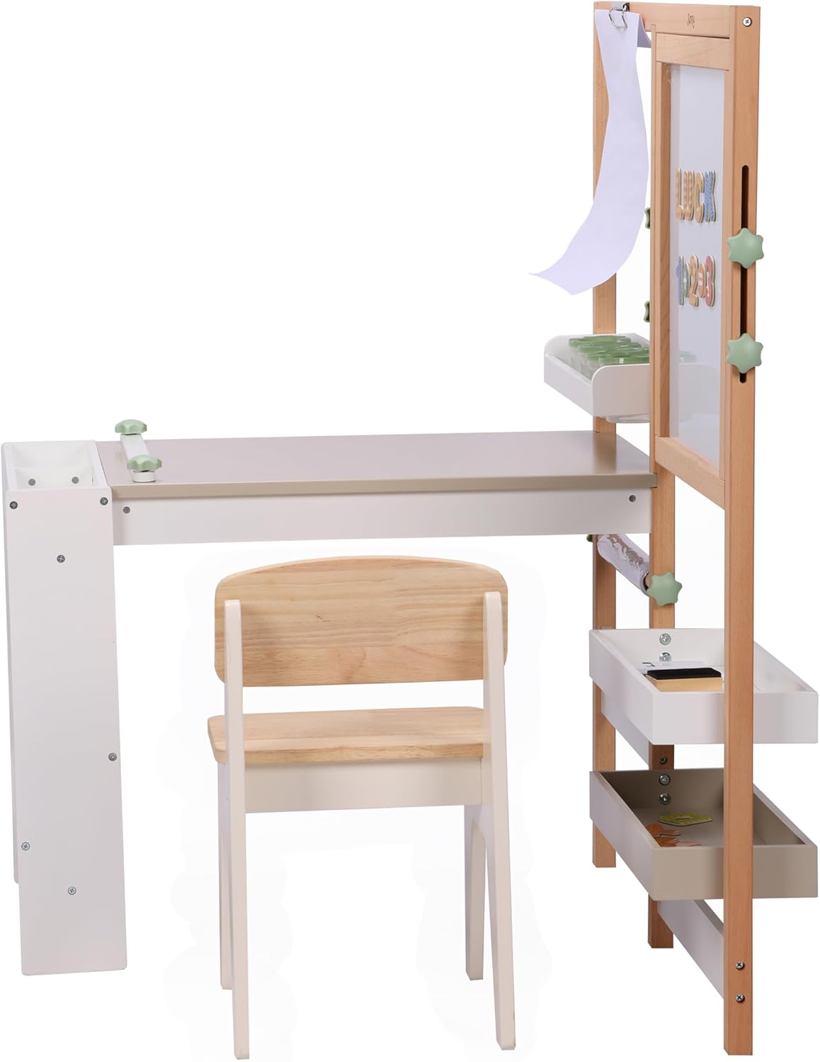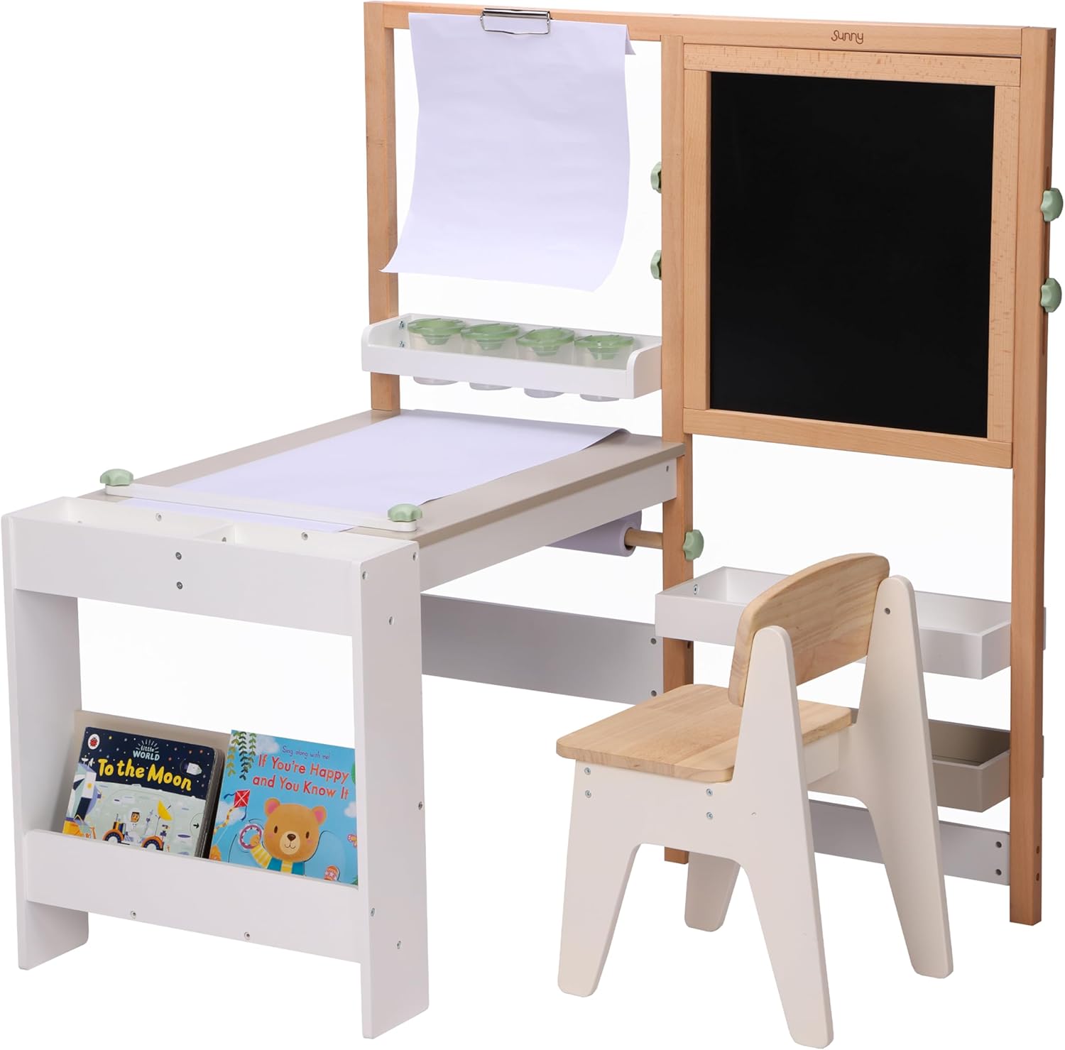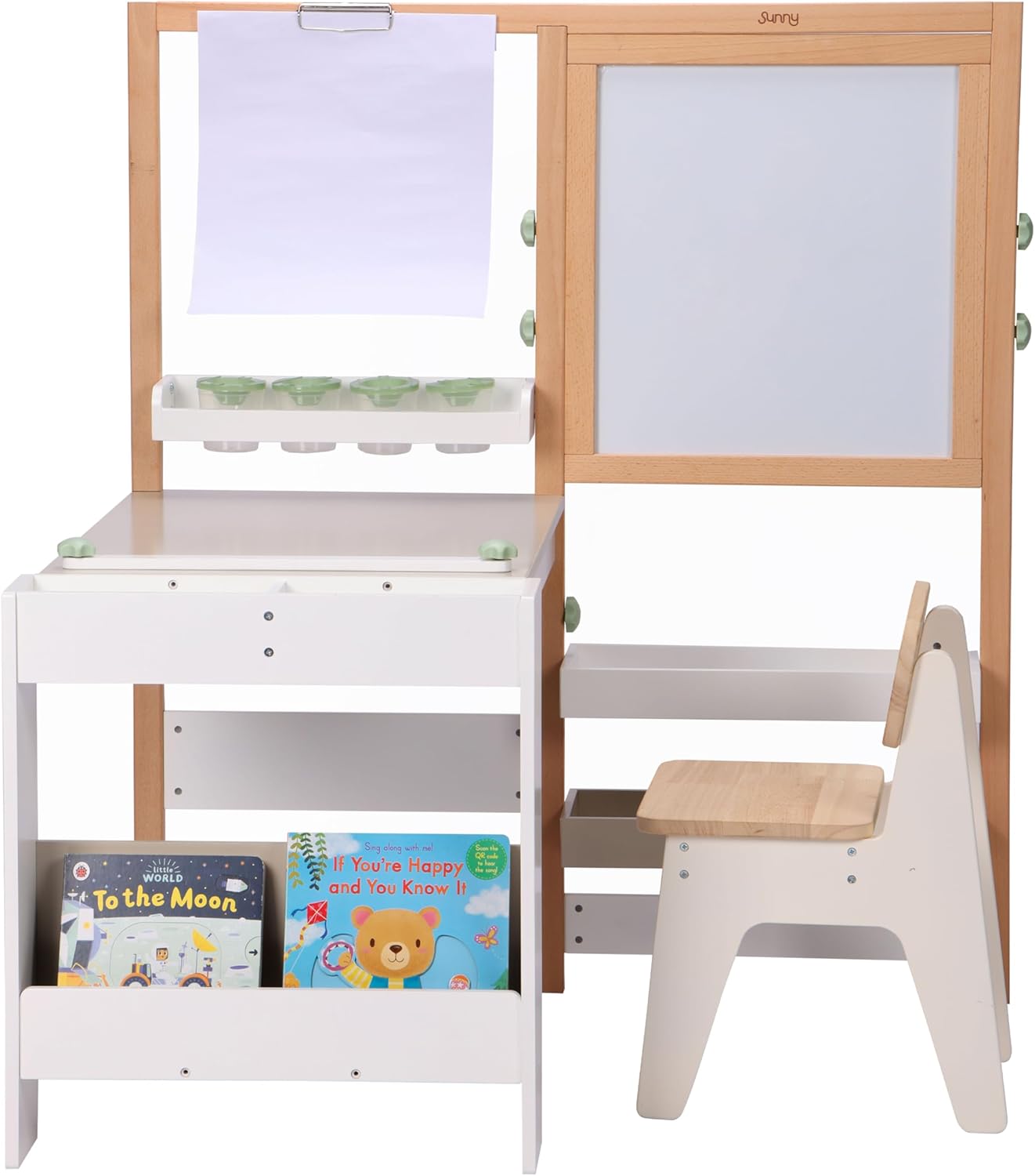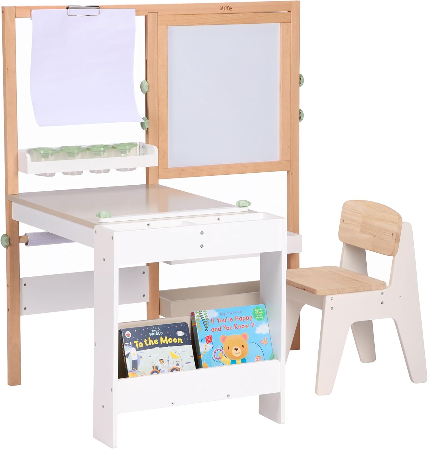 TAVOLO MULTIFUNZIONALE PER DISEGNARE E CREARE CON SEDIA: Sunny Olivia è un prodotto creativo e versatile per bambini: combina un ampio piano di lavoro con una lavagna bianca, una lavagna per gessetti e un rotolo di carta. In questo modo, i piccoli artisti possono dipingere, creare, disegnare o scrivere in qualsiasi momento e dare libero sfogo alla loro fantasia. DIVERTIMENTO CREATIVO CON MOLTI ACCESSORI: grazie alla lavagna bianca e alla lavagna a gesso, ogni giorno nascono nuove opere d'arte, mentre il rotolo di carta garantisce disegni infiniti. I portabicchieri sul piano di lavoro tengono penne, pennelli e gessetti sempre a portata di mano. Include pratici accessori come rotolo di carta, pennarelli, gessetti, cancellino e magneti. SPAZIO DI STOCCAGGIO INTELLIGENTE E LIBRERIA: sotto il tavolo c'è spazio sufficiente per riporre materiale per il bricolage, giochi o libri preferiti. In questo modo tutto rimane ordinato, ben organizzato e sempre a portata di mano: l'ideale per lavorare in modo creativo senza caos. STABILE, RESISTENTE E A MISURA DI BAMBINO: Realizzato in legno di faggio certificato FSC al 100% proveniente da foreste gestite in modo responsabile, Sunny Olivia convince per la sua durata e il suo design senza tempo, che si adatta a qualsiasi sala giochi o soggiorno. La sedia inclusa nel set è comoda e stabile, adatta a bambini dai 3 anni in su (carico massimo tavolo 25 kg, sedia 50 kg). Dimensioni: circa 88 x 71 x 100 cm, altezza seduta circa 46 cm. SUNNY: Divertiti con Sunny. Che si tratti di giocare nella propria casetta, nella sabbiera o in un vero tipi indiano, Sunny realizza i sogni dei bambini. Il gioco di ruolo permette ai bambini di dare libero sfogo alla loro creatività e di sviluppare le loro abilità sociali in modo divertente. Crea un'infanzia indimenticabile con Sunny.