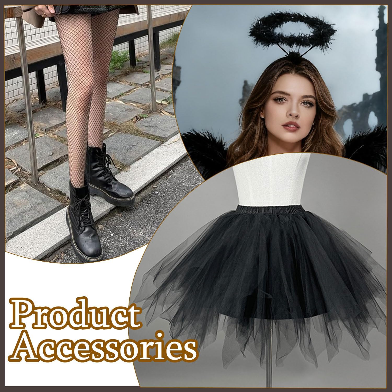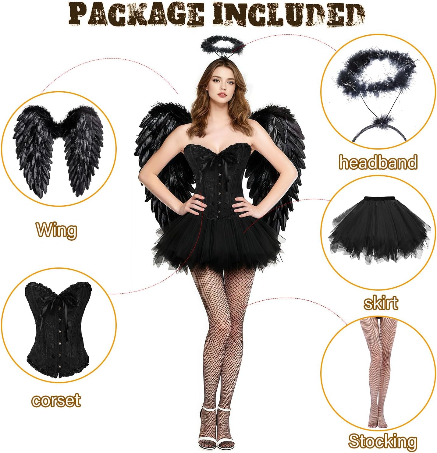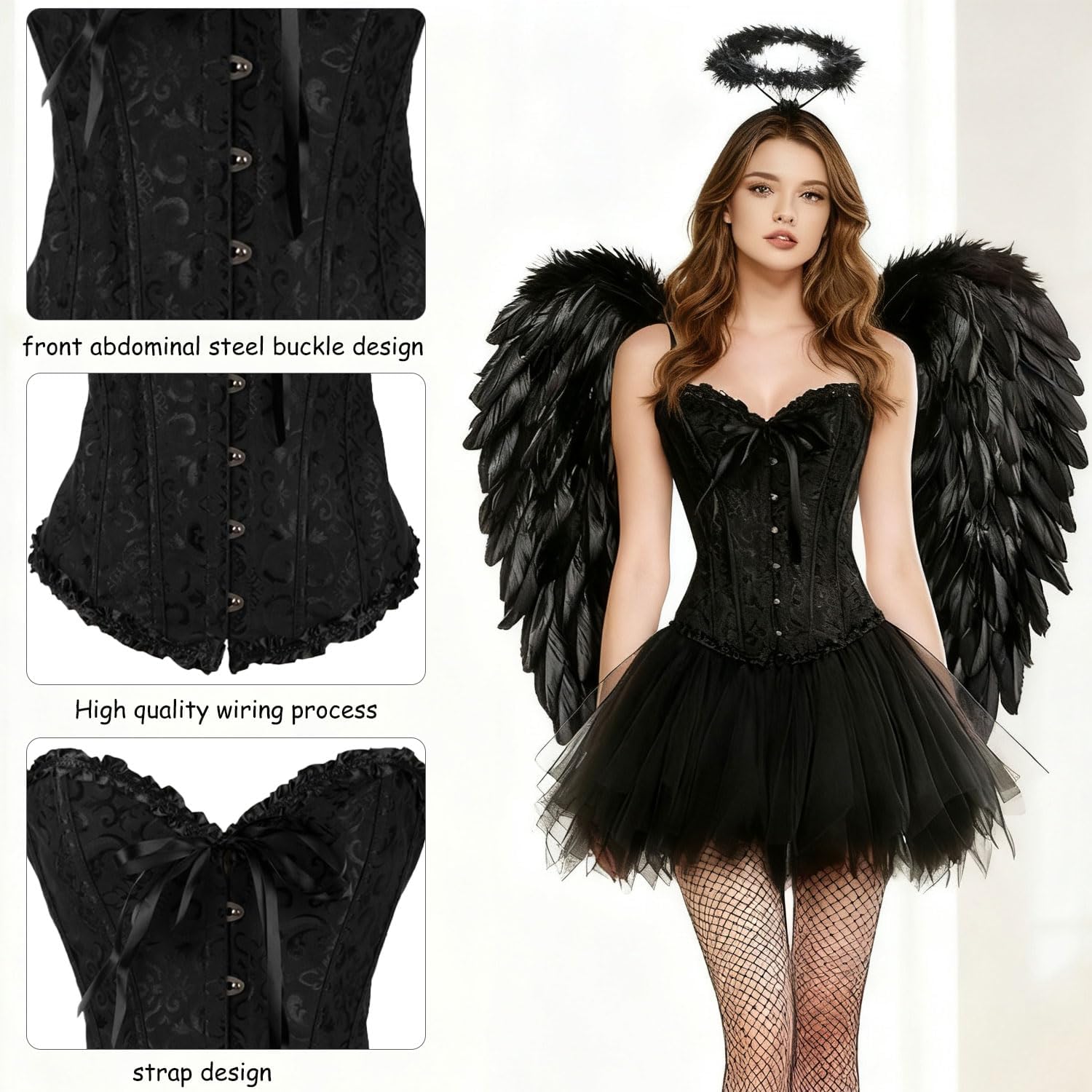 Schönes Halloween-Kostüm mit Engelsflügeln, Korsett-Top, Tüllrock und Heiligenschein. Sieht auffällig und elegant aus, ideal für Karneval oder Halloween. Sitzt gut und macht Eindruck – toll für Damen, die etwas Besonderes suchen.