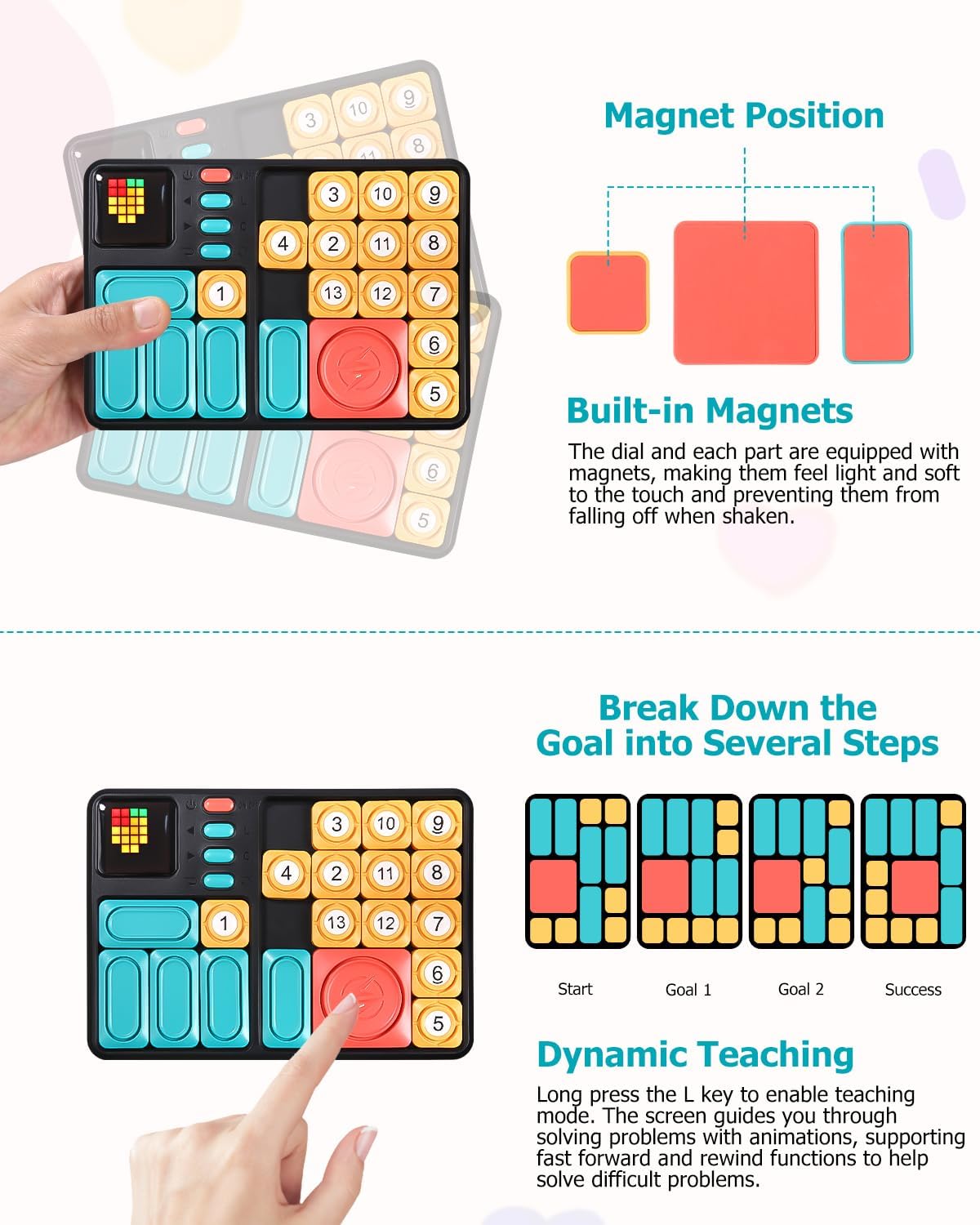 Puzzle gioco blocco scorrevole: con oltre 500 livelli che ti sfidano e due modalità tra cui scegliere: modalità tutorial e modalità sfida; il livello di difficoltà varia da facile a difficile. Porta il tuo cervello in punta di testa e accetta la sfida! Design magnetico unico: la console da gioco portatile a puzzle adotta un design magnetico che garantisce una presa comoda durante il gioco e impedisce ai pezzi del puzzle di cadere facilmente, consentendo ai giocatori di godersi il divertimento del gioco al massimo. Effetti sonori ben congegnati: la console da gioco magnetica scorrevole a puzzle è dotata di altoparlanti integrati che rilevano automaticamente se il puzzle è stato risolto con successo. Uno speciale effetto di benvenuto apparirà sullo schermo e dagli altoparlanti emetterà un effetto sonoro della vittoria. Allenamento logico: i bambini devono usare la loro capacità di pensiero e ragionamento per risolvere i puzzle predefiniti, stimolando così le loro capacità di pensiero e di inversione rafforzando la loro concentrazione, pazienza e iniziativa. Regalo ideale: nessuno rifiuterebbe una console da gioco portatile scorrevole con diverse opzioni di gioco. È anche un regalo ideale per gli appassionati di puzzle, dimensioni compatte, facile da trasportare e adatto per bambini, amici e genitori.