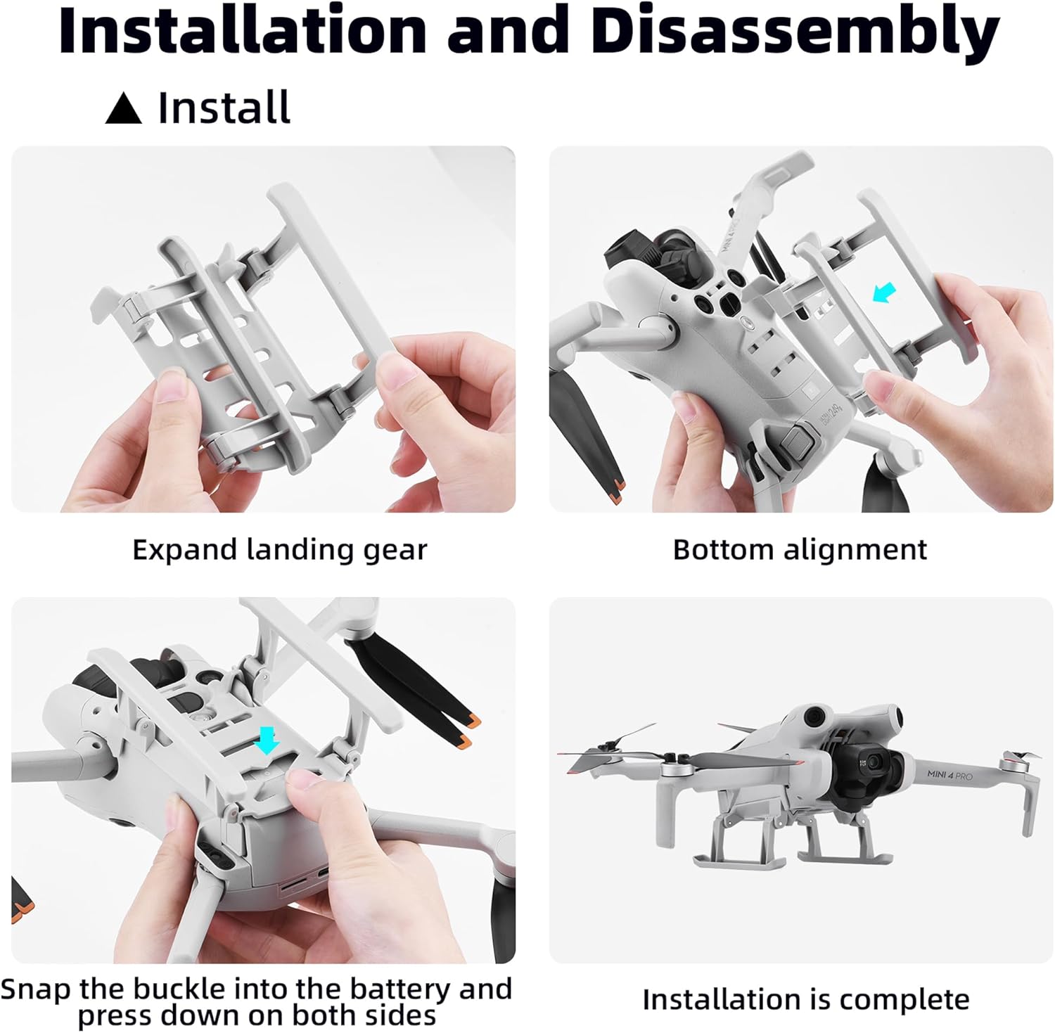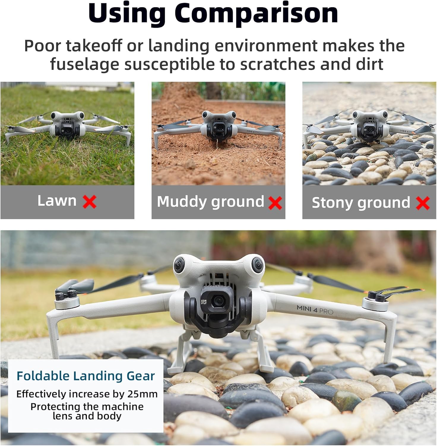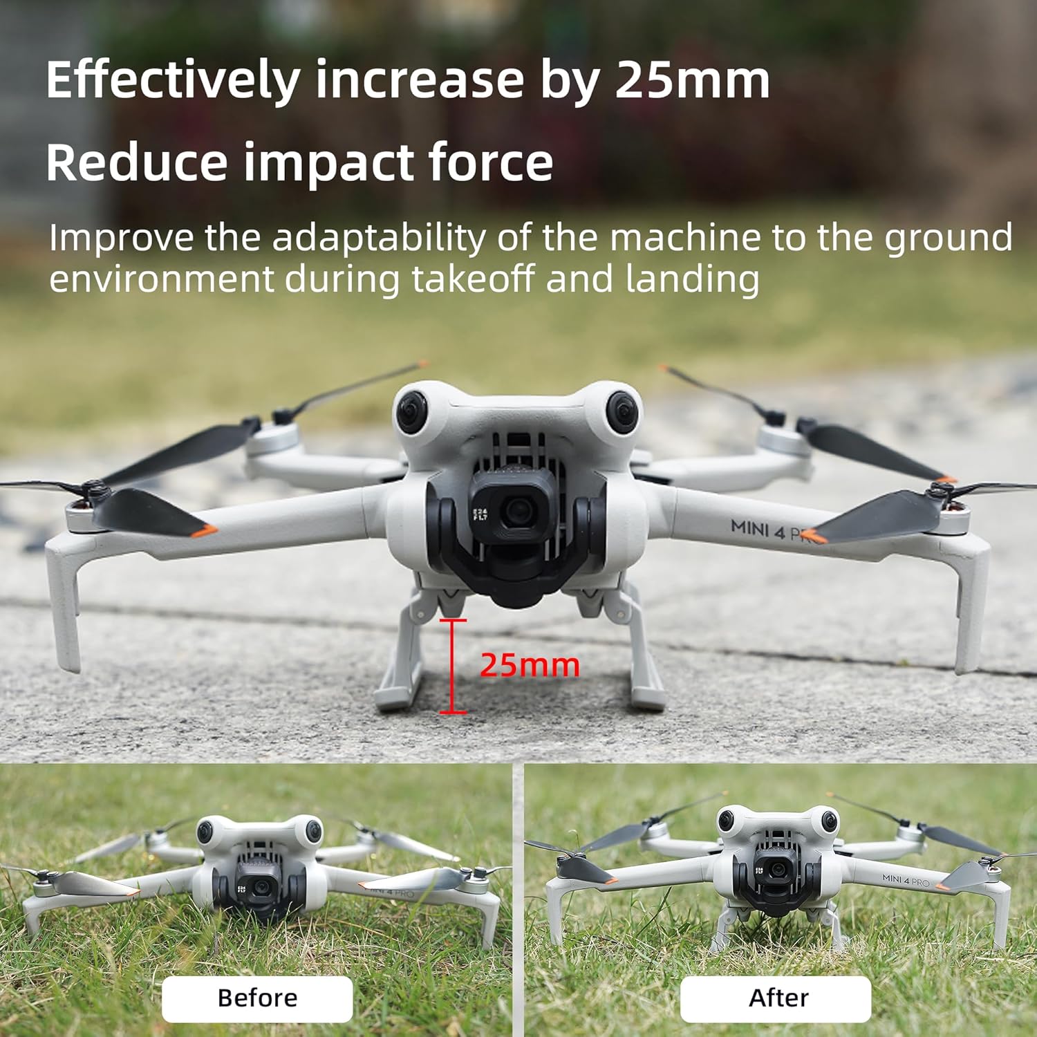 ➤Protezione migliorata: il carrello di atterraggio pieghevole aumenta efficacemente l'altezza del drone di 25 mm, proteggendo la lente e il corpo della macchina da potenziali graffi e sporco durante il decollo e l'atterraggio. ➤Riduzione dell'impatto: grazie alla sua capacità di ridurre la forza d'impatto, il carrello di atterraggio riduce al minimo il rischio di danni al drone, garantendo un'esperienza di atterraggio più fluida. ➤Compatibilità perfetta: il carrello di atterraggio migliora l'adattabilità del drone a vari ambienti terrestri, consentendo decolli e atterraggi stabili anche in condizioni difficili. ➤Leggero e discreto: nonostante la sua funzionalità aggiuntiva, il carrello di atterraggio mantiene una struttura leggera che non compromette le prestazioni di volo del drone. ➤Facile installazione e smontaggio: grazie al design a sgancio rapido, il carrello di atterraggio può essere installato o rimosso senza sforzo, offrendo praticità agli utenti.