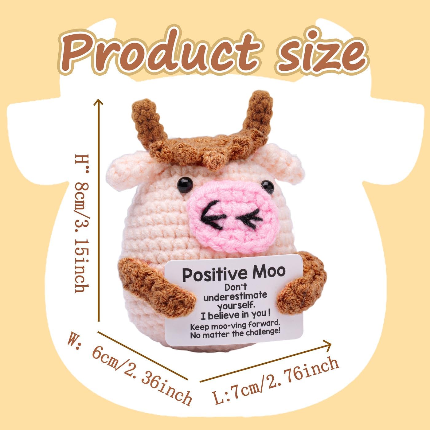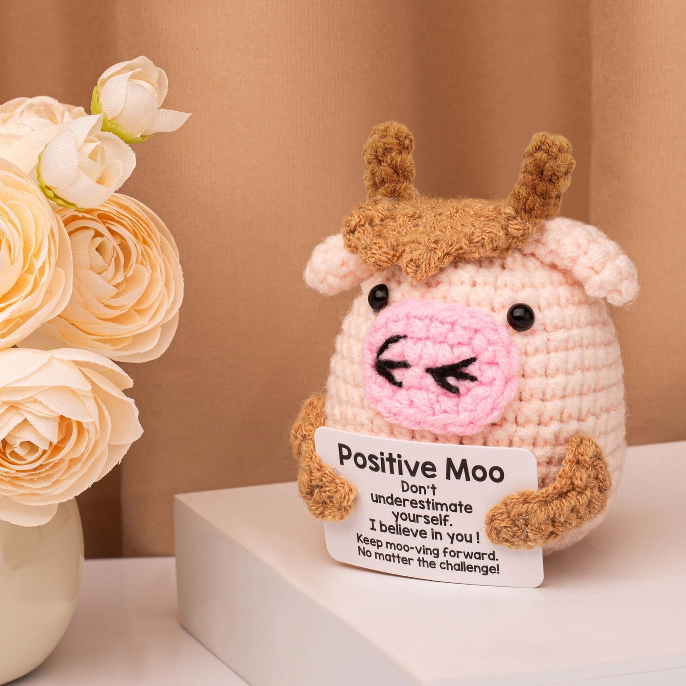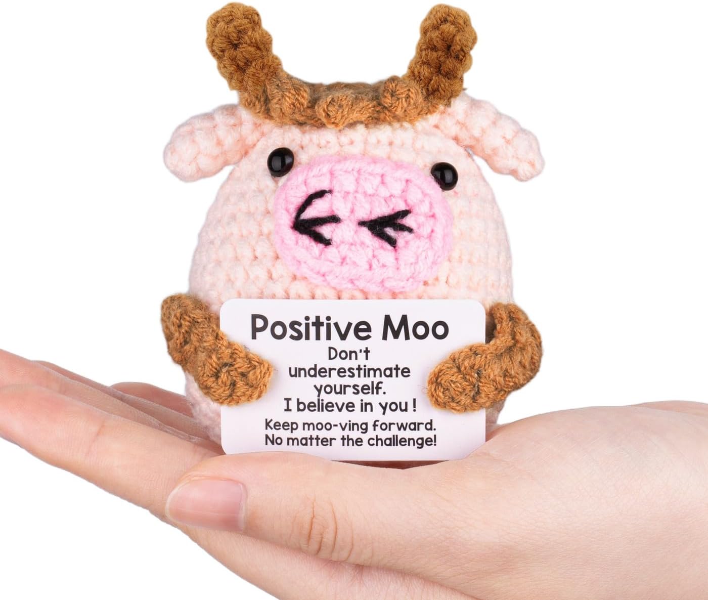 Lucky Crochet Moo: Moo ha una silhouette rotonda, con il corpo principale intrecciato in lana rosa chiaro. Le corna marroni sulla testa, sulle orecchie e sulle braccia formano un netto contrasto con il corpo principale rosa chiaro, aggiungendo una sensazione a strati. Sul caratteristico naso rosa, le narici sono evidenziate con linee nere, un aspetto giocoso. Due perle nere fungono da occhi e infondono alla bambola un'espressione vivace. Parole motivazionali: sulla carta bianca con il supporto del Positive Moo c'erano le parole "Positive Moo" e parole incoraggianti: "Non sottovalutarti". Ho fiducia in te! » Continua a muggire: vai avanti. Qualunque sia la sfida! Trasmette energia positiva che è edificante e autoaffermante. Le parole sulla carta ti ispirano ad affrontare le sfide della vita con fiducia e a perseguire i tuoi sogni. Regali positivi adatti a varie occasioni: possono essere usati come decorazione d'interni per illuminare lo spazio abitativo. L'animale lavorato a maglia Positive Moo è un compagno premuroso, che trasmette emozioni, calore, benedizioni e incoraggiamento. È adatto per essere regalato a donne, uomini, amici, colleghi, insegnanti e studenti, permettendo loro di sentire le tue benedizioni e sostenere il lavoro a maglia fatto a mano all'uncinetto: Moo è lavorato a mano punto per punto con lana e aghi all'uncinetto di alta qualità. Morbido e delicato sulla pelle, piacevole al tatto. Scegli adesso il tuo animale lavorato a maglia e lascia che questa bellezza ti accompagni. Consigli e servizi: Ogni prodotto è realizzato a mano. Ogni animale all'uncinetto è unico e può variare nell'aspetto. Se hai domande sui nostri prodotti, contattaci e ti daremo una risposta completa