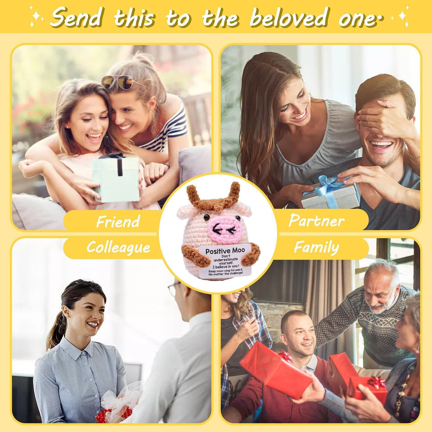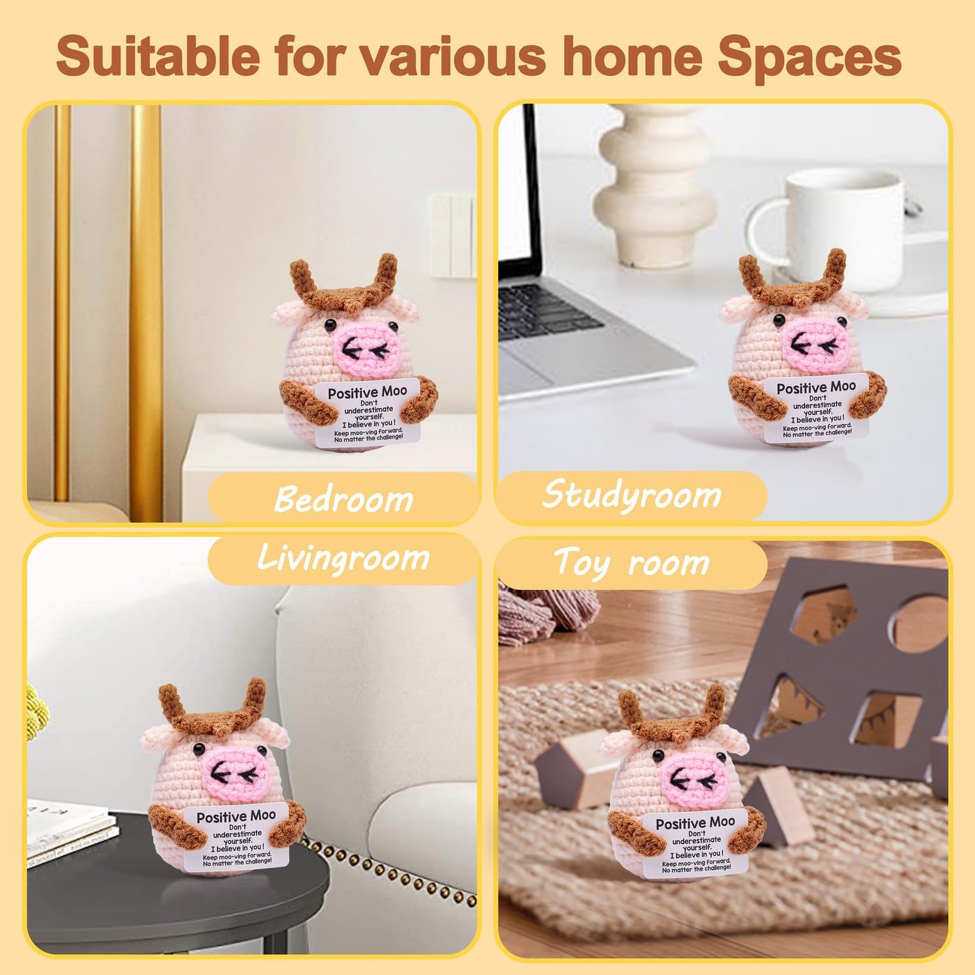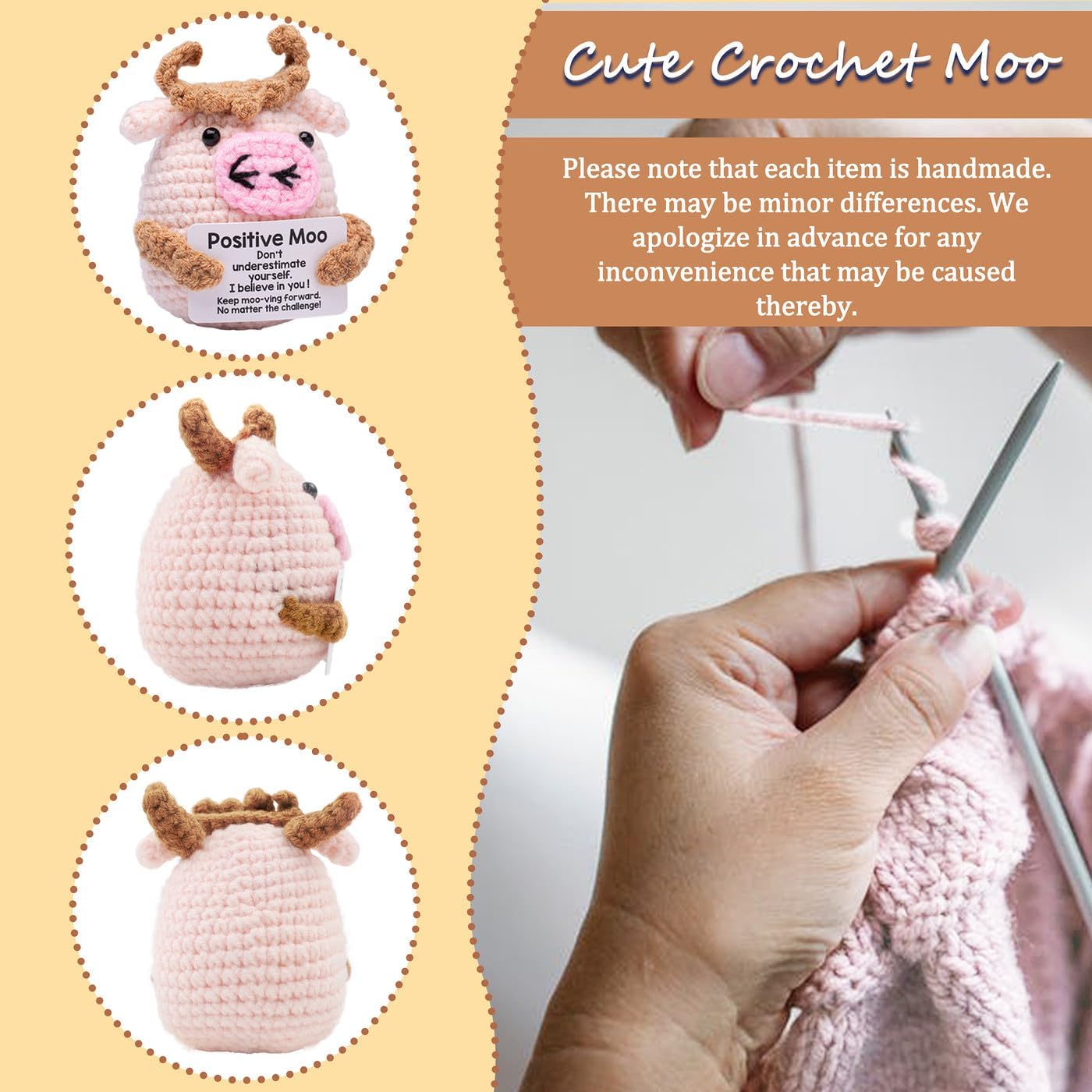 Lucky Crochet Moo: Moo ha una silhouette rotonda, con il corpo principale intrecciato in lana rosa chiaro. Le corna marroni sulla testa, sulle orecchie e sulle braccia formano un netto contrasto con il corpo principale rosa chiaro, aggiungendo una sensazione a strati. Sul caratteristico naso rosa, le narici sono evidenziate con linee nere, un aspetto giocoso. Due perle nere fungono da occhi e infondono alla bambola un'espressione vivace. Parole motivazionali: sulla carta bianca con il supporto del Positive Moo c'erano le parole "Positive Moo" e parole incoraggianti: "Non sottovalutarti". Ho fiducia in te! » Continua a muggire: vai avanti. Qualunque sia la sfida! Trasmette energia positiva che è edificante e autoaffermante. Le parole sulla carta ti ispirano ad affrontare le sfide della vita con fiducia e a perseguire i tuoi sogni. Regali positivi adatti a varie occasioni: possono essere usati come decorazione d'interni per illuminare lo spazio abitativo. L'animale lavorato a maglia Positive Moo è un compagno premuroso, che trasmette emozioni, calore, benedizioni e incoraggiamento. È adatto per essere regalato a donne, uomini, amici, colleghi, insegnanti e studenti, permettendo loro di sentire le tue benedizioni e sostenere il lavoro a maglia fatto a mano all'uncinetto: Moo è lavorato a mano punto per punto con lana e aghi all'uncinetto di alta qualità. Morbido e delicato sulla pelle, piacevole al tatto. Scegli adesso il tuo animale lavorato a maglia e lascia che questa bellezza ti accompagni. Consigli e servizi: Ogni prodotto è realizzato a mano. Ogni animale all'uncinetto è unico e può variare nell'aspetto. Se hai domande sui nostri prodotti, contattaci e ti daremo una risposta completa