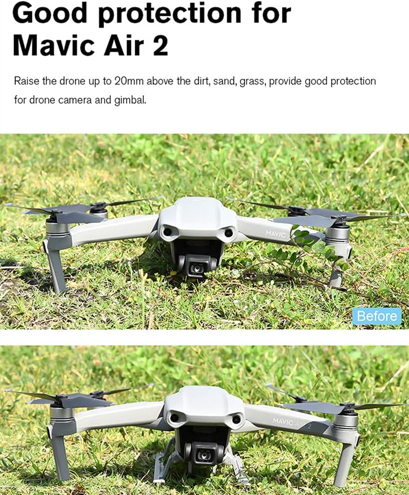 Questo carrello di atterraggio pieghevole è progettato appositamente for i droni Mavic Air 2 e Air 2S. Sollevare il drone fino a 20 mm (0,78 pollici) sopra lo sporco, la sabbia o l'erba, for garantire una buona protezione alla telecamera e al giunto cardanico del drone. Caratteristiche: design pieghevole, installazione rapida, si adatta perfettamente al corpo del drone, comodo e pratico. Speciale design pieghevole e a sgancio rapido, facile da installare e rimuovere. Leggero, solo 28,6 g, non comporta carichi pesanti for il drone. Progettazione di installazione non distruttiva: installazione e rimozione semplici e rapide, senza preoccuparsi di danneggiare il corpo del drone.