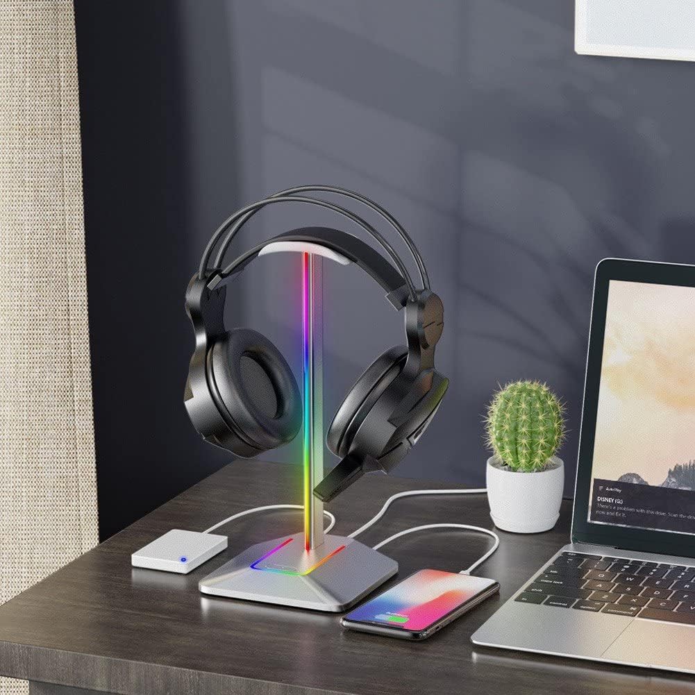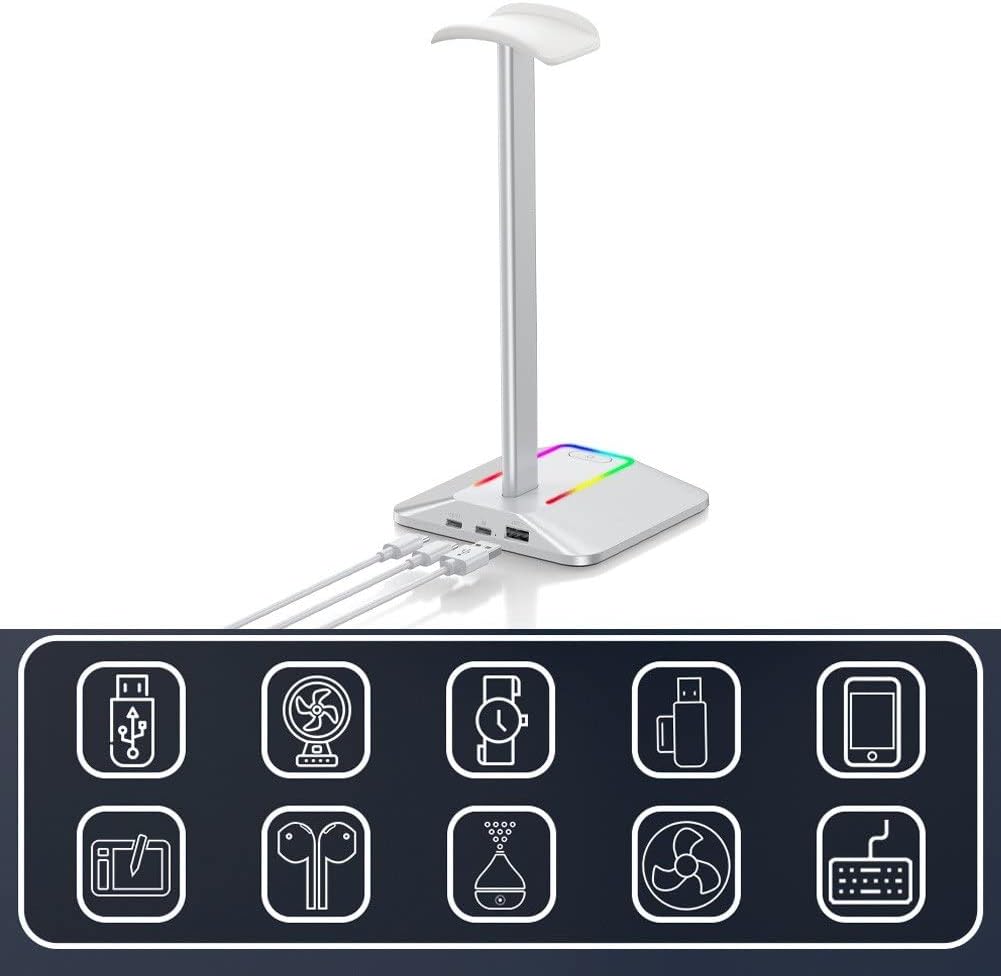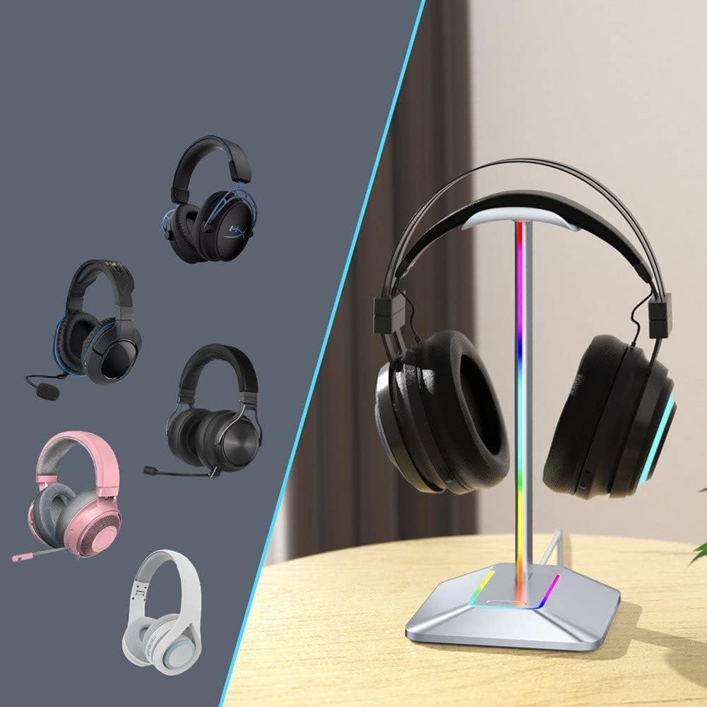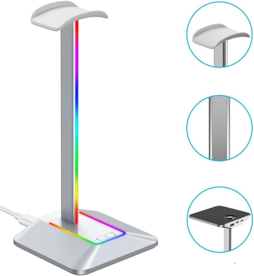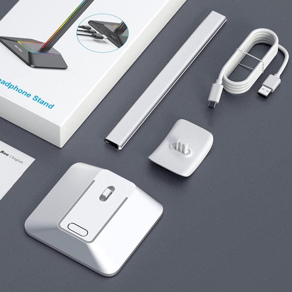 【Base di illuminazione RGB】 Il supporto per cuffie RGB offre 3 modalità di illuminazione e crea una fantastica atmosfera di gioco. L'interruttore tattile con impronta digitale consente di attivare e disattivare rapidamente l'effetto RGB. (Loop arcobaleno/Singolo colore statico/Modalità respirazione) 【Regali ideali per i giocatori】 Il resistente e fantastico supporto per cuffie W1 è un regalo ideale per i giocatori per amici e familiari. Robusto e pratico: realizzato in lega di alluminio e base in gomma ABS antiscivolo, il supporto per cuffie per laptop garantisce stabilità, proteggendo le cuffie dall'usura e mantenendo scrivania pulita e ordinata.