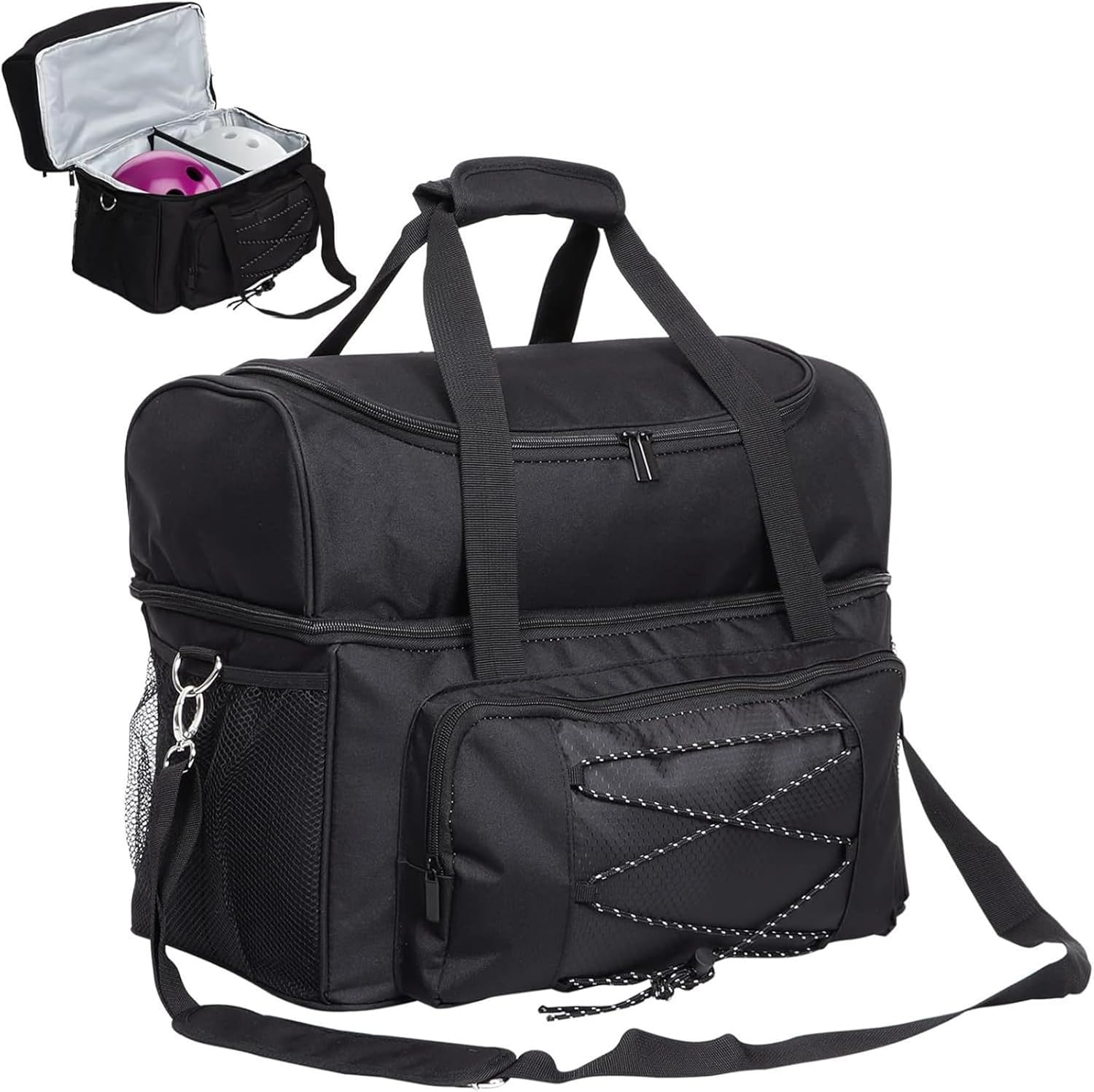 La tracolla imbottita regolabile e il manico imbottito offrono un comodo trasporto Lo scomparto superiore per scarpe può contenere un paio di scarpe fino a una taglia 46, e l'interno in PVC trasparente rende facile rimuovere le macchie La borsa da bowling portatile può contenere facilmente 2 palline da bowling, il rack per palline e il design imbottito del divisore protegge le palline da danni o impedisce che rotolino durante il trasporto Realizzato in tessuto Oxford, resistente all'acqua, pregevole fattura, è un bel giocatore di bowling per principianti o giocatori di bowling professionisti Il design aggiuntivo della tasca aumenta lo spazio di archiviazione, per riporre telefono, portafoglio, bottiglie d'acqua, asciugamani, occhiali