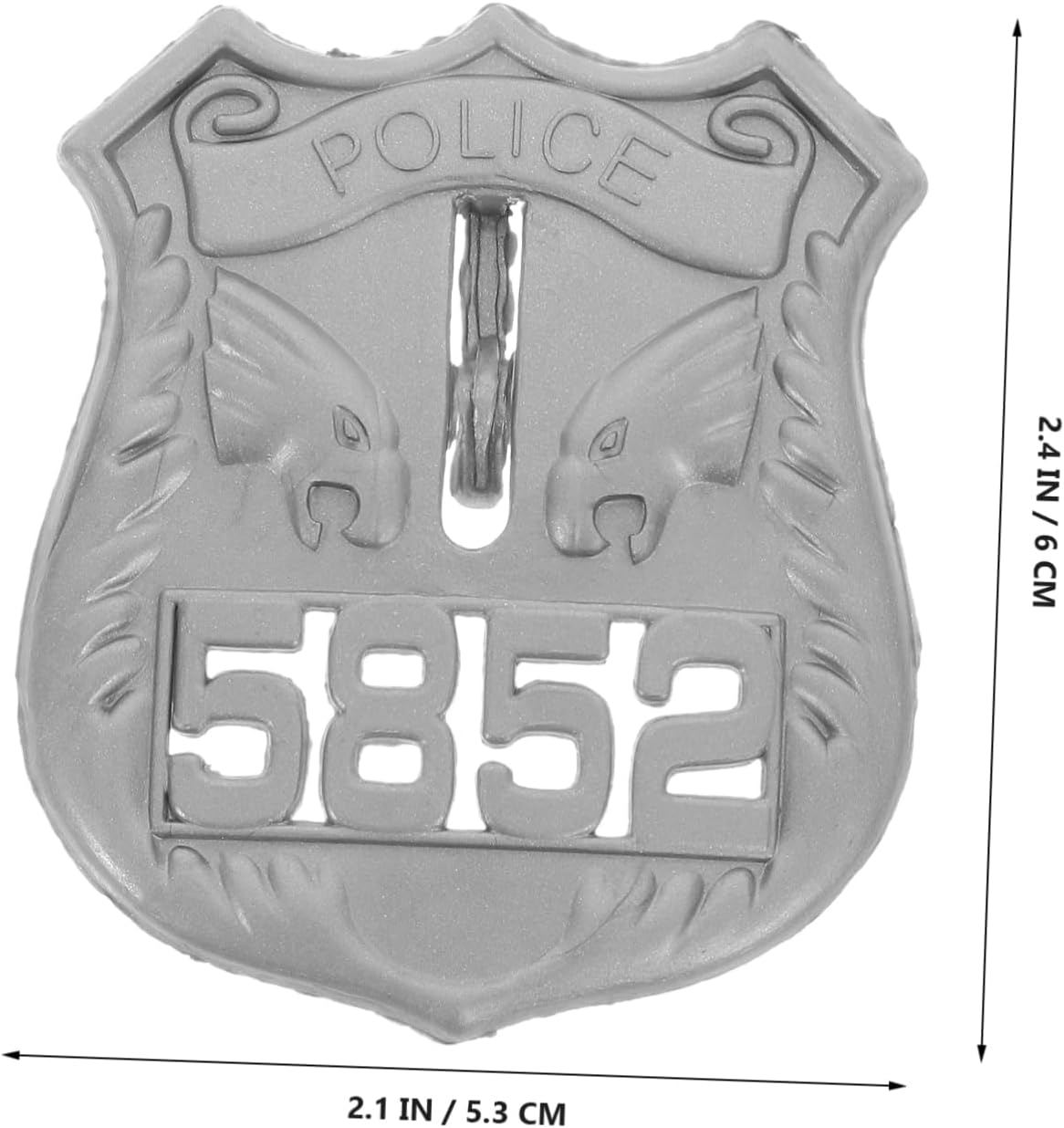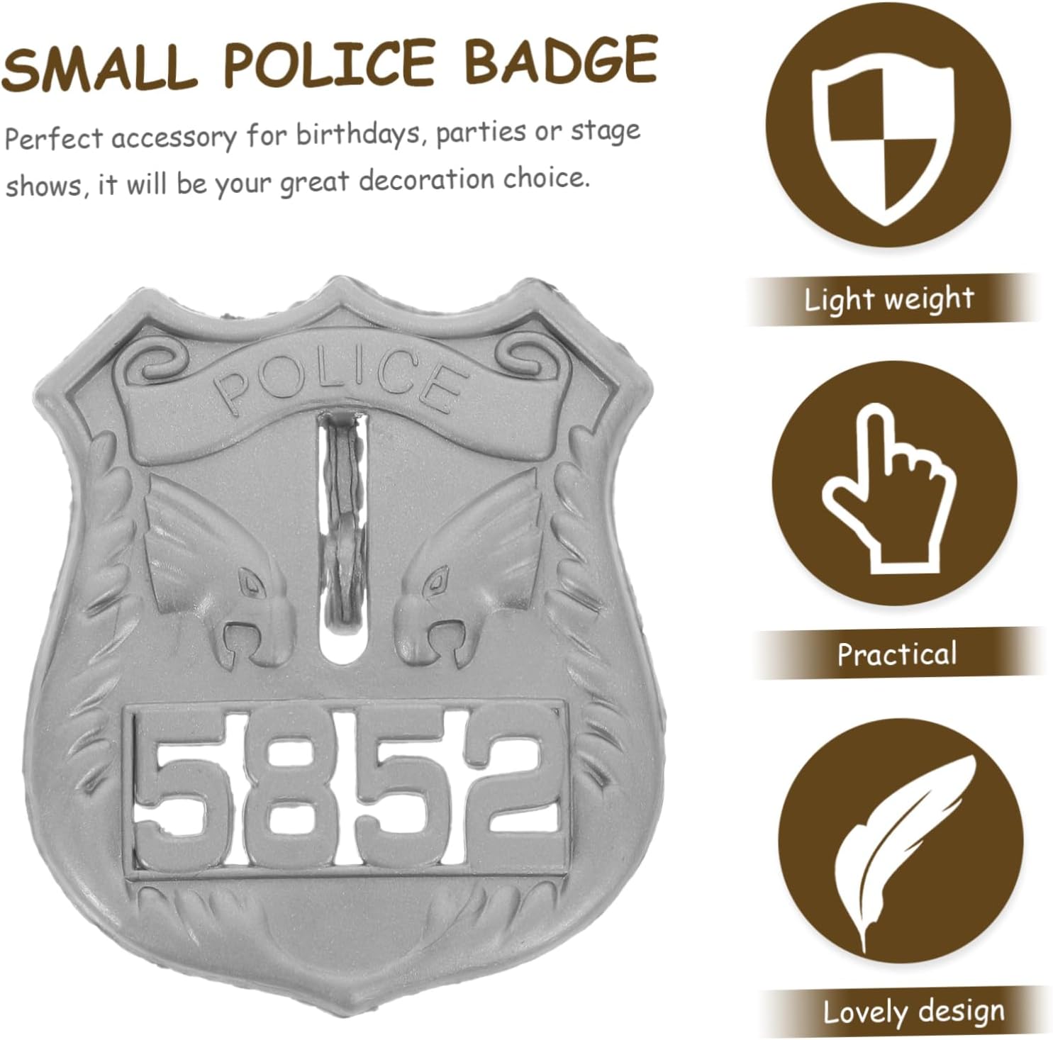 dei pacchetti 15 decorazioni per badge Caratteristiche -Colore: piccola spilla da poliziotto color argento -Materiale: piccolo distintivo della in ABS - Dimensioni: spilla con distintivo della 6,00X5,30X0,30 cm/2,36X2,08X0,12 pollici - Facile da indossare, sicuro e delicato, manterrà la sua bellezza nel tempo senza sbiadire. -Questa spilla con distintivo da cosplay è un distintivo da delicato e vivace che sarà un'ottima scelta come per il tuo distintivo da decorativo. - Facile e comodo da usare, non rompe o deforma facilmente, è riutilizzabile e può essere utilizzato per spille distintive della di . - Perfetto per Halloween, feste di carnevale, spettacoli teatrali, la tua buona scelta come distintivo decorativo per feste. -Questo divertente distintivo da cosplayer aggiungerà ulteriore divertimento e novità alla tua festa, è molto divertente e pratico come accessorio di scena per cosplay e feste di Halloween. Descrizione della merce Spilla distintiva della delicata perché la nostra spilla distintiva della può soddisfare le tue esigenze. Piccola spilla distintiva della E questo accessorio distintivo della per feste cosplay non è facile da deformare e ti offre una buona esperienza di utilizzo. Spilla distintiva della cosplay Se stai cercando una spilla distintiva della , allora la tua ricerca è finita qui