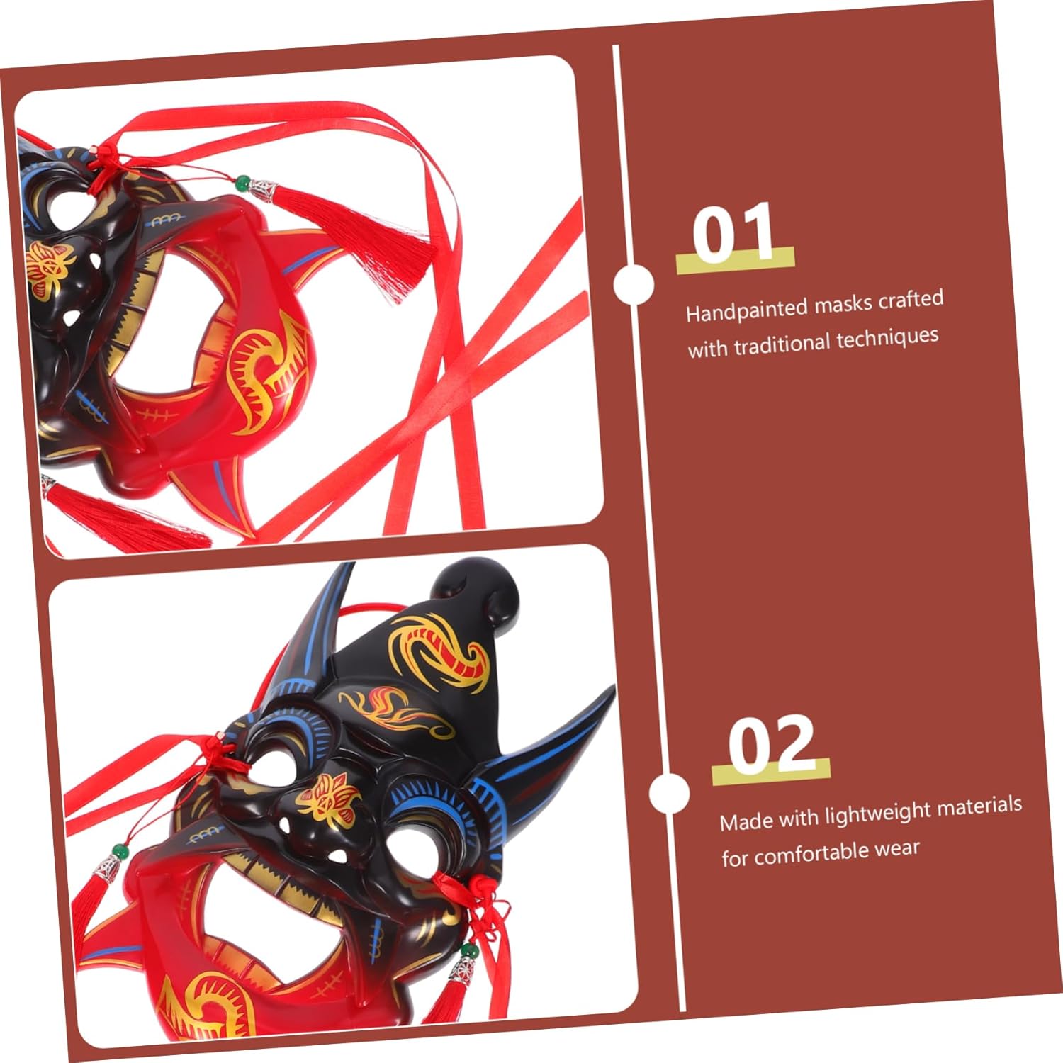 include 1 Caratteristiche -Colore: maschere decorative multiple -Motivi accattivanti: presentano disegni cinesi audaci e colorati rimangono , adatti per maschere teatrali e fotografiche - Decorazione versatile: funge da decorativo , l'atmosfera delle case o dei luoghi eventi maschera cosplay - : dipinte a mano incarnano , aggiungendo autenticità e fascino a qualsiasi celebrazione o evento cosplay. -Copertura completa: design migliora la del personaggio, rendendolo per spettacoli drammatici e maschere per feste cosplay a tema. -Materiale: maschera in resina -Design confortevole: i materiali leggeri garantiscono una facile indossabilità, anche durante lunghe ore sfilate o attività . -Dimensioni: 26,00X14,50X5,50 cm/10,22X5,70X2,16 pollici maschera fatta a mano Descrizione della merce maschera in maschera maschera è un'aggiunta appropriata alle forniture per feste, fornendo un per qualsiasi celebrazione. maschere in maschera utilizzata come accessorio per costumi o come decorativo, la sua finitura a mano e significato la rendono una scelta eccezionale per coloro e nella pianificazione del loro evento
