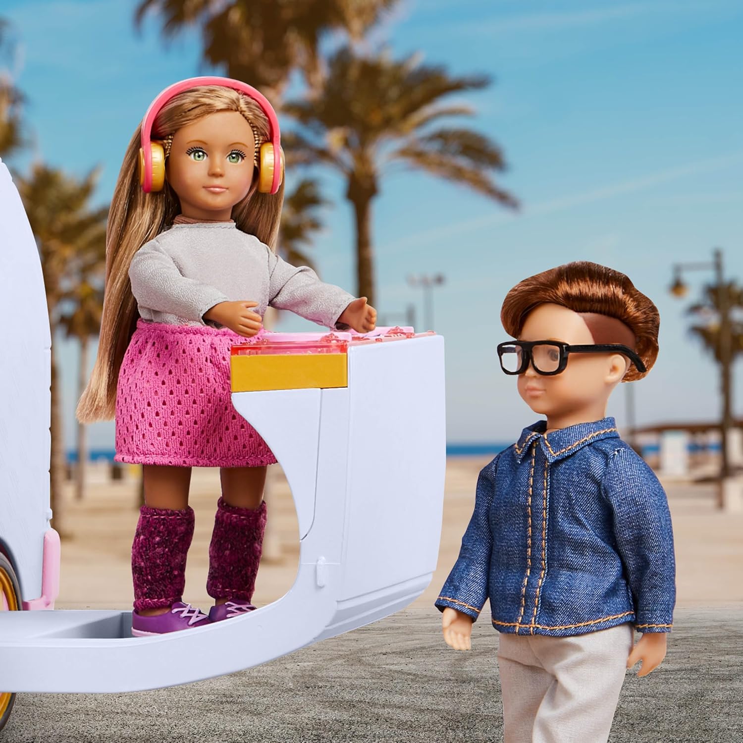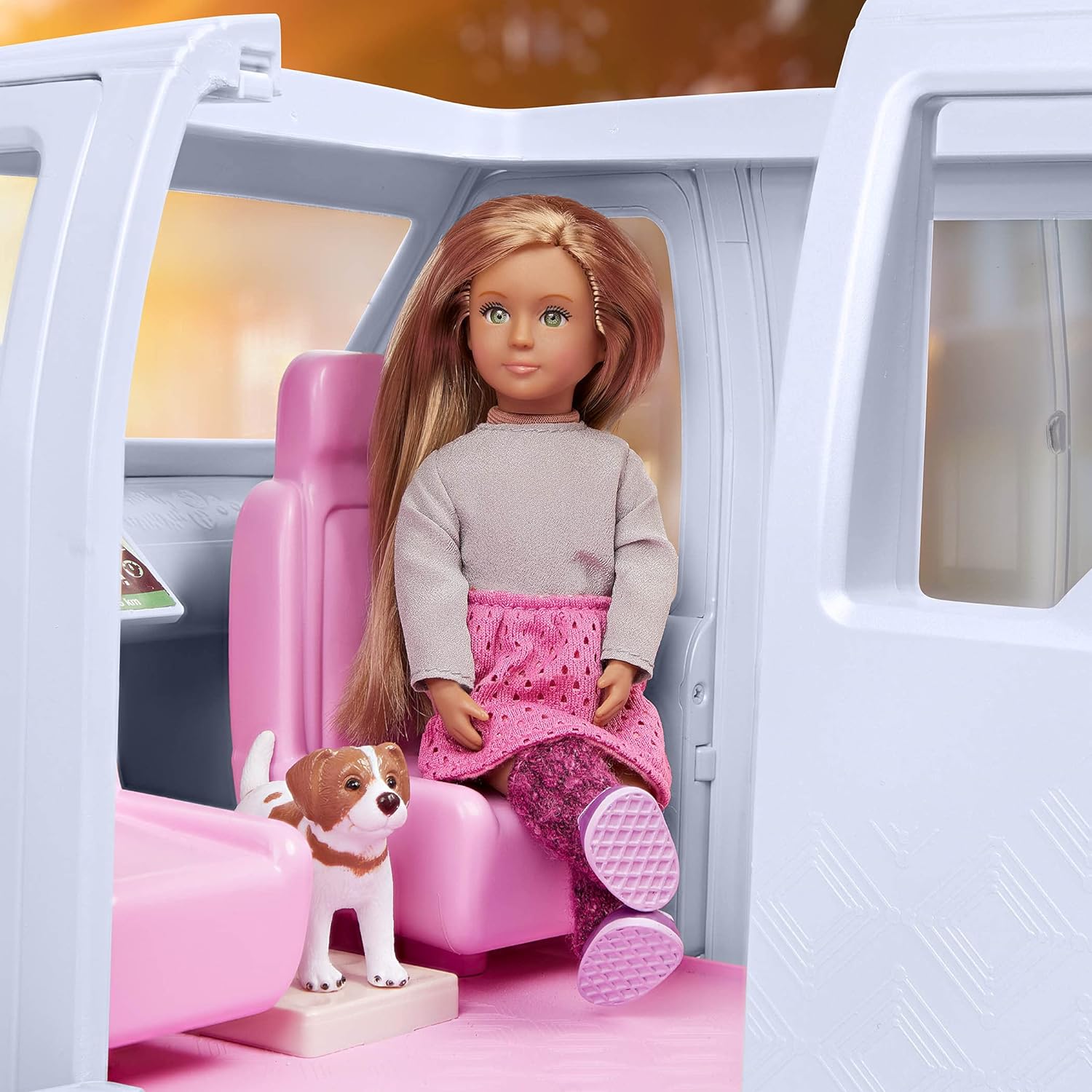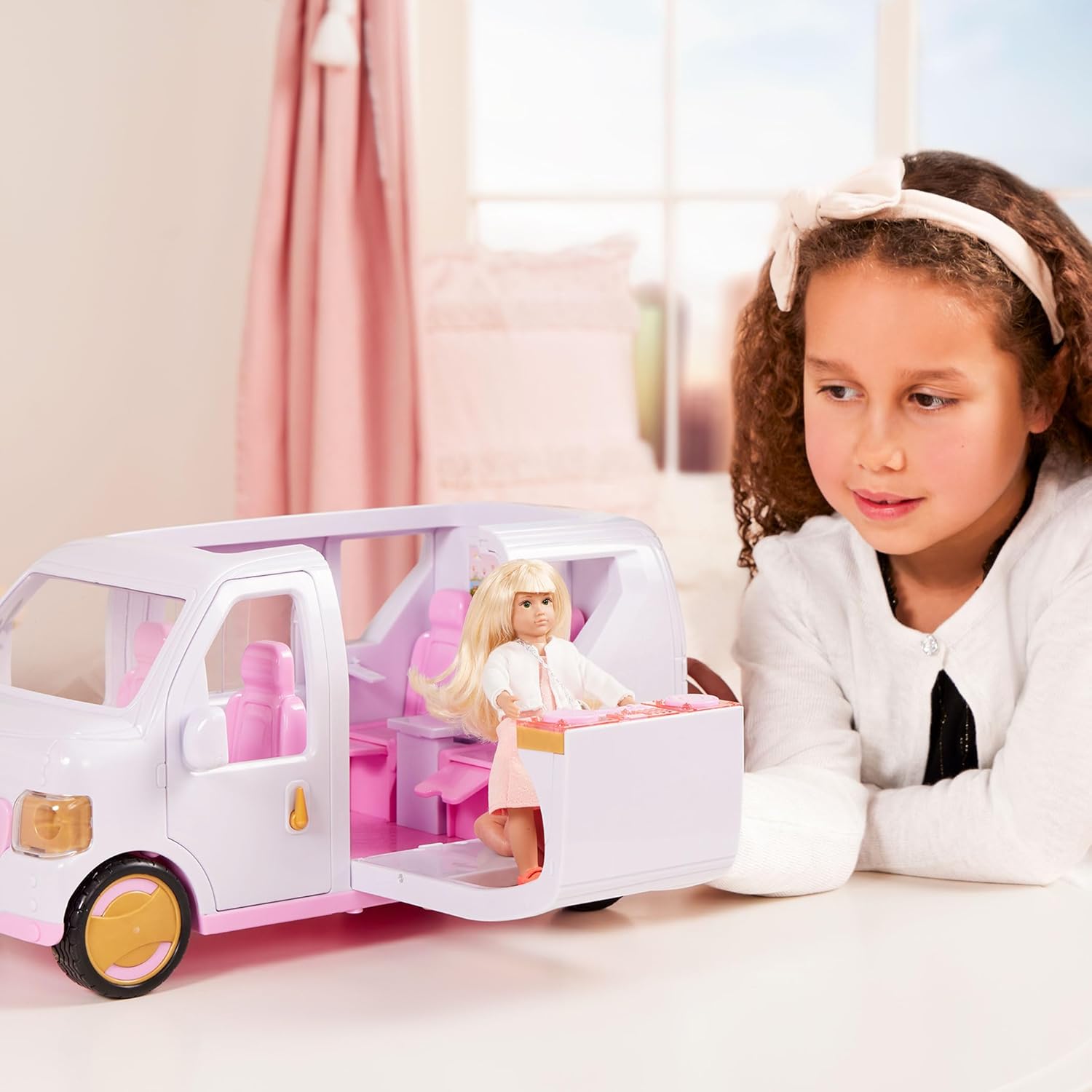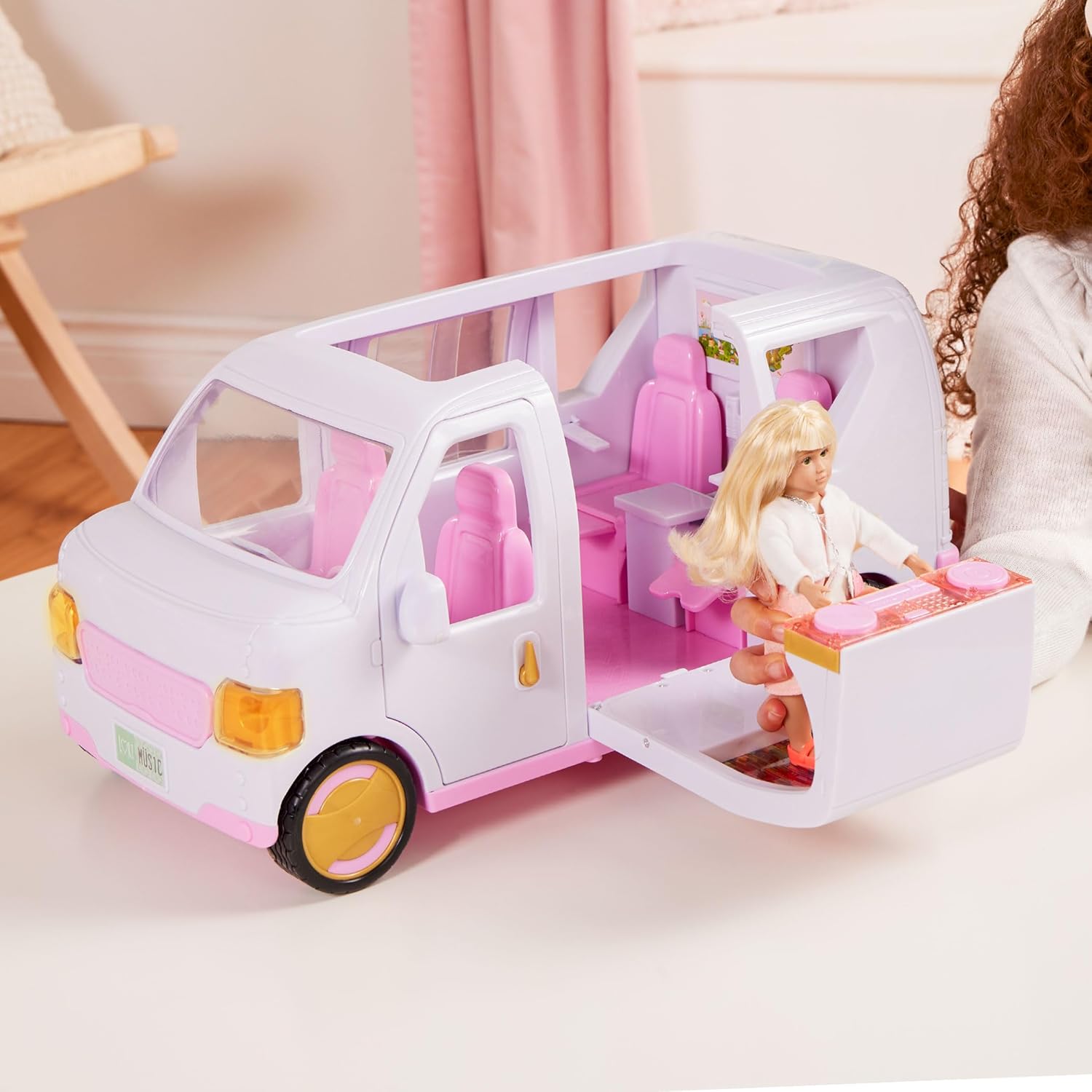 SUV di lusso: porta le tue mini bambole in un viaggio divertente in un veicolo alla moda pieno di funzionalità interattive Funzionalità divertenti: le bambole possono aprire le porte per saltare fuori, riprodurre musica nella cabina del DJ, ruotare i sedili, aprire il finestrino, appendere i loro abiti nell'armadietto sul retro, raggiungere la prossima destinazione e molto altro ancora. (3 batterie AA incluse) Suoni e luci: la cabina musicale funziona e presenta melodie divertenti e luci colorate