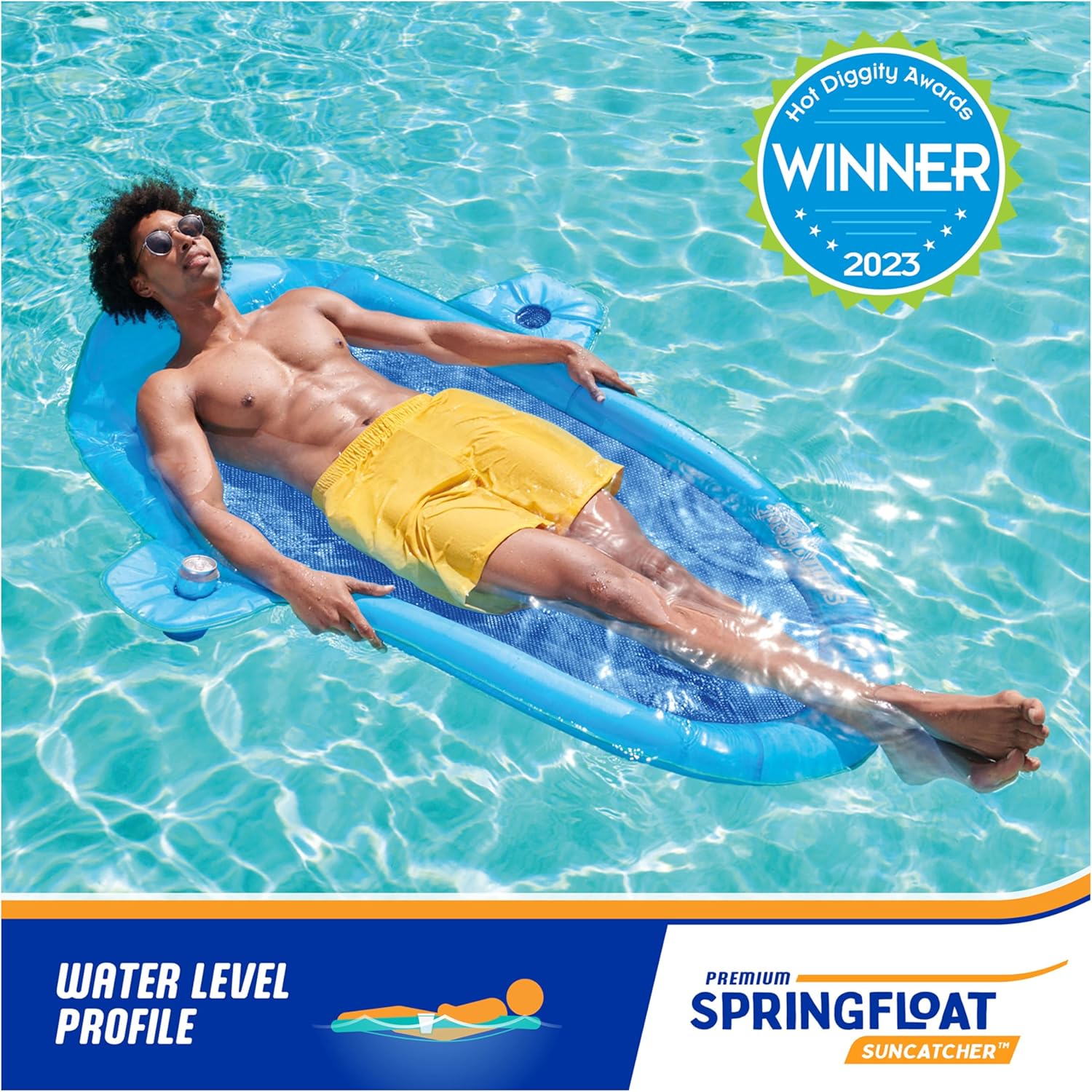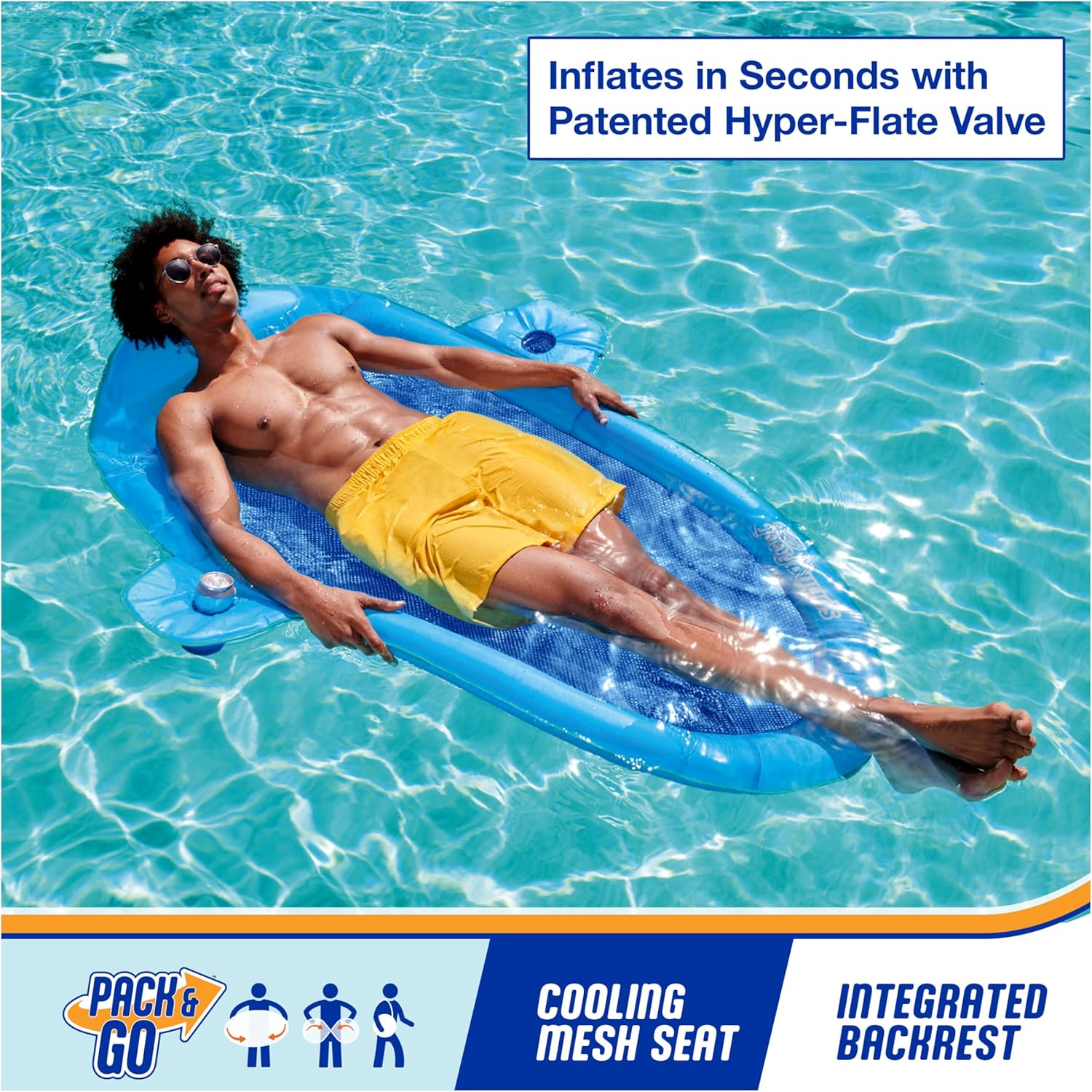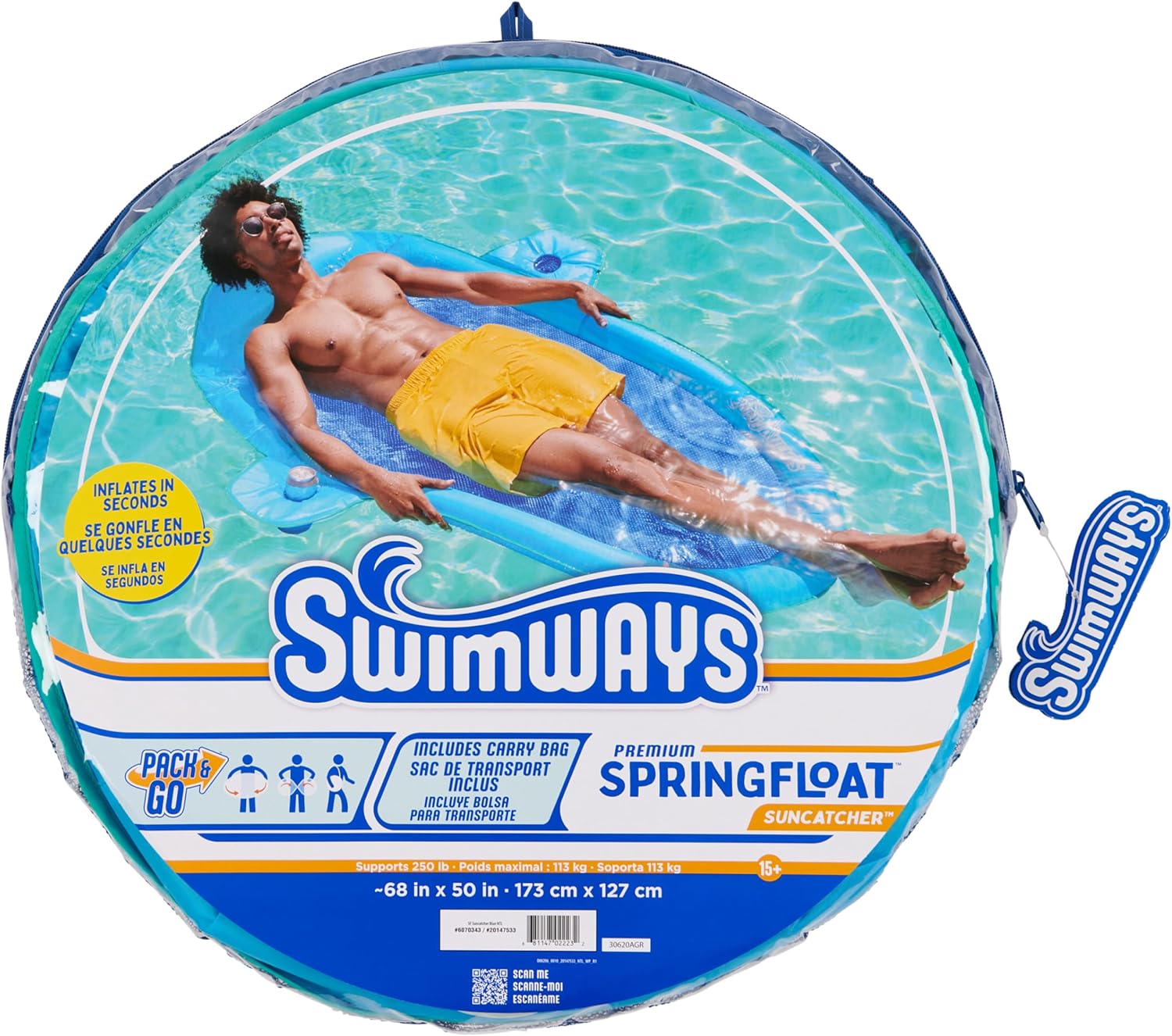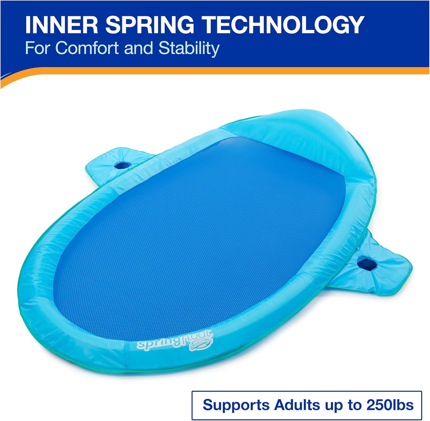 Lettino da piscina galleggiante a molla: è dotato di una morbida rete rinfrescante che trattiene il corpo appena sotto la superficie dell'acqua per mantenerti comodamente fresco per ore di relax e divertimento nelle calde giornate estive Cuscino gonfiabile: il cuscino gonfiabile sovradimensionato sostiene la testa mentre le preoccupazioni della vita quotidiana scivolano via, e i doppi portabicchieri ti consentono di portare le tue bevande preferite sull'acqua in modo da poter sorseggiare e galleggiare Design brevettato della molla interna: molla interna cucita attorno al bordo esterno del galleggiante per maggiore comfort e stabilità in acqua Gonfiaggio facile e veloce: La valvola Hyper-Flate in attesa di brevetto massimizza il flusso d'aria per un facile gonfiaggio in una frazione del tempo e il design senza pompa impedisce all'aria di fuoriuscire per il gonfiaggio più veloce di sempre. Include borsa per il trasporto riutilizzabile: misura 68" x 50" x 6" e si piega in 3 cerchi compatti per adattarsi alla borsa per il trasporto inclusa, e supporta la maggior parte degli adulti fino a 250 libbre. Include: 1 acchiappasole SwimWays Spring Float Coperto dall'impegno Spin Master Care. Vedi sotto per maggiori dettagli
