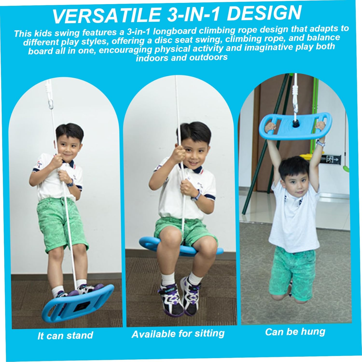 Design 3-in-1 versatile: questo swing per bambini dispone di un design della corda da arrampicata in longboard 3 in 1 che adatta a diversi stili di gioco, offrendo un'oscillazione del sedile del disco, una corda da arrampicata e l'equilibrio tutto in uno, incoraggiando l'attività fisica e il gioco immaginativo sia all'interno che all'esterno. Migliora le capacità motorie e il divertimento: combinando le attività di arrampicata, bilanciamento e oscillazione, questa oscillazione per bambini aiuta a sviluppare abilità motorie, coordinamento e equilibrio, offrendo al contempo un intrattenimento senza fine che mantiene i bambini impegnati e attivi per ore. Uso esterno: costruito con materiali resistenti alle intemperie, questa oscillazione degli alberi è costruita per resistere agli elementi esterni, fornendo divertimento di lunga durata nel tuo cortile, giardino o parco giochi senza sbiadire o danni. Regolabile e sicuro: dotato di una lunghezza della corda regolabile e un robusto design senza groviglio, garantisce un'esperienza oscillante sicura e confortevole per i bambini e i bambini più grandi, supportando varie altezze e configurazioni del parco giochi. Facile installazione e compatibilità: progettata per una facile configurazione su alberi o set di oscillazioni, adatta alla maggior parte dei set di altalene nel cortile e agli accessori del parco giochi, rendendolo una comoda aggiunta all'area di gioco all'aperto di tuo figlio con uno sforzo minimo.