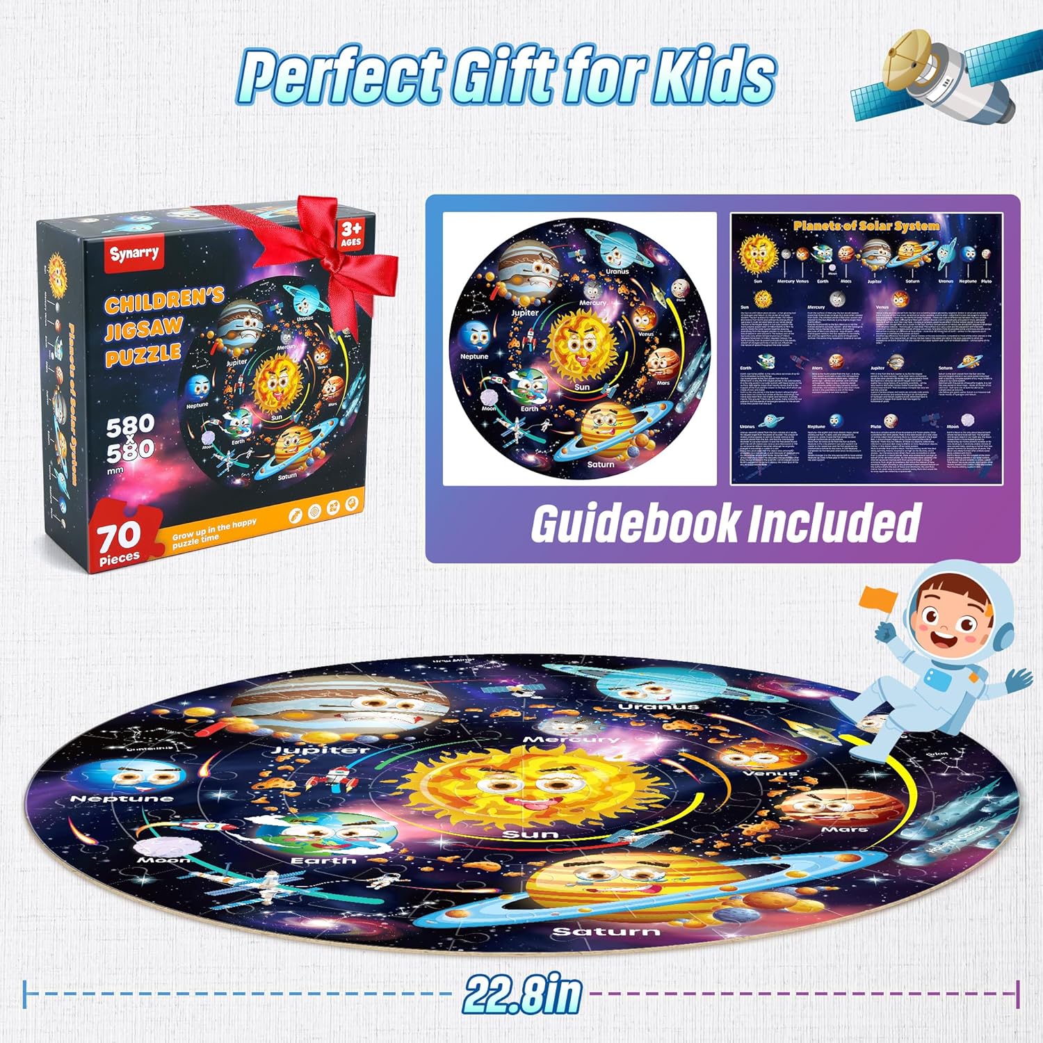 Divertente puzzle da pavimento con sistema solare: questo è un puzzle circolare gigante da 70 pezzi contenente sole, pianeti, meteore, razzi, astronauti e altro ancora. In cui il sole e ogni pianeta hanno un'espressione carina dei cartoni animati, colorati e luminosi, è facile attirare l'interesse dei bambini. Il tutto in una bella scatola. Puzzle scientifico del sistema solare: il nostro puzzle da pavimento fornisce un'introduzione ai pianeti del sistema solare in modo che i bambini possano conoscere il sistema solare scientifico divertendosi ad assemblare puzzle. Questa è la scelta ideale per i bambini che amano esplorare lo spazio! Ottimo giocattolo educativo per la scuola materna: questo puzzle è progettato per promuovere la curiosità e l'immaginazione dei bambini sull'astronomia e la scienza. Il tuo bambino avrà tempo infinito per costruire un tema spaziale. Materiali durevoli e sicuri: i puzzle da pavimento sono realizzati per i bambini, atossici, utilizzando tecniche di taglio fine, realizzati in legno di cartone di alta qualità, e i bordi di ogni pezzo sono accuratamente lucidati in modo che un bambino possa afferrarlo in modo sicuro. Questi puzzle sono abbastanza resistenti da essere utilizzati ripetutamente da bambini di età compresa tra 3 e 8 anni. Ottima idea regalo per bambini: il set di puzzle per bambini è un'ottima scelta regalo per compleanni, Ringraziamento, Natale, Pasqua, Halloween e altre vacanze. Puzzle da pavimento del sistema solare per ragazzi e ragazze di 3, 4, 5, 6, 7, 8, 9, 10 anni. Goditi il tempo in famiglia in cui tutti interagiscono insieme per costruire un'infanzia colorata per tuo figlio. Viaggia nell'universo con noi!