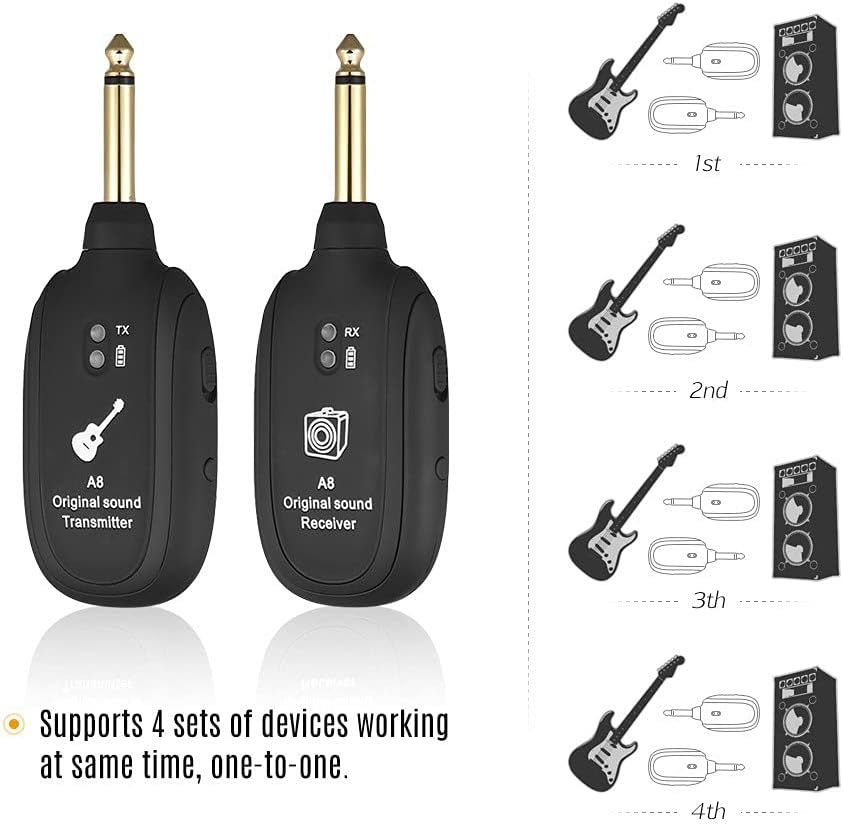 Batteria al litio ricaricabile incorporata, lungo tempo di , dotata di USB, facile da caricare Trasmissione del suono originale ad altissima frequenza 730 mhz, anti-interferenza, ritardo ultra-corto. Supporta 4 gruppi di dispositivi da utilizzare contemporaneamente, il raggio di trasmissione può raggiungere i 50 metri Plug and play, facile da usare, di piccole dimensioni, leggero e facile da trasportare. Trasmettitori e ricevitori wireless possono essere utilizzati per strumenti musicali elettroacustici come chitarre, , violini, ecc.