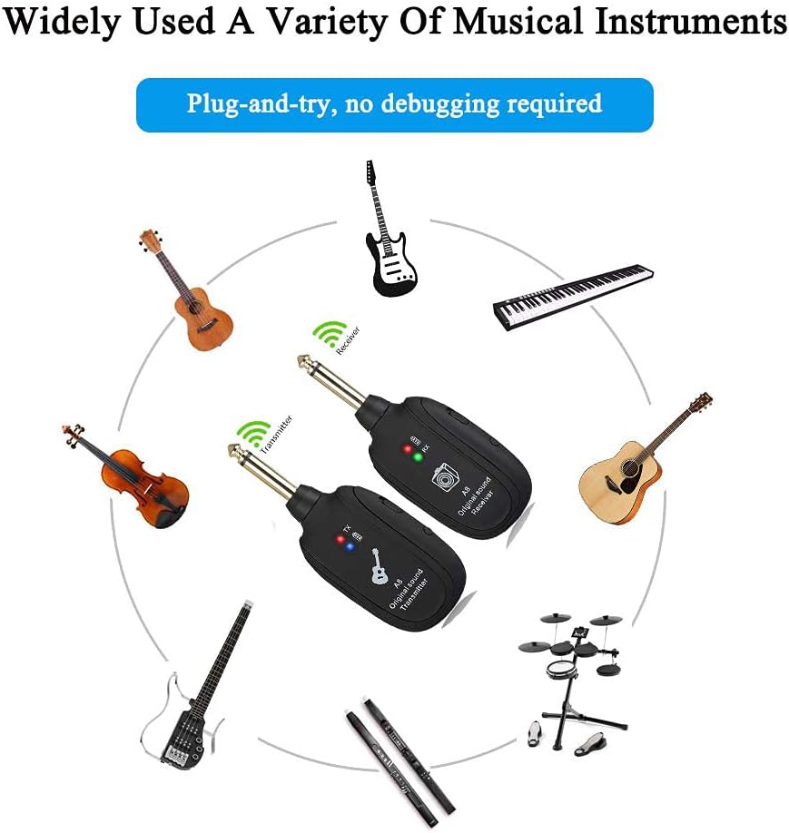 Supporta 4 gruppi di dispositivi da utilizzare contemporaneamente, il raggio di trasmissione può raggiungere i 50 metri Batteria al litio ricaricabile incorporata, lungo tempo di , dotata di USB, facile da caricare Plug and play, facile da usare, di piccole dimensioni, leggero e facile da trasportare. Trasmissione del suono originale ad altissima frequenza 730 mhz, anti-interferenza, ritardo ultra-corto. Trasmettitori e ricevitori wireless possono essere utilizzati per strumenti musicali elettroacustici come chitarre, , violini, ecc.