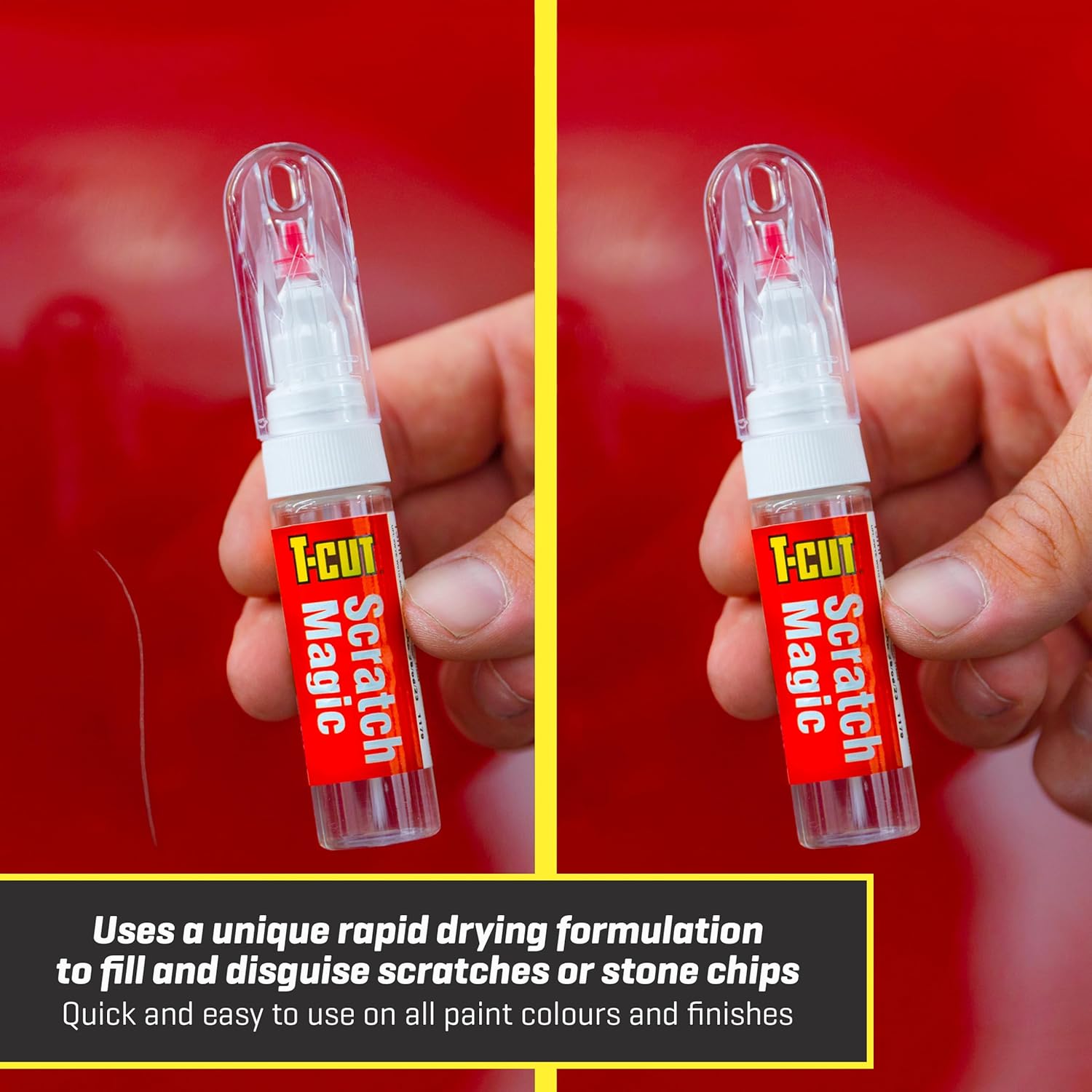 La T-Cut Scratch Magic Pen nasconde graffi e segni di pietra in un'unica applicazione. La formula trasparente è adatta a tutti i colori di vernice e la punta fine consente una riparazione precisa senza contaminazioni. Protegge dalle intemperie, dalla ruggine e dall'ossidazione Due metodi di applicazione: punta fine per graffi più larghi e profondi o pennello di precisione per graffi più piatti Facile e veloce da usare su tutti i colori e le superfici di vernice (comprese quelle metallizzate) Asciugatura rapida in pochi minuti.