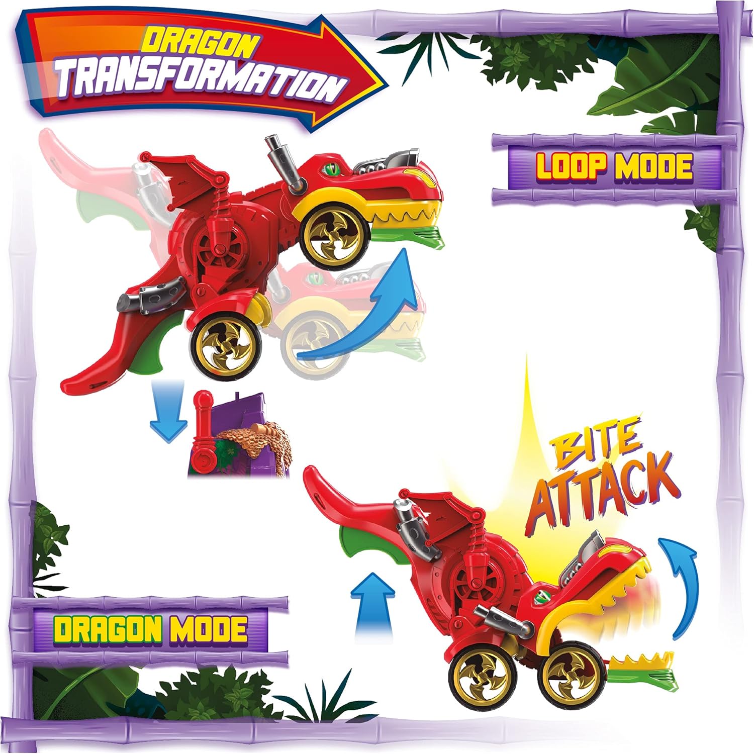 EVITA IL DRAGO! Riuscirai a fare il giro perfetto ed evitare le fauci del drago? Non lasciarti ingannare! Si trasforma anche in un veicolo a ruote che apre le fauci per mangiarti. LOOP ESTREMO. Il drago è pronto a inghiottire chiunque osi sfidarlo. Premi il lanciatore con la forza esatta per levitare e fare il giro perfetto... o finirai nelle sue fauci! Luce e veicolo esclusivi. Troverai il driver Tiki Twist solo nell'avventura Dragon Loop. Anche il tuo veicolo è esclusivo, ma le sue parti possono anche essere combinate con quelle di altri veicoli T-Racers che possiedi. Emozione e piacere. Vivi mille avventure evitando il drago e portando via la coppa dorata Dragon Loop.