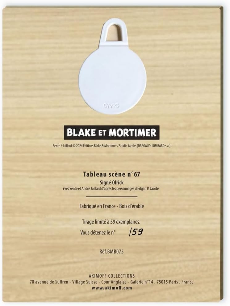 Quadro in legno d'acero collezione del produttore Akimoff, Blake e Mortimer dell'album firmato Olrik: Nella chiesa di Longval da Yves Sente e Andre Luglio. Le illustrazioni e i colori di questo album lo rendono un'opera magistrale della Linea Claire, sottolineando l'eleganza e la precisione dello stile che ha reso lugliardo così famoso. Edizione limitata. Tiraggio: 59 copie numerate da 1 a 59. Firmato Olrik è l'ultimo album di Blake e Mortimer pubblicato dopo la morte di luglio la scorsa estate. Questo album segna la conclusione di una collaborazione memorabile, fedele all'universo creato da Edgar P. Jacobs. Le illustrazioni e i colori di questo album lo rendono un'opera magistrale della Linea Claire, sottolineando l'eleganza e la precisione dello stile che ha reso lugliardo così famoso. Le illustrazioni sono stampate con attenzione su acero. Questo prodotto è realizzato artigianalmente in Francia. Tavolo in legno d'acero. Un gancio è fissato sul retro. ORIGINE: Francia. Realizzato in Touraine, ogni stampa si adatta alle venature del legno che diventa così un oggetto unico. Dimensioni: 20 x 27 cm. Istruzioni per la manutenzione: questo prodotto è realizzato in legno naturale. Per pulirlo non devono essere applicati prodotti chimici o abrasivi, è necessario utilizzare solo panno morbido e asciutto.