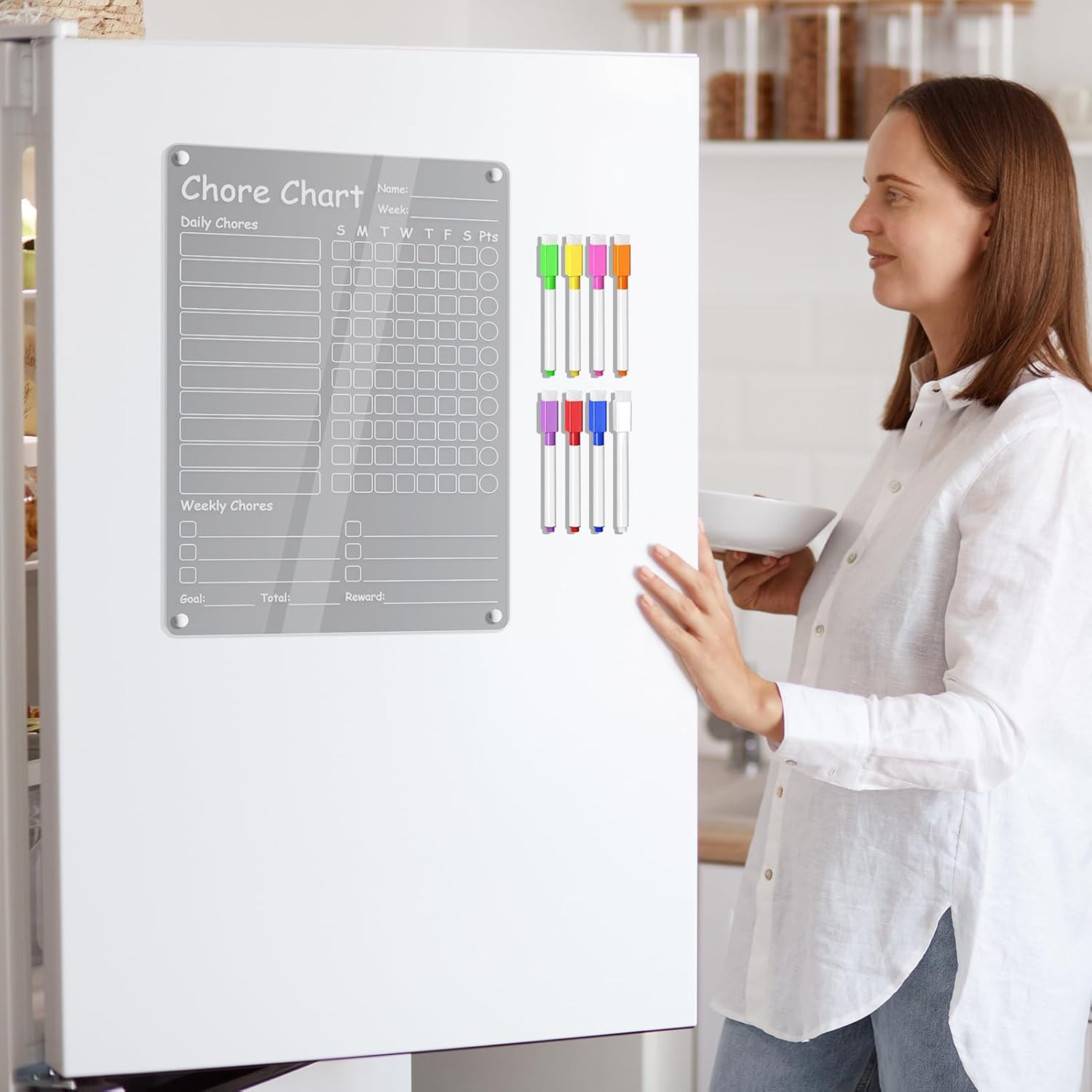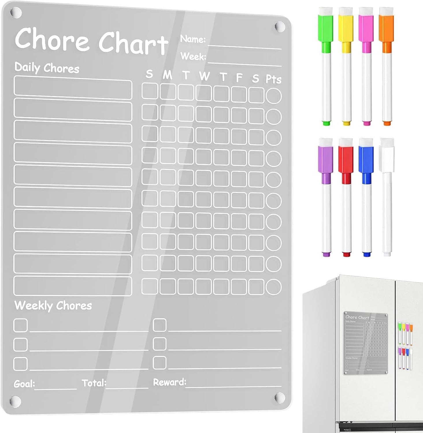 Fissaggio Sicuro: Progettato per aderire perfettamente a porte frigorifero standard, fonde adsorbimento magnetico con design antiscivolo, prevenendo movimenti indesiderati su superfici lisce con stabilità costante Materiale Resistente: Realizzato in materiale composito ad alta resistenza, questa lavagna evita segni sulla superficie e protegge efficacemente il rivestimento del frigorifero da graffi e usura quotidiana Pianificazione Efficace: Tabella lavoretti sistematica ispira i bambini a collaborare, con monitoraggio visivo e codici colore su una lavagna organizzata per gestione efficiente dei compiti giornalieri. Strumento Scrittura Migliorato: Include 8 pennarelli a punta fine con colori vivaci per scrittura scorrevole, facilmente cancellabili con panno sulle superfici opache senza lasciare aloni o residui, ideali per riutilizzo continuo Scelta Regalo Eccellente:: Lavagna organizzativa in acrilico progettata per doni, dotata di packaging festivo pronto, scelta eccellente per utilità domestica e occasioni di regalo significative come anniversari.