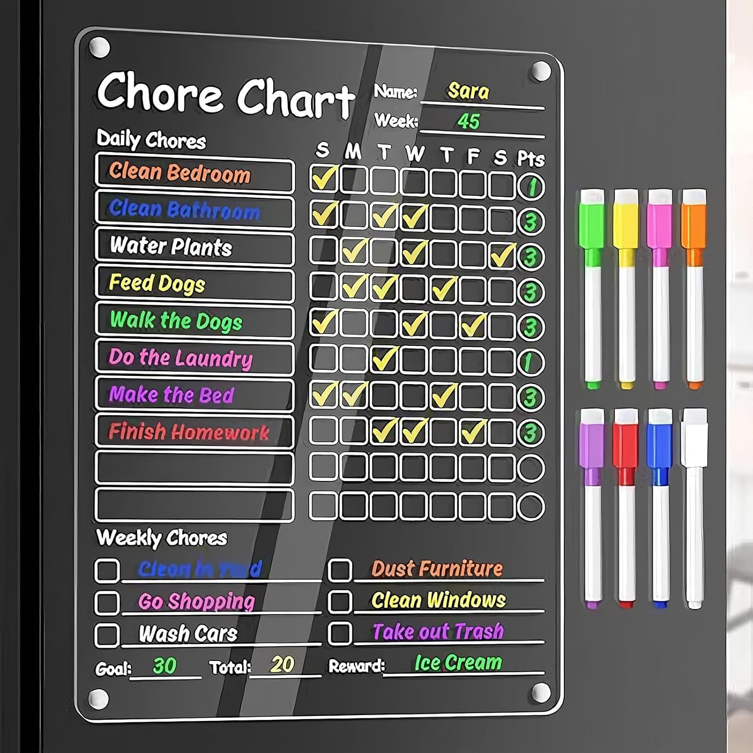 Fissaggio Sicuro: Progettato per aderire perfettamente a porte frigorifero standard, fonde adsorbimento magnetico con design antiscivolo, prevenendo movimenti indesiderati su superfici lisce con stabilità costante Materiale Resistente: Realizzato in materiale composito ad alta resistenza, questa lavagna evita sulla superficie e protegge efficacemente il rivestimento del frigorifero da graffi e quotidiana Motivazione Interattiva: divertente stimola la partecipazione dei bambini con codici colore per tracciare i compiti e una lavagna per organizzare le routine quotidiane in modo chiaro e coinvolgente. Strumenti di Precisione: 8 pennarelli colorati garantiscono maneggevolezza e linee nitide, mentre la finitura opaca permette pulizia rapida con panno per una durata senza complicazioni Regalo Premuroso:: Lavagna per faccende domestiche in acrilico unisce funzionalità versatile a presentazione , ideale per ambienti domestici e bisogni di regalo durante occasioni speciali con packaging pronto all'uso.