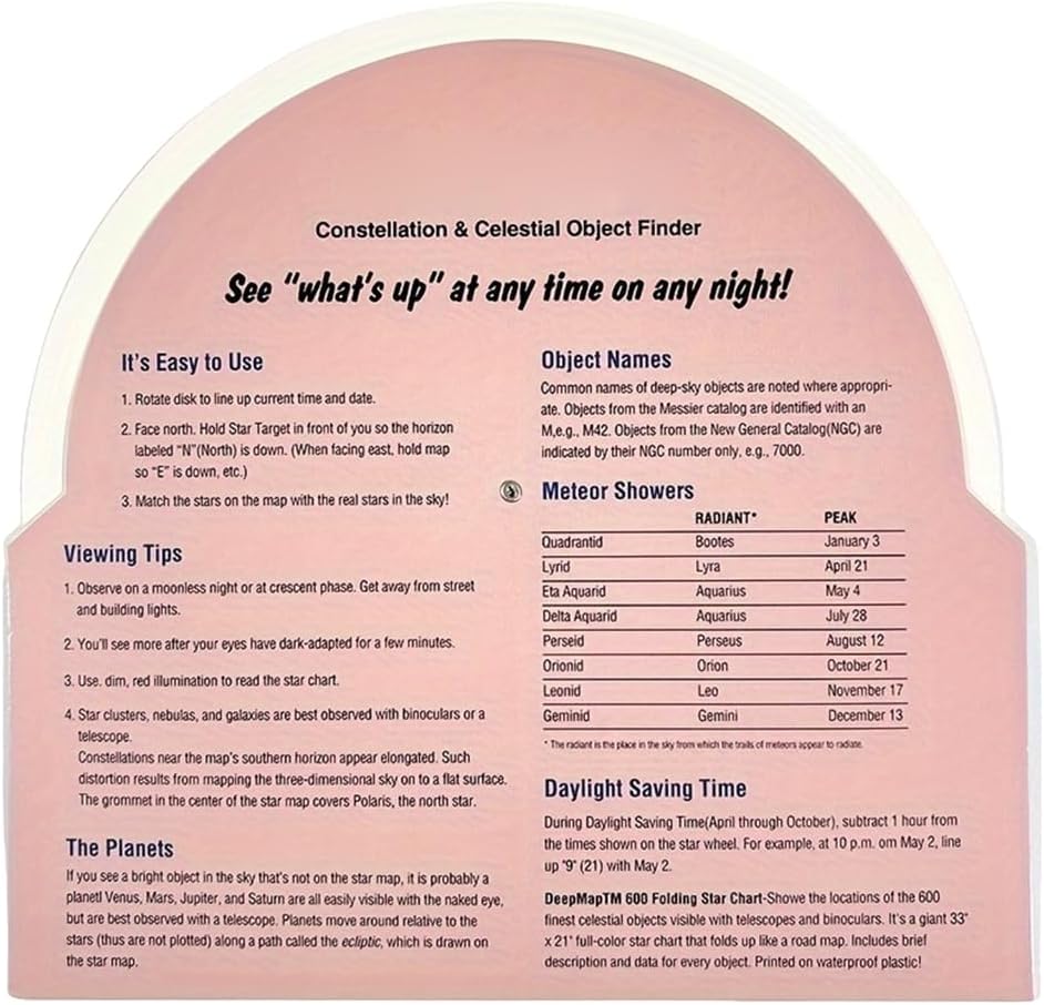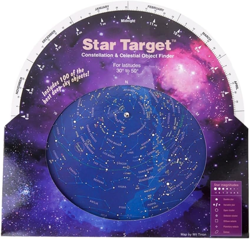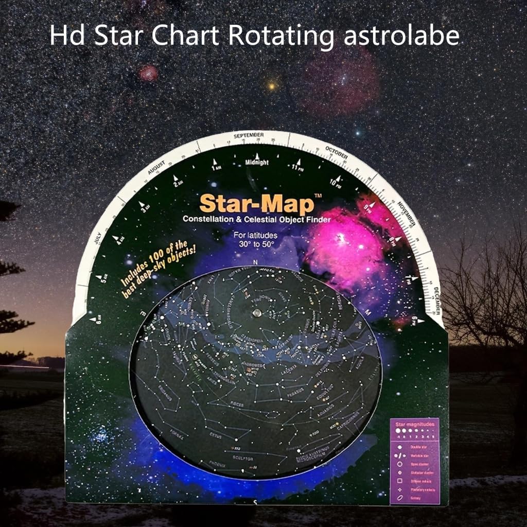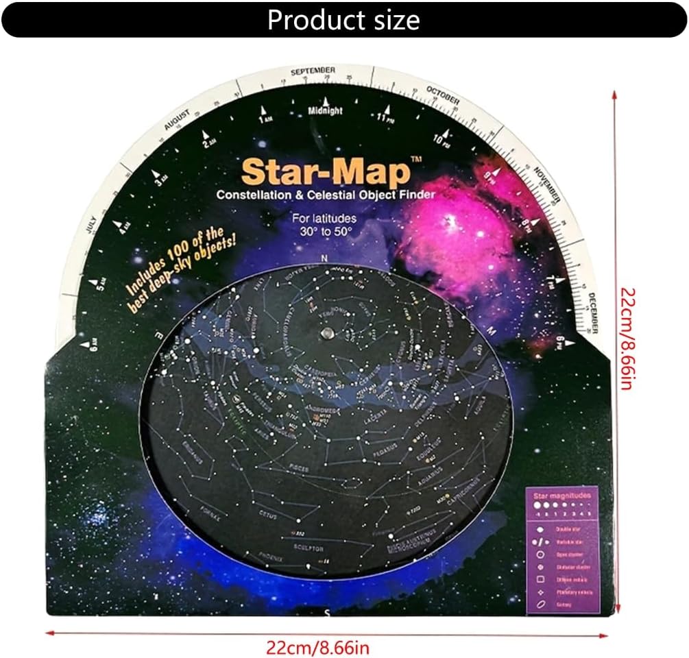 Guida stellare: Questa mappa fornisce agli appassionati di astronomia una guida chiara per conoscere la costellazione, stella luminosa,. Lucida le tue abilità di osservazione delle stelle con questo strumento essenziale. Facile da usare: basta allineare la data e l'ora e questa guida a stella rotante ti mostrerà sopra la testa. È facile da usare e ideale per astronomi avanzati e principianti. Ottima opzione telescopica: sia che tu stia usando un telescopio, un binocolo, questa guida stellare è un ottimo accessorio per le tue osservazioni astronomiche. Progettato per l'uso entro 30 gradi a 50 gradi gamme settentrionali, può essere utilizzato indipendentemente dall'anno solare. Goditi lo sguardo senza ostacoli delle stelle tutto l'anno. Strumento educativo: la guida stellare mostra le posizioni di 100 ammassi stellari e galassie. È un buon aiuto per osservare questi corpi attraverso un telescopio o un binocolo.