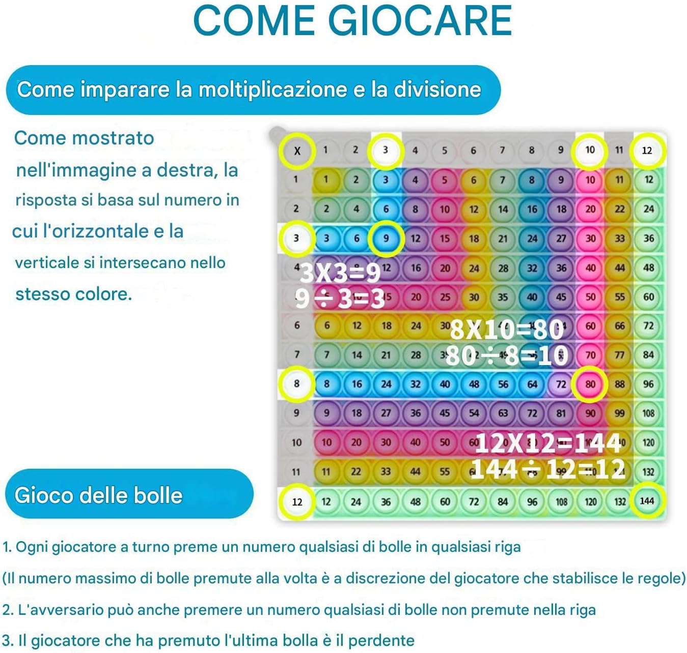 per l'Apprendimento Matematico Sensoriale: Progettato come un sussidio didattico a feedback sensoriale, questa tavola incoraggia il rinforzo matematico basato sul gioco, aiutando i bambini a mantenere la concentrazione e la calma, caratteristica ideale per ambienti di classe vivaci o spazi di studio silenziosi. Risorsa Didattica : Multiplication Pop 12x12 incorpora una layout colorata visivamente accattivante per assistere gli insegnanti nelle aule e i genitori durante la pratica matematica, favorendo il riconoscimento dei pattern e il miglioramento della memoria attraverso esperienze di apprendimento interhealthy per tutte le età, in modo da supportare lo sviluppo di abilità visive e mnemoniche in contesti educativi vari e inclusivi. Portabilità Senza Sforzo: Il design portatile del tabellone con pulsanti per le moltiplicazioni supporta l'uso ripetuto in vari ambienti, offrendo un modo pratico per rafforzare le abilità matematiche comodamente sia in interno che in esterno o durante gli spostamenti con una versatilità di utilizzo ottimale Pratica Divertente della Moltiplicazione: Multiplication Pop è un sussidio didattico tattile e visivo che integra un apprendimento sano e divertente nella pratica delle moltiplicazioni, assicurando che i bambini rimangano concentrati e divertiti durante le attività matematiche a scuola o nelle serate di gioco in famiglia. Scelta Regalo Eccellente: Migliora le capacità di problem-solving e supporta il gioco che incoraggia la motivazione matematica, offrendo un'idea regalo di apprendimento significativa per arricchire le giovani menti durante le vacanze o il dedicato al gioco educativo.