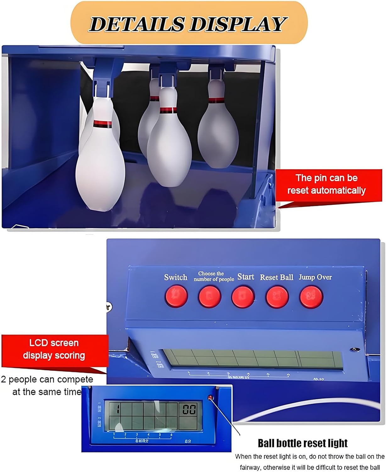 【BOWLING ELETTRICO】 Trasforma il tuo soggiorno in una pista da bowling con il nostro set da bowling elettronico. Goditi la comodità del ritorno automatico della palla e delle funzioni di punteggio. Viene fornito con 6 birilli in plastica e 2 palle da bowling. 【RITORNO AUTOMATICO DELLA PALLA】Quando lanci la palla che hai in mano sulla bottiglia, questa si resetterà automaticamente ed emetterà un suono simulato di reset, rendendo il gioco più realistico e pratico. 【SEGNATORE ELETTRONICO A LED】Le piste da bowling domestiche supportano giochi interattivi per 1 o 2 persone contemporaneamente. L'obiettivo è abbattere il maggior numero possibile di birilli. Durante la partita, il segnapunti elettronico a LED registrerà automaticamente il tuo punteggio e condividerà il divertimento del gioco. 【FACILE DA INSTALLARE】Compatto e leggero, questo set da bowling elettrico può essere rapidamente montato o ripiegato, rendendolo comodo per l'uso domestico senza occupare molto spazio. 【MIGLIORA IL LEGAME FAMILIARE】Il bowling è divertente, interessante, competitivo e stimolante. I giochi possono avvicinare le persone. È un ponte di comunicazione tra famiglia e bambini, rendendo la famiglia più armoniosa e gioiosa.