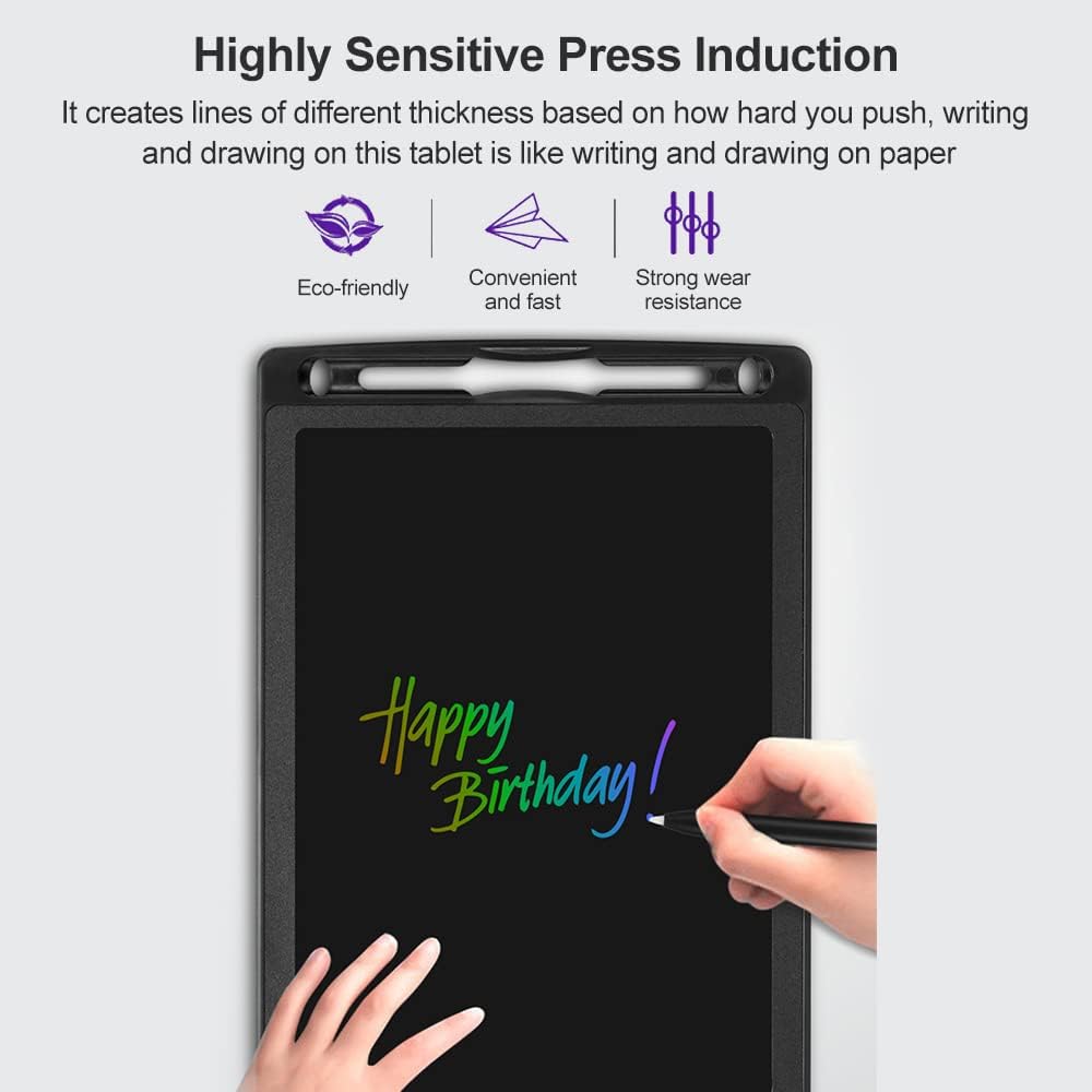 Scrivere e disegnare su questo tablet è come scrivere e disegnare su carta, crea linee di diverso spessore in base alla forza che spingi. Dotato di slot per penna, non facile da perdere, facile da usare e riporre. Design parzialmente cancellabile, può cancellare pagine parziali, comodo e veloce. Premere il pulsante Elimina per cancellare lo schermo quando hai finito di scarabocchiare, mentre il blocco sul retro può il tuo lavoro di essere cancellato accidentalmente. Lo schermo LCD della lavagna senza radiazioni e nessun abbagliamento, e comodo anche per un lungo utilizzo.