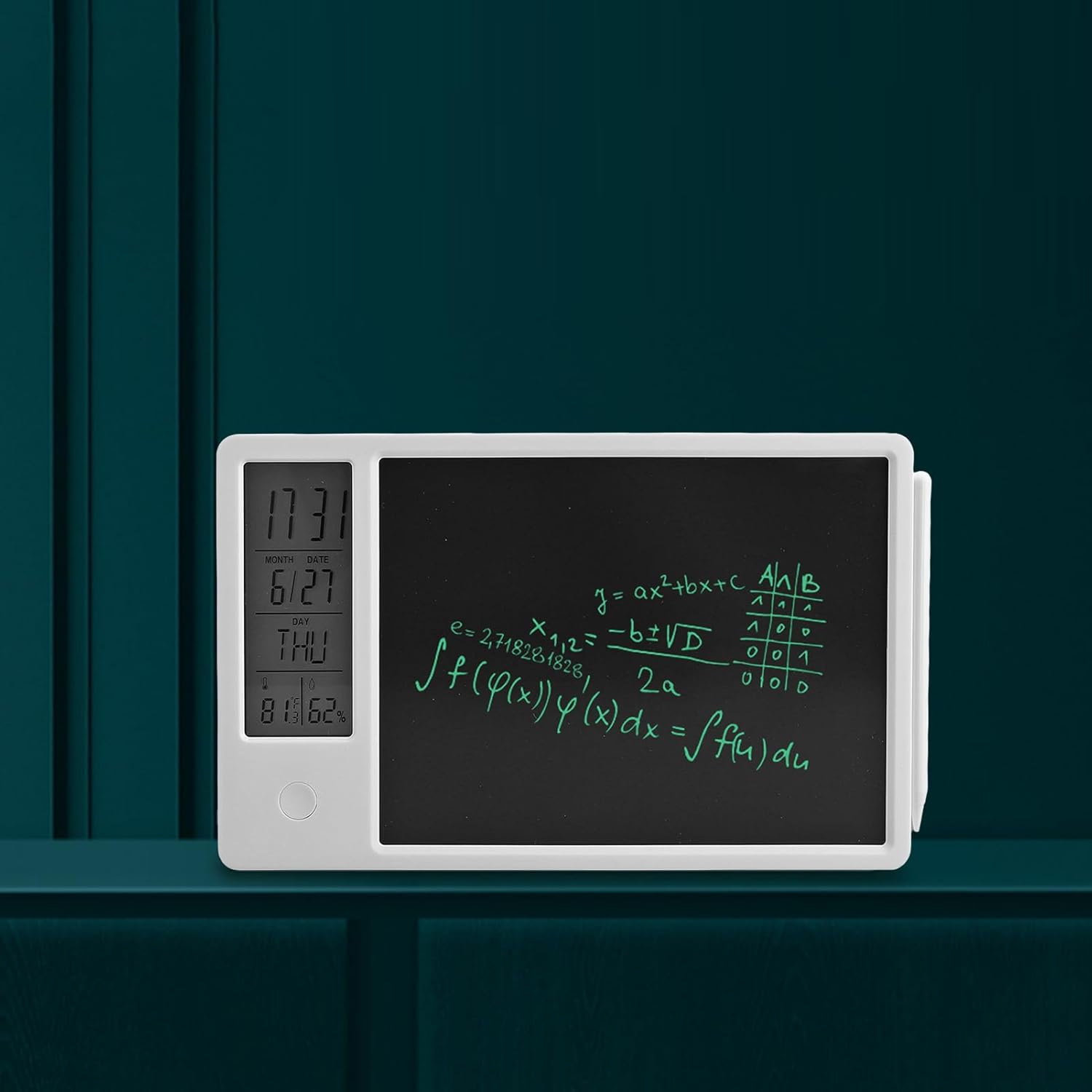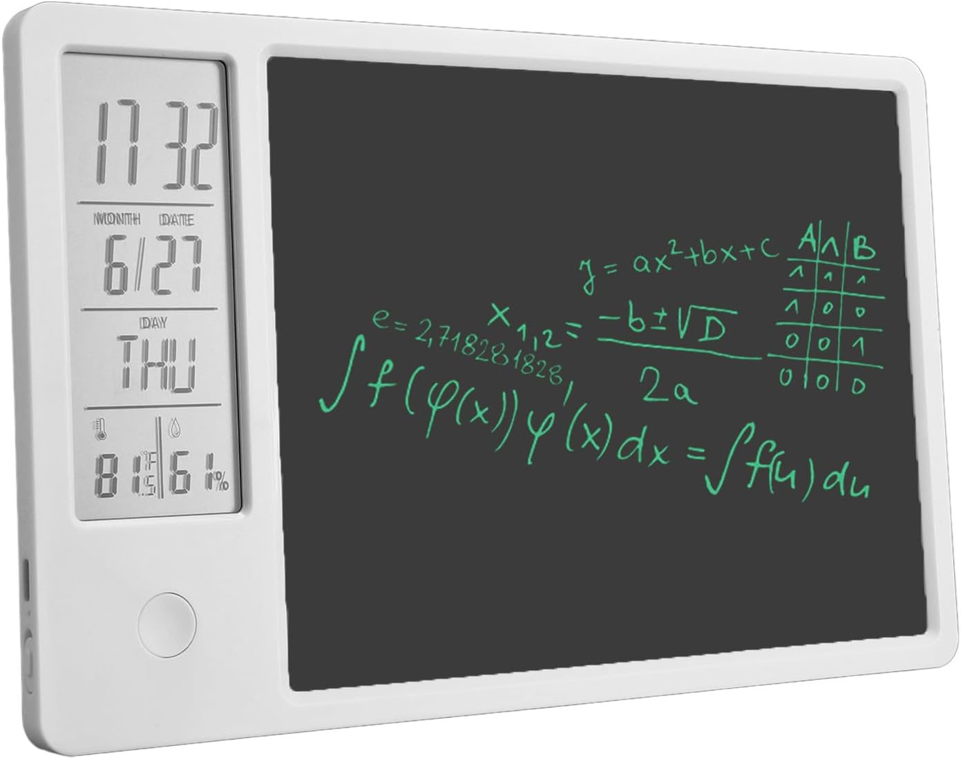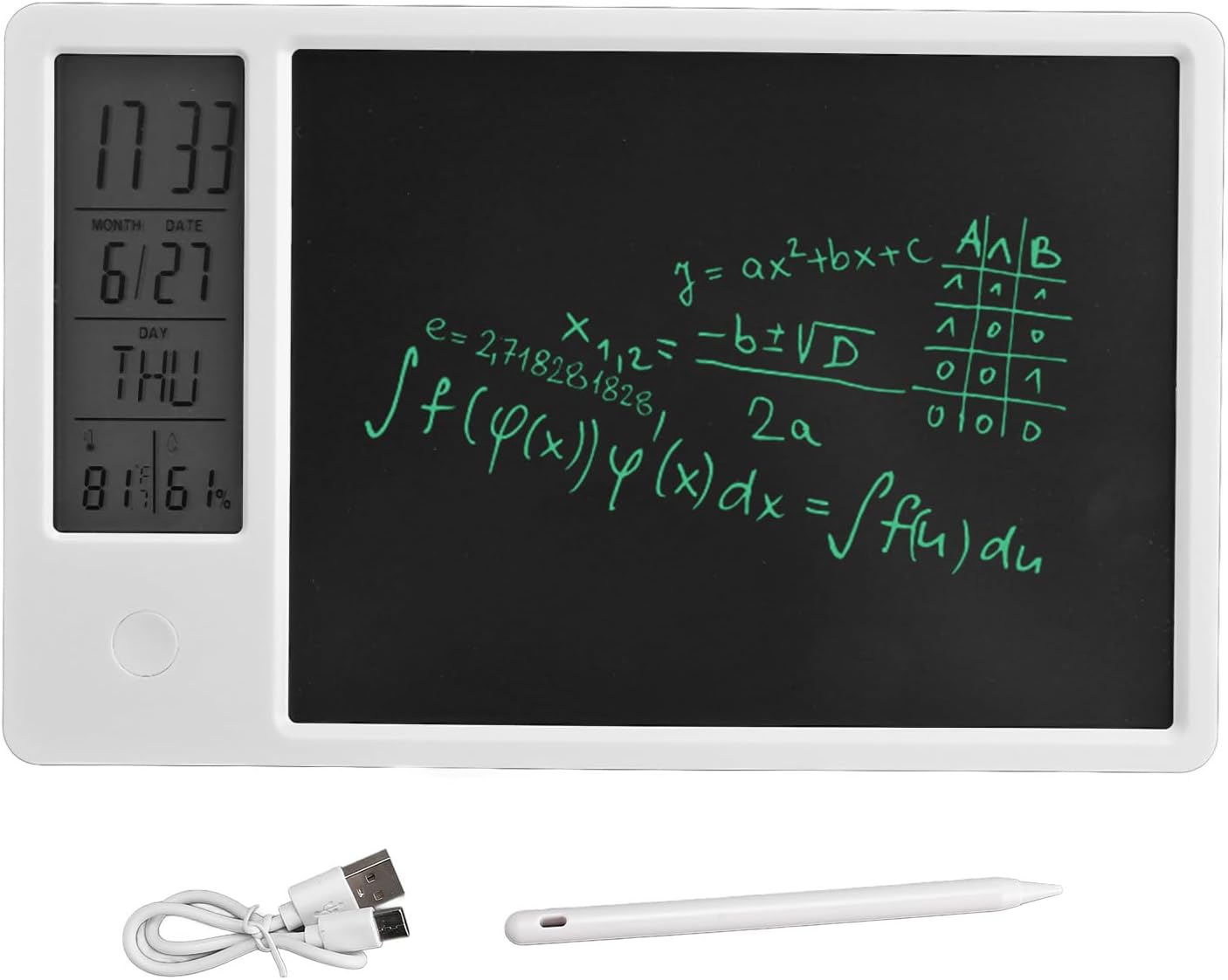 OROLOGIO DIGITALE CON TEMPERATURA E UMIDITÀ: Visualizza ora, data, giorno della settimana, temperatura e umidità sullo schermo LCD sinistro. commutabile 12/24 ore secondo necessità. Fahrenheit e Celsius sono liberamente convertibili. Facile da usare per tutte le età. TAPPETINO PER SCRITTURA: una combinazione di calendario da tavolo con funzioni standard e blocco per appunti, non può salvare efficacemente carta e penna, ma può anche calcolare e registrare ciò che desideri. Dotato di supporto pieghevole, può essere posizionato stabilmente sulla scrivania, sul banco da lavoro, sul comodino. DESIGN CANCELLABILE E STILO: blocco note elettronico da 10 pollici con funzione di cancellazione di un tasto. Lo stilo è magnetico e può essere posizionato sulla parte superiore o laterale del blocco note per un facile accesso. PORTATILE E RICARICABILE: questa tavoletta grafica LCD entra facilmente in una valigetta, borsa o zaino, così puoi portarla con te ovunque tu vada. Design ricaricabile, non è necessario sostituire le batterie, può essere caricato con cavo di ricarica di tipo C, una carica può fornire 3-6 mesi di utilizzo. AMPIO UTILIZZO: puoi scrivere il tuo itinerario sulla lavagna elettronica e impostare allarmi per risolvere il fastidio che tendi a dimenticare. per l'ufficio e l'uso domestico. Può essere utilizzato come promemoria sveglia, orologio intelligente, lavagna per appunti, lavagna, ecc.