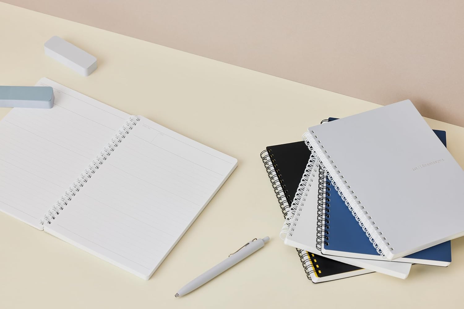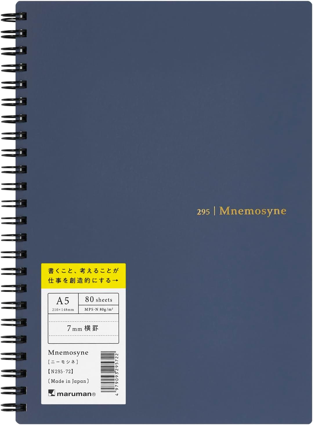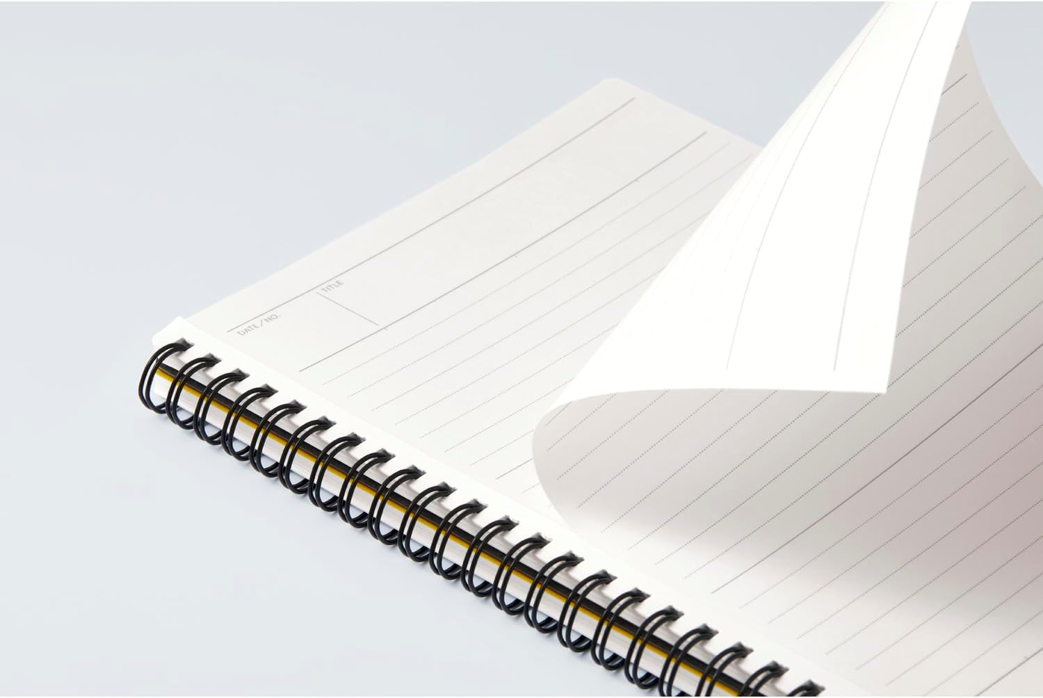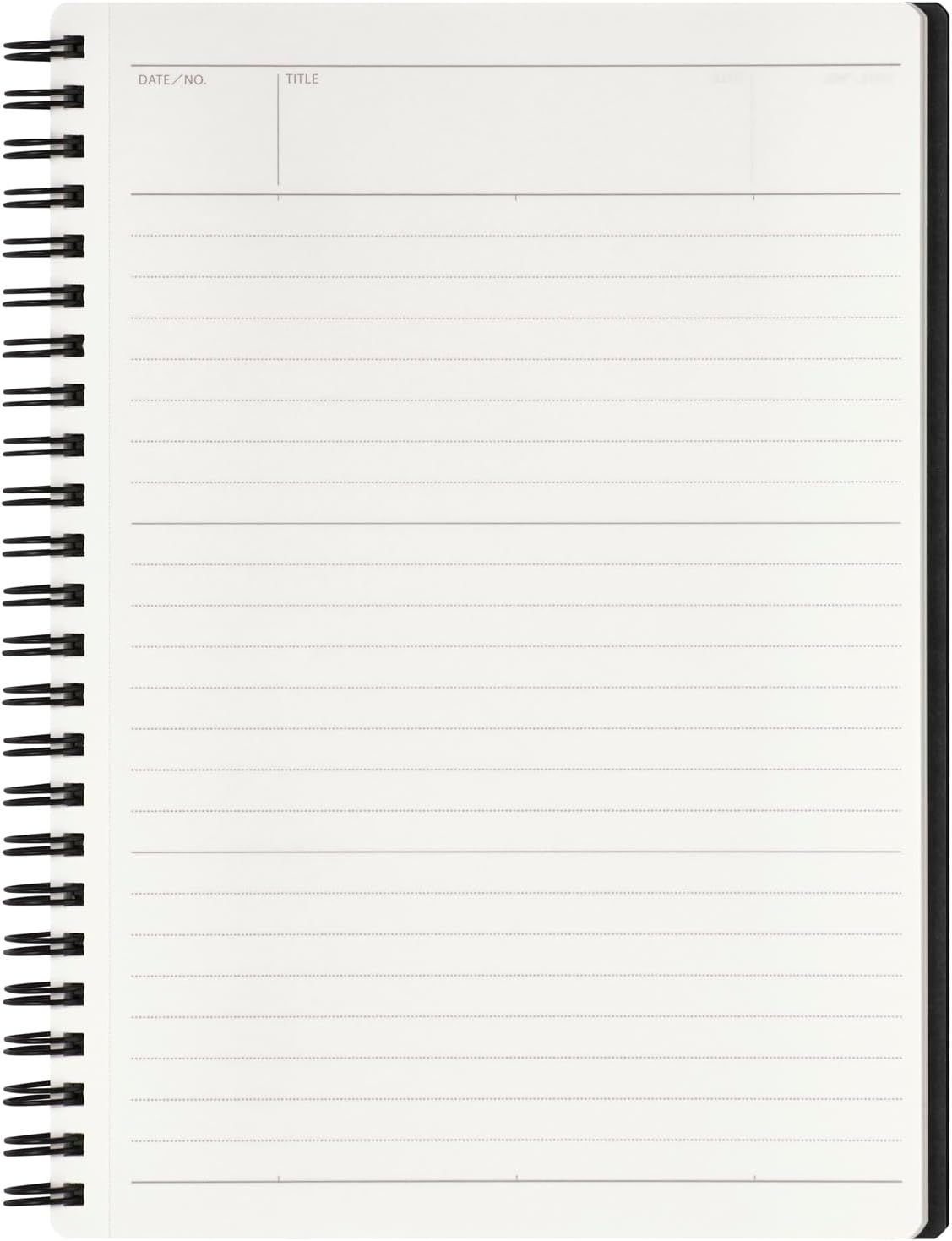 Quaderno professionale a doppio filo con copertina morbida che può resistere all'acqua per un breve periodo per asciugare eventuali fuoriuscite. La carta misura 210 mm x 148 mm quando staccata, leggermente più piccola dei fogli A5. 80 fogli di carta bianca microforata, 80 g/m², senza acidi, con righe grigio chiaro da 7 mm. 24 righe su una pagina divise in tre sezioni da una riga più in grassetto ogni 8 righe per una facile organizzazione e ogni pagina ha un'intestazione vuota con DATA/NO. e titolo. Prodotto in Giappone
