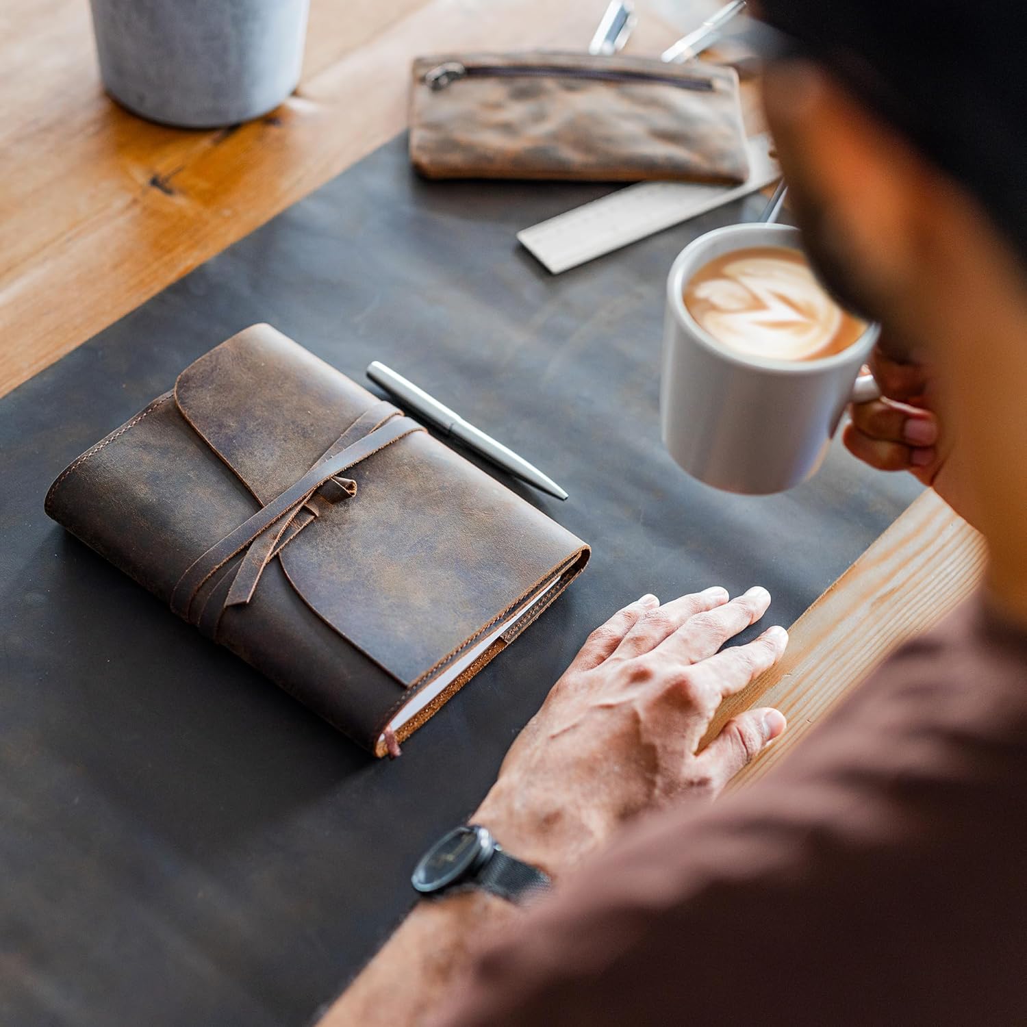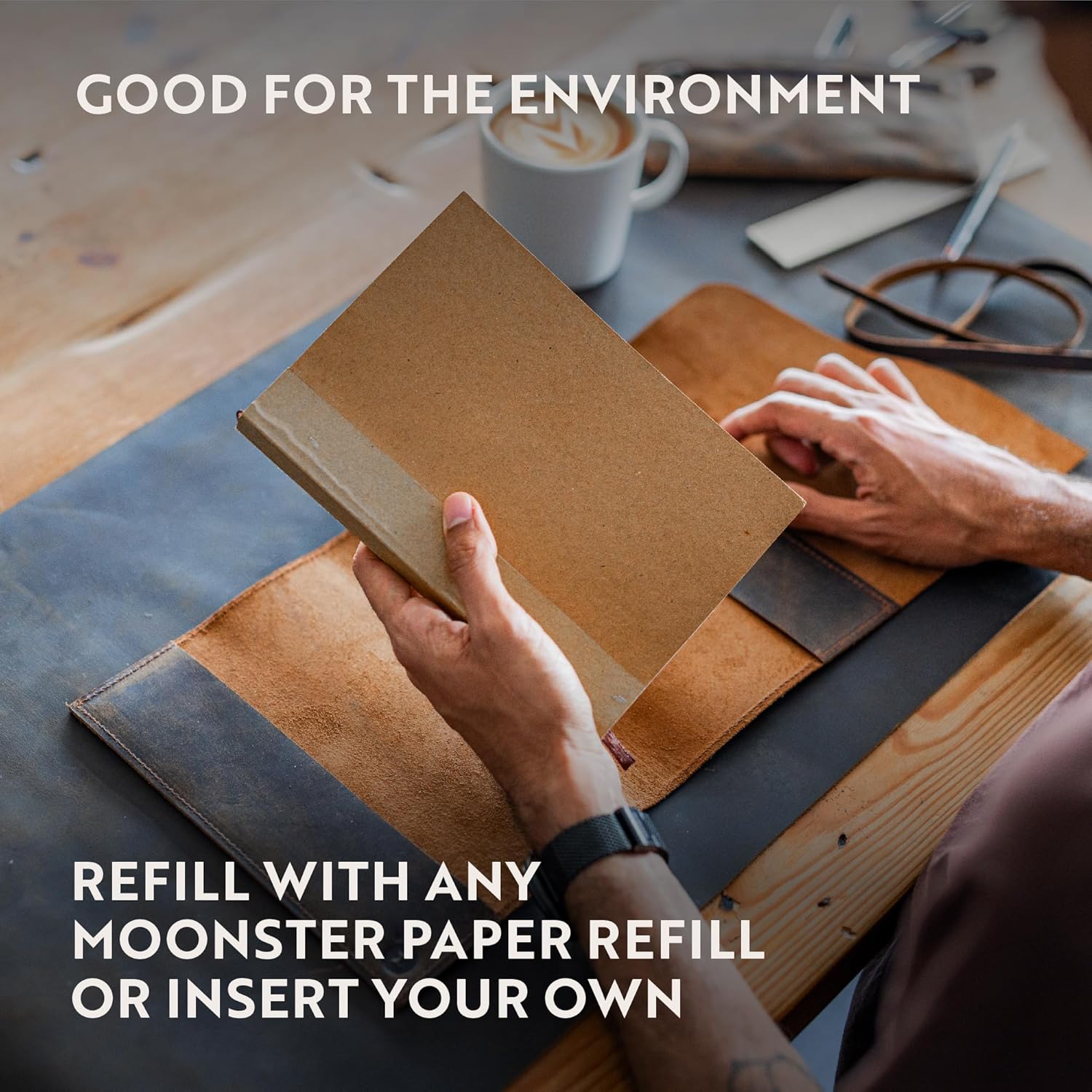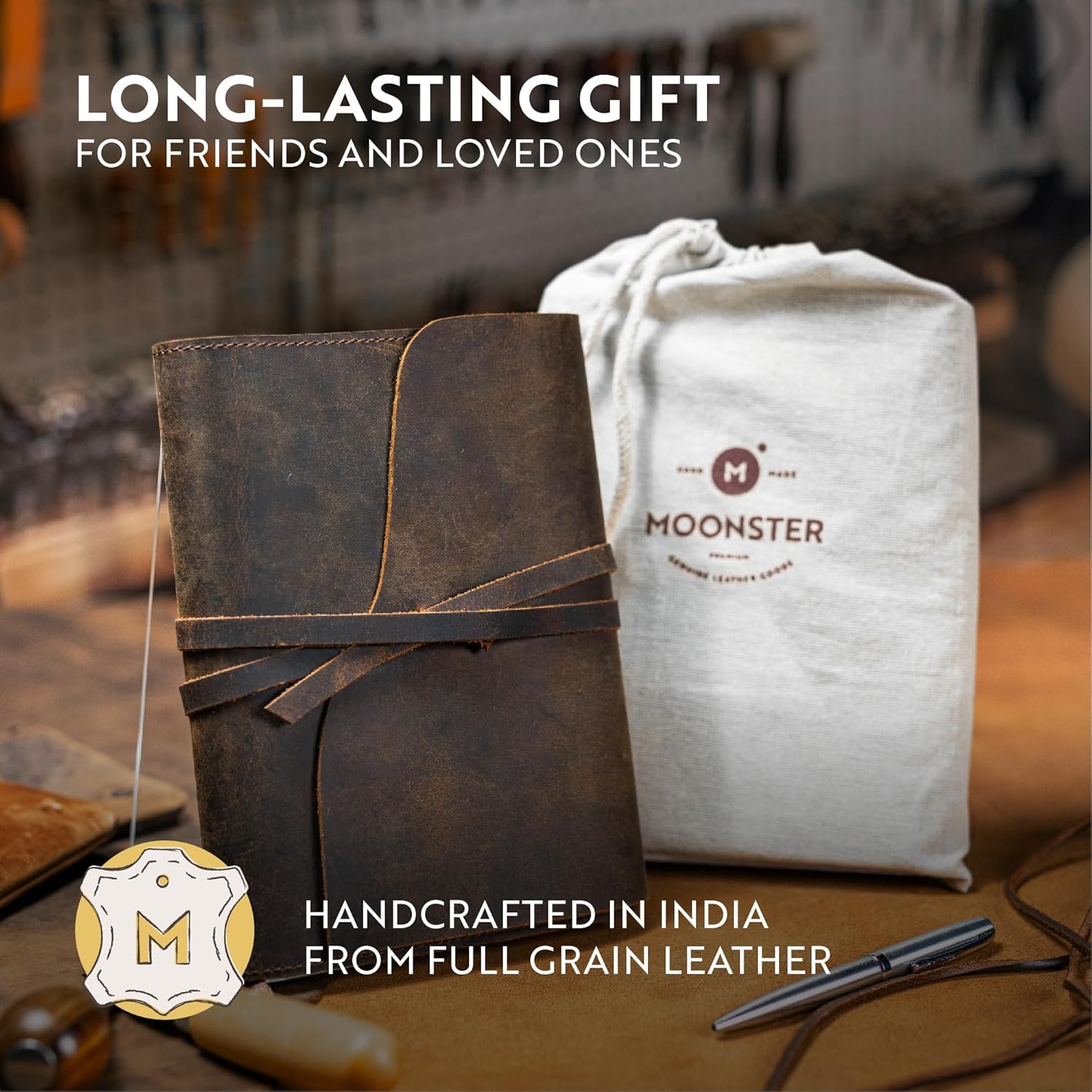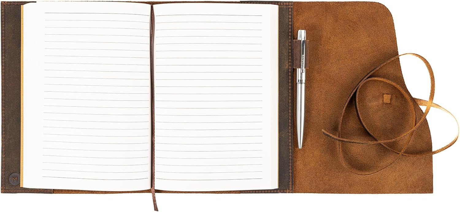 DIVERSO DAGLI ALTRI QUADERNI E DIARIO A5 IN ECOPELLE E DI SCARSA QUALITÀ - il nostro quaderno da viaggio da uomo è rilegato con pura pelle di bufalo 100% tagliata a mano per un look autentico e rustico. Questi diari in morbida pelle da 22 x 15,8 cm sono ottimi regali in pelle per le donne che le lasceranno ISPIRATE E MOTIVATE. IL DIARIO MEDIO A RIGHE È RIEMPITO CON CARTA DI BASSA QUALITÀ CHE DEGRADA l'esperienza di scrittura. Realizzati a mano in India con materiali di prima qualità, i nostri diari di viaggio vuoti sono realizzati con carta mista bianca da 70 g/m², perfetta per scrivere. Il nostro diario include un portapenne interno e una penna a sfera argentata che scorre attraverso il diario da 160 fogli (320 pagine), così puoi annotare facilmente pensieri e ricordi. SCRIVI CON STILE PER SEMPRE: emanando fascino rustico e un meraviglioso profumo di pelle, il diario da uomo per la scrittura può essere utilizzato per tutta la vita: riempilo con le nostre varie ricariche di carta Moonster. Il nostro bellissimo taccuino ricaricabile in pelle marrone scuro può variare nell'aspetto e nella tonalità, rendendolo un regalo unico e stimolante per le donne o come diario di viaggio per gli uomini. IL VECCHIO TACCUINO IN PELLE CHE RESTITUISCE. Per ogni acquisto effettuato, Moonster dona il 5% dei profitti a 5 enti di beneficenza in India, Zambia, Bolivia, Regno Unito e Stati Uniti. A MOONSTER, AMIAMO CREARE OTTIMI PRODOTTI IN PELLE FATTI A MANO che i nostri clienti amano tanto quanto noi - ed entrambi RESTITUIAMO. Siamo una piccola azienda a conduzione familiare, proprio come il nostro principale fornitore in India, che impiega ARTIGIANI LOCALI per realizzare gli eccellenti prodotti che abbiamo il privilegio di vendere. Ogni taccuino vintage è realizzato a mano e ottenuto in modo etico, utilizzando materiali sostenibili e riciclati ove possibile.
