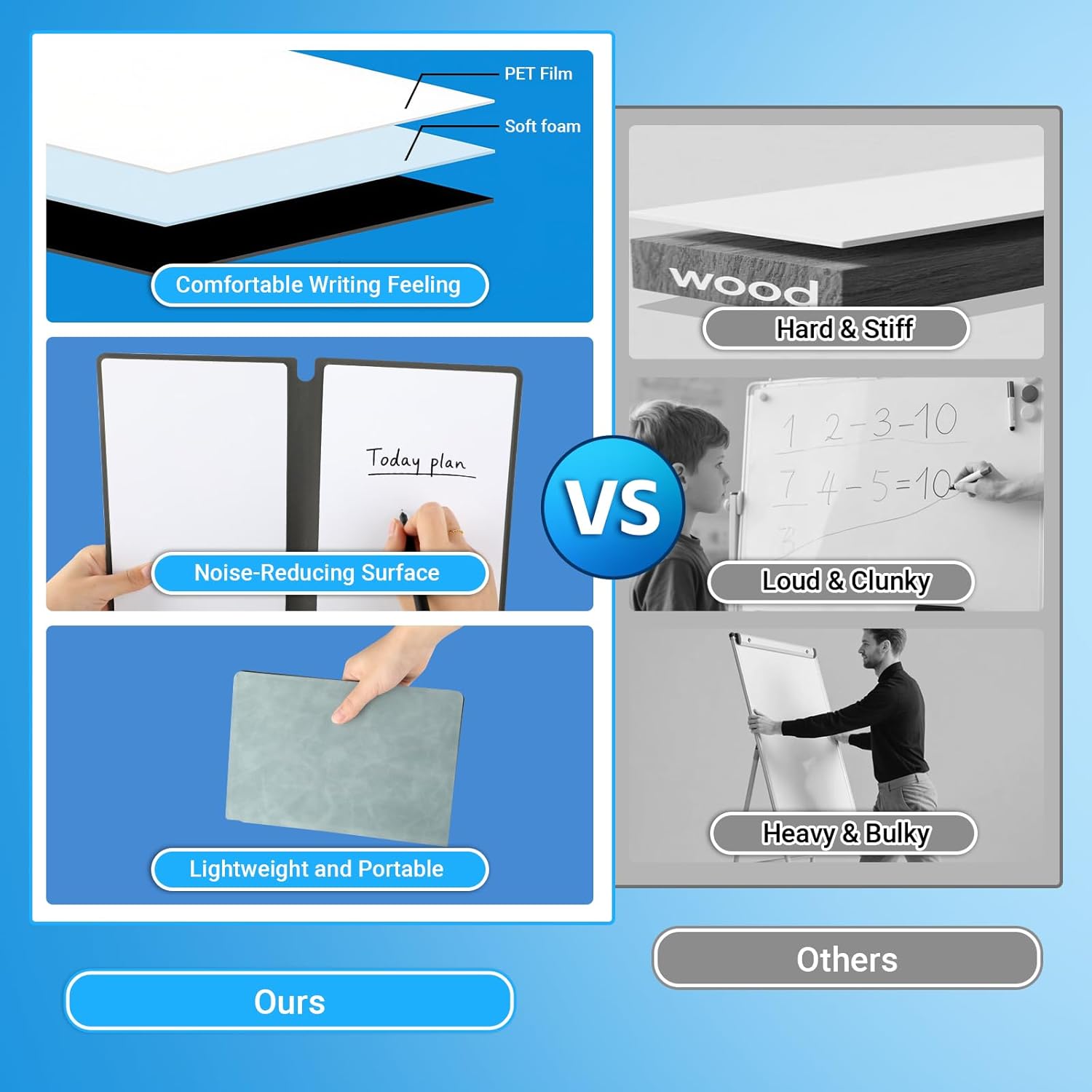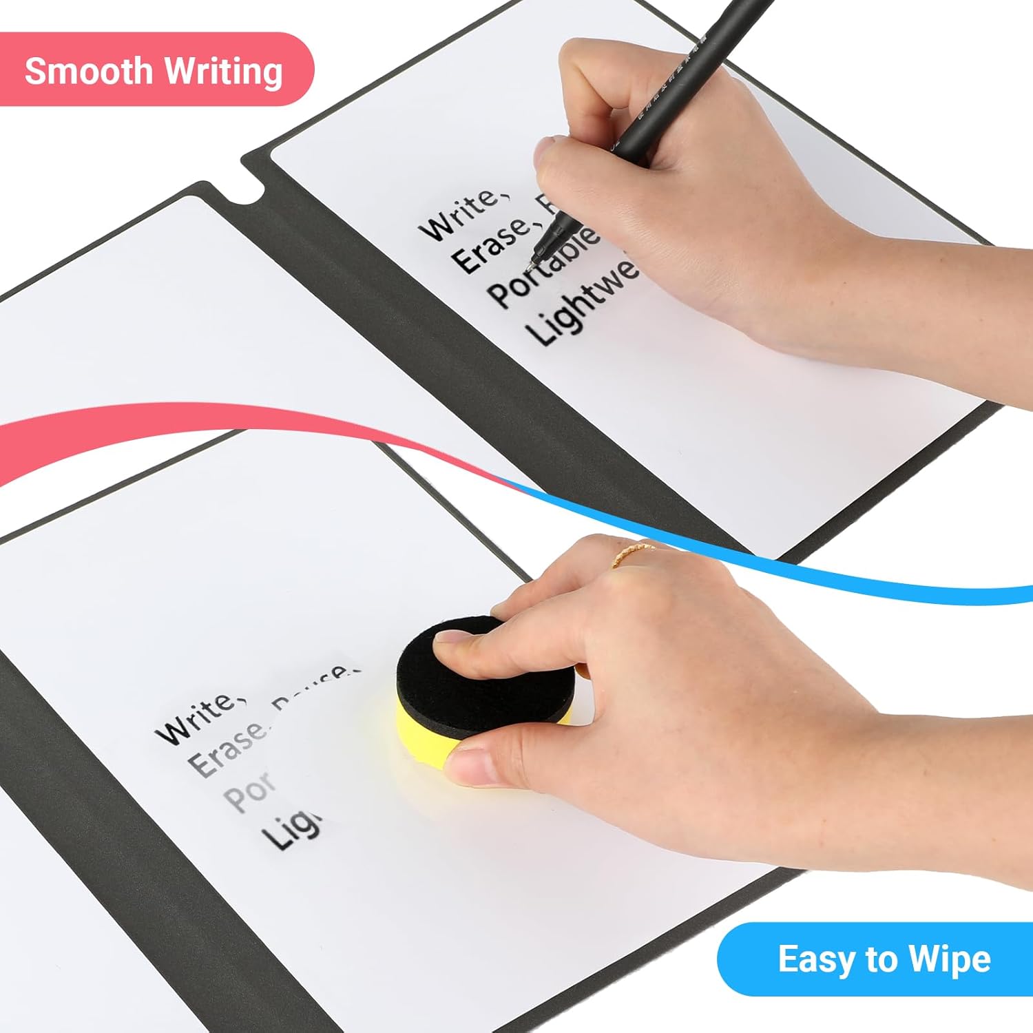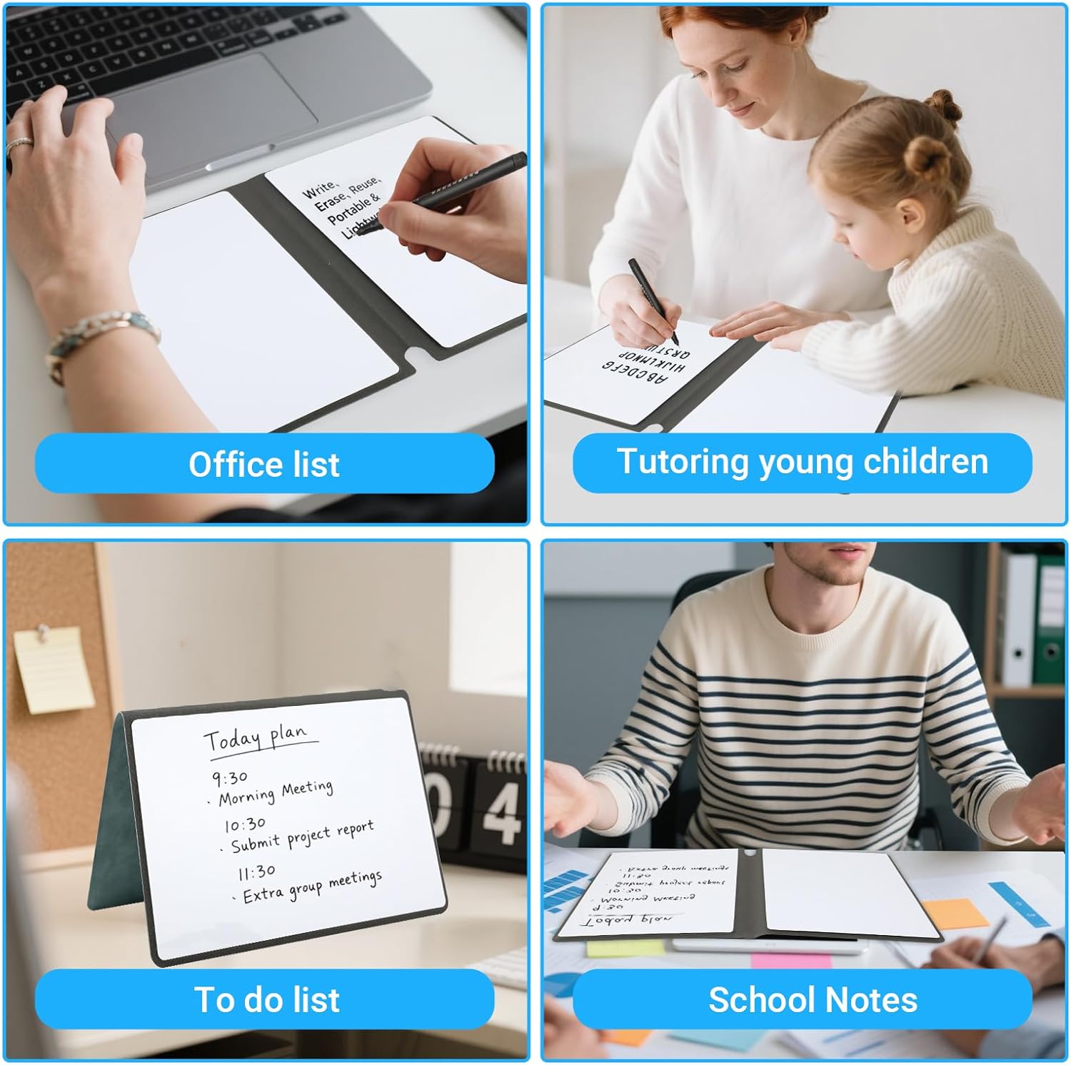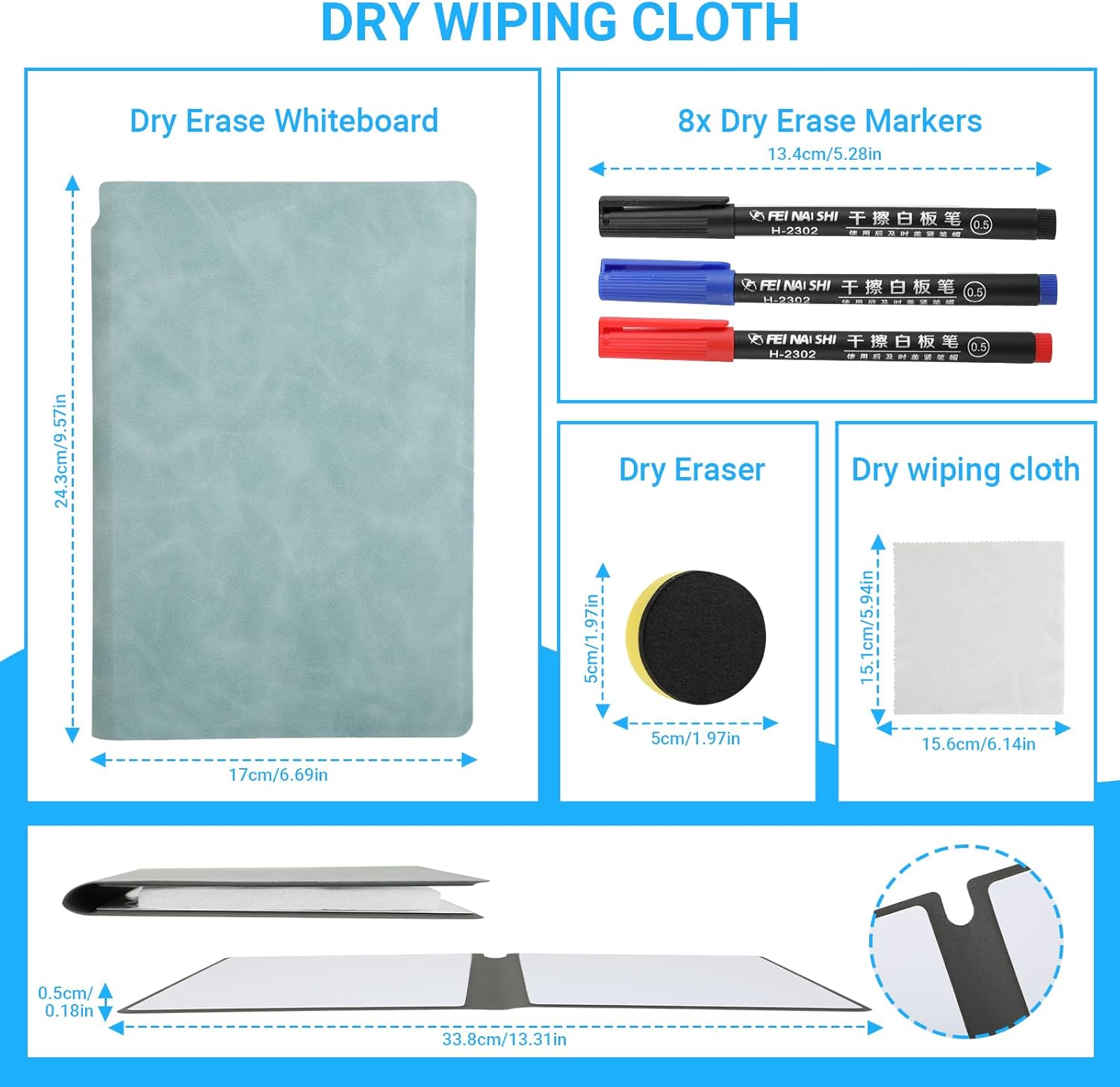 Formato A5 compatto: leggero e salvaspazio, si adatta facilmente allo zaino, alla cartella o alla cartella. Ideale per ufficio, studio, viaggi e appunti quotidiani. Set di 8 penne: include 2 penne rosse, 2 blu e 4 nere per pennarelli colorati. Include cancellino e panno per lavagna – pratico e completo. Scrivibile su entrambi i lati: la superficie di scrittura su entrambi i lati è cancellabile a secco, riutilizzabile e consente di risparmiare carta. Ideale per appunti, liste delle cose da fare e idee spontanee. Esperienza di scrittura fluida: la superficie con rivestimento polimerico garantisce una scrittura chiara e fluida. Basta strofinare con un panno o una gomma, pulito ed efficiente. Multiuso: perfetto per prendere appunti, riunioni, contenuti didattici o schizzi creativi. Pratico per studenti, studenti, professionisti e chiunque voglia rimanere organizzato.