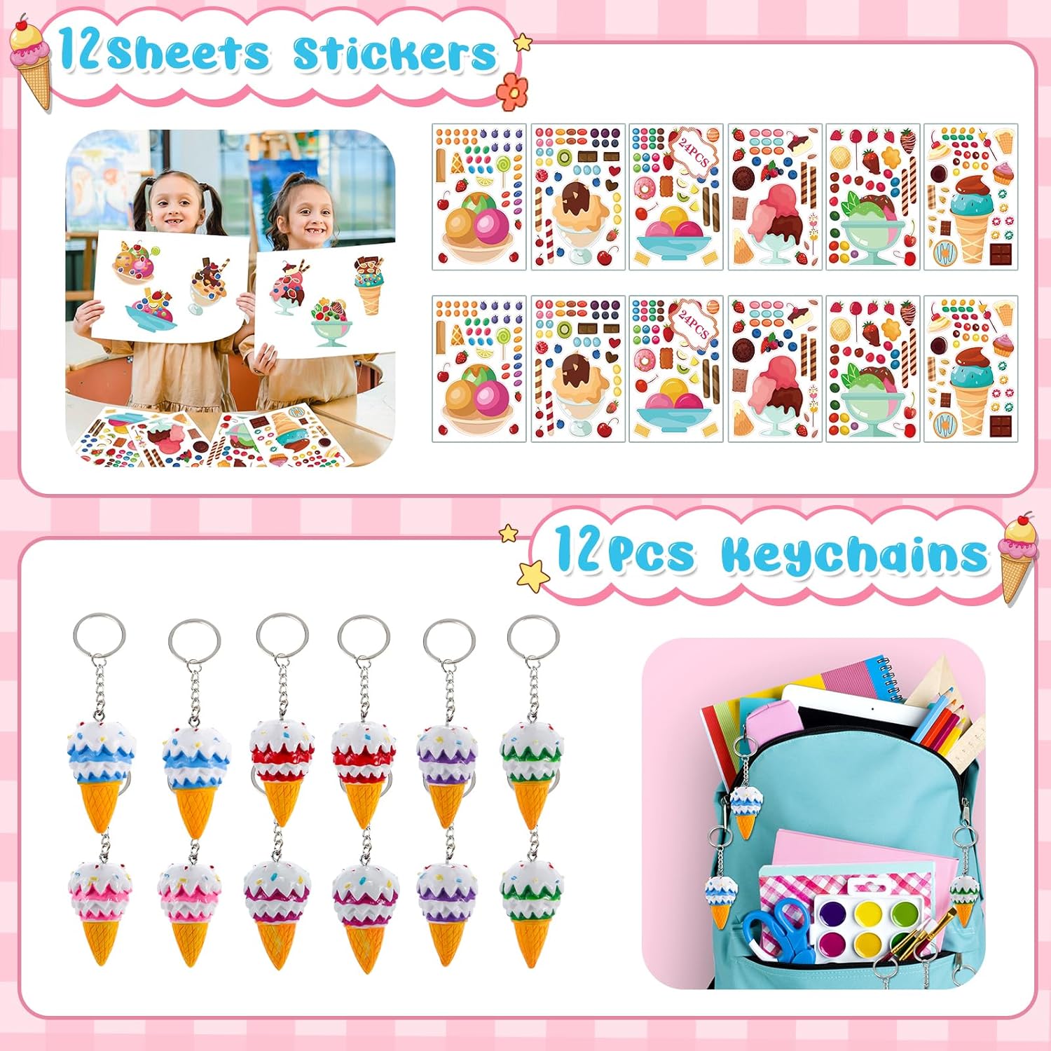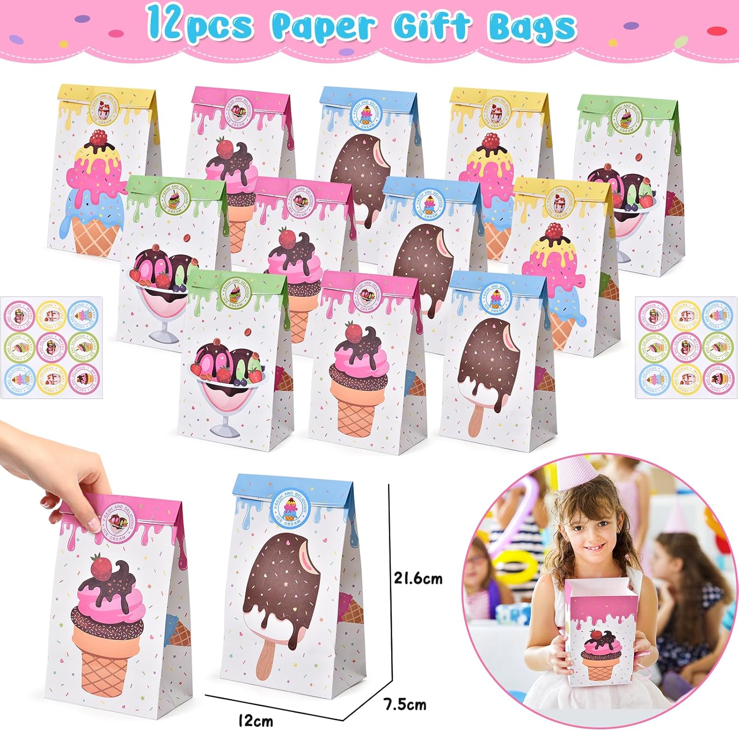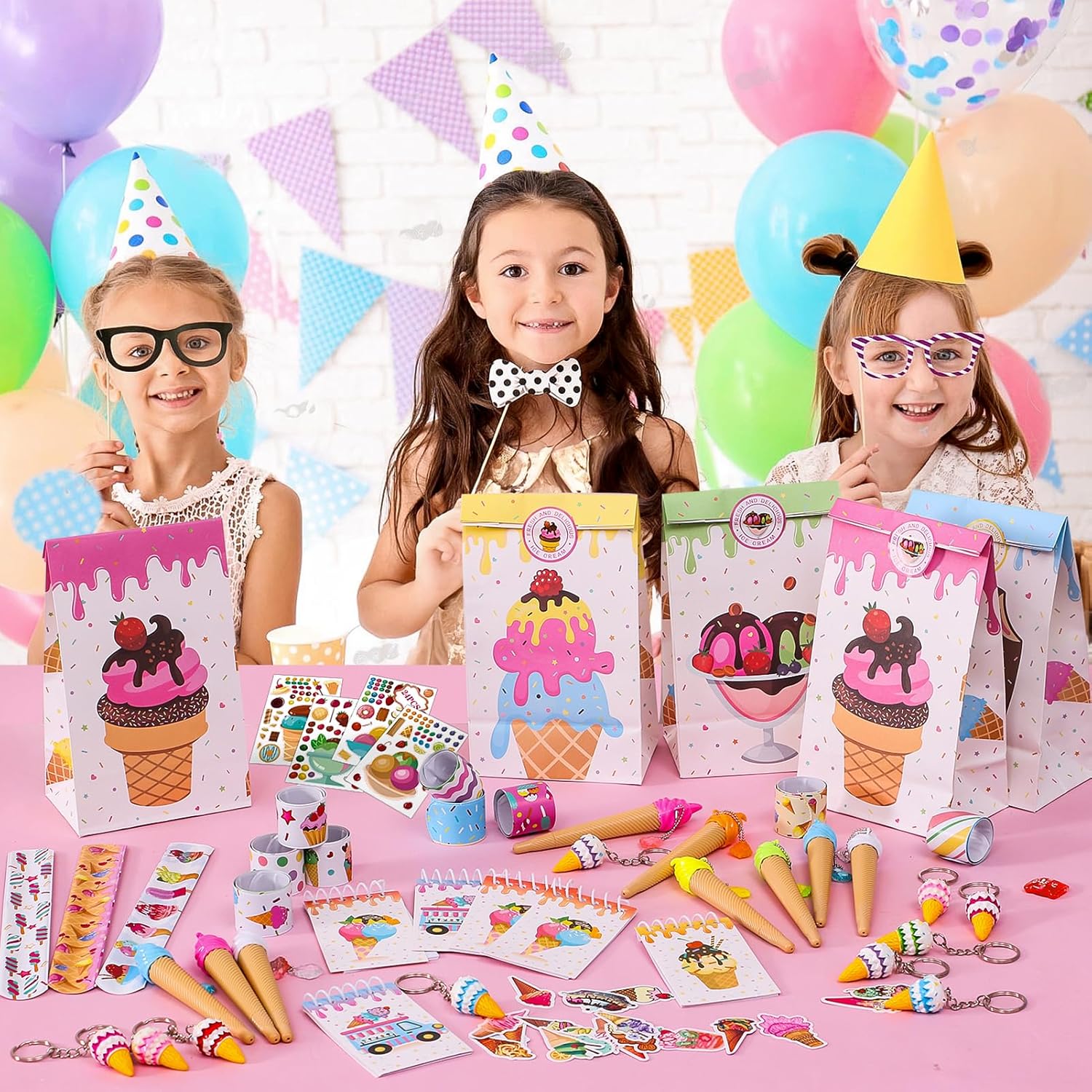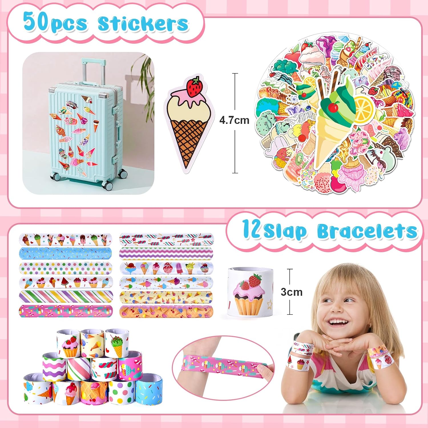 Bomboniere gelato per bambini: totale 122 pezzi, inclusi 12 mini quaderni a spirale (4 stili), 12 penne, 50 adesivi diversi, 12 fogli di adesivi per scrapbooking (6 stili), 12 braccialetti schiaffo in diversi modelli, 12 portachiavi (6 colori) e 12 sacchetti per le feste. Lascia che queste graziose e vivaci decorazioni per gelato illuminino la festa di tuo figlio e creino un'atmosfera divertente e felice. Uniche e creative: le nostre ricche e diverse bomboniere per gelati assicurano ore di divertimento per i tuoi piccoli e i tuoi ospiti. I bambini possono giocare con i braccialetti a schiaffo con gli amici, creare adesivi, scrivere o disegnare su quaderni con penne e decorare borse con portachiavi. Queste forniture creative per feste presentano bellissimi colori e design unici di gelato, che possono facilmente attirare l'attenzione e l'interesse delle ragazze. Sacchetti regalo per gelato: rendi la tua festa piena di sorprese e crea ricordi indimenticabili per ogni ospite. Ci sono 12 adorabili sacchetti regalo di carta che puoi preriempire con una selezione di caramelle, biscotti, snack, giocattoli, premi o altri piccoli dolcetti, perfetti per distribuire bomboniere e dolcetti alla festa di compleanno di tuo figlio. Ampia applicazione: queste bomboniere per gelato creano un'atmosfera a tema intenso e una festa visiva diversa. Adatto per decorazioni per feste di gelato, decorazioni per feste estive, riempitivi per sacchetti regalo, riempitivi per pinata, riempitivi per uova di Pasqua, riempitivi per calze di Natale, regali promozionali, premi per le aule scolastiche, regali per studenti, premi di giochi, regali di compleanno per bambine e così via. Servizio clienti Tacobear: le bomboniere per gelato dolce sono realizzate con materiali ecocompatibili, sicuri e non tossici. La nostra massima priorità è fornire a ogni acquirente un'esperienza di soddisfazione al 100%. Gli articoli mancanti o danneggiati verranno rimborsati o rispediti al supporto. Non esitate a contattarci in caso di problemi. Grazie per il vostro supporto e la vostra gentile comprensione!