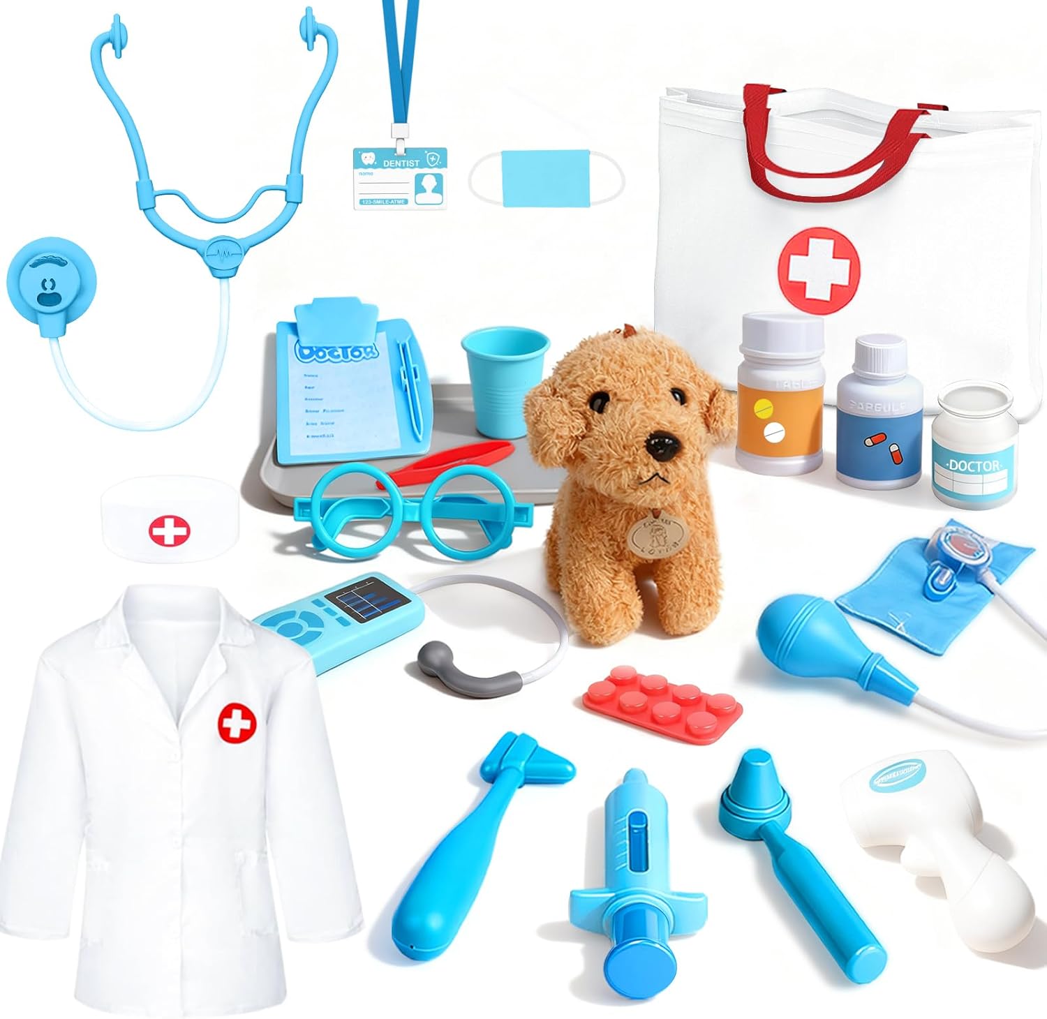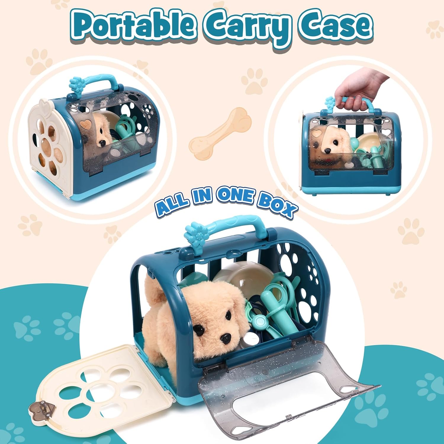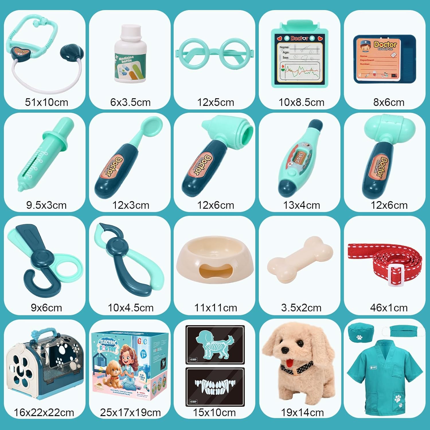 【Set da gioco per cani giocattolo elettronici】 Questo set di giocattoli veterinari viene fornito con numerosi accessori, tra cui un peluche cane elettronico interattivo, una gabbia per animali domestici, un costume da medico, strumenti medici giocattolo assortiti come stetoscopi, siringhe, termometri, ecc. e altri strumenti di uso quotidiano per prenderti cura del tuo animale domestico. Questi accessori permettono al tuo bambino di immergersi nel ruolo di un veterinario. 【Cucciolo di cane interattivo】 Il cucciolo di cane interattivo è adorabile e realistico. Utilizzare 2 batterie AA (non incluse) e posizionare le batterie nell'addome del cucciolo. Cammina e scodinzola quando premi l'interruttore e abbaia quando gli dai una pacca. I bambini potranno trascorrere ore di divertimento interattivo con questo giocattolo super carino. 【Qualità Premium】 Il pelo del cucciolo è morbido e confortevole e il colore non sbiadisce quando viene toccato. Il collare a pois bianco e nero con fibbia in metallo è fissato sul collo del cane, processo di cucitura rinforzato, non facile da strappare. Realizzato in poliestere resistente e facile da pulire, il costume da veterinario è adatto alla maggior parte dei bambini dai 3 ai 7 anni. 【Interessante gioco di ruolo veterinario】 Il nostro set da medico ha ricchi accessori e l'interazione è più interessante. I bambini non solo possono sperimentare varie attività con gli animali domestici, ma anche indossare tute veterinarie e fingere di essere veterinari, esaminare i cani da compagnia, fare radiografie, ecc. Offre ai bambini l'esperienza di giocare con gli animali domestici e migliora anche l'immaginazione e le abilità dei bambini utilizzando più strumenti. 【Regalo perfetto per i bambini】 Adatto dai 3 anni in su, è ottimo per il gioco di ruolo veterinario. Un regalo significativo per neonati, bambini, ragazzi e ragazze per premi quotidiani, compleanni, Natale o altre festività.