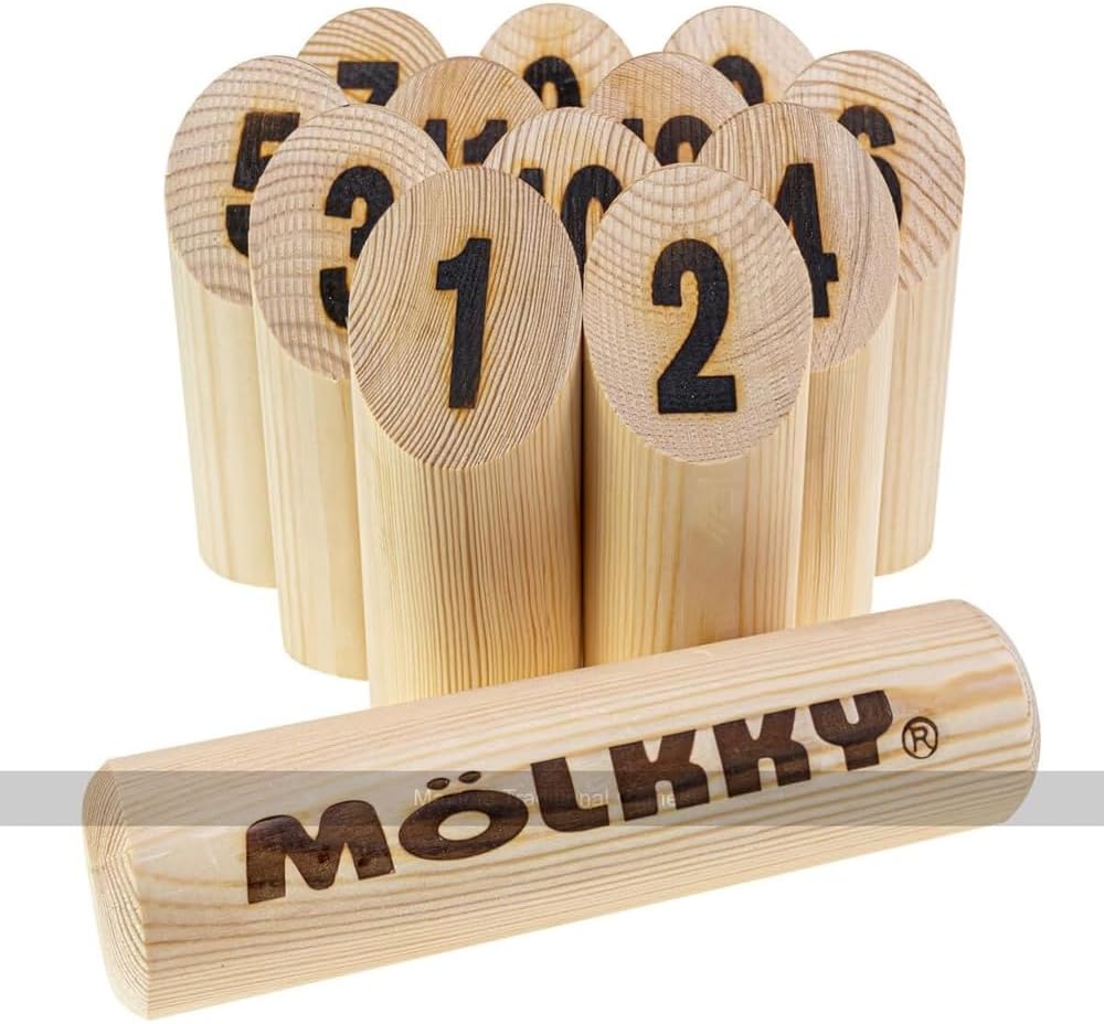 Mölkky is an easy to learn, strategic skittles game from Finland|Players score points by knocking over numbered pins with a throwing stick|The objective is to reach exactly 50 points|Mölkky GO is a full-size version made Pine wood. Softer and lighter than the Original|Comes with a sturdy cardboard storage box featuring rope handles for easy carrying