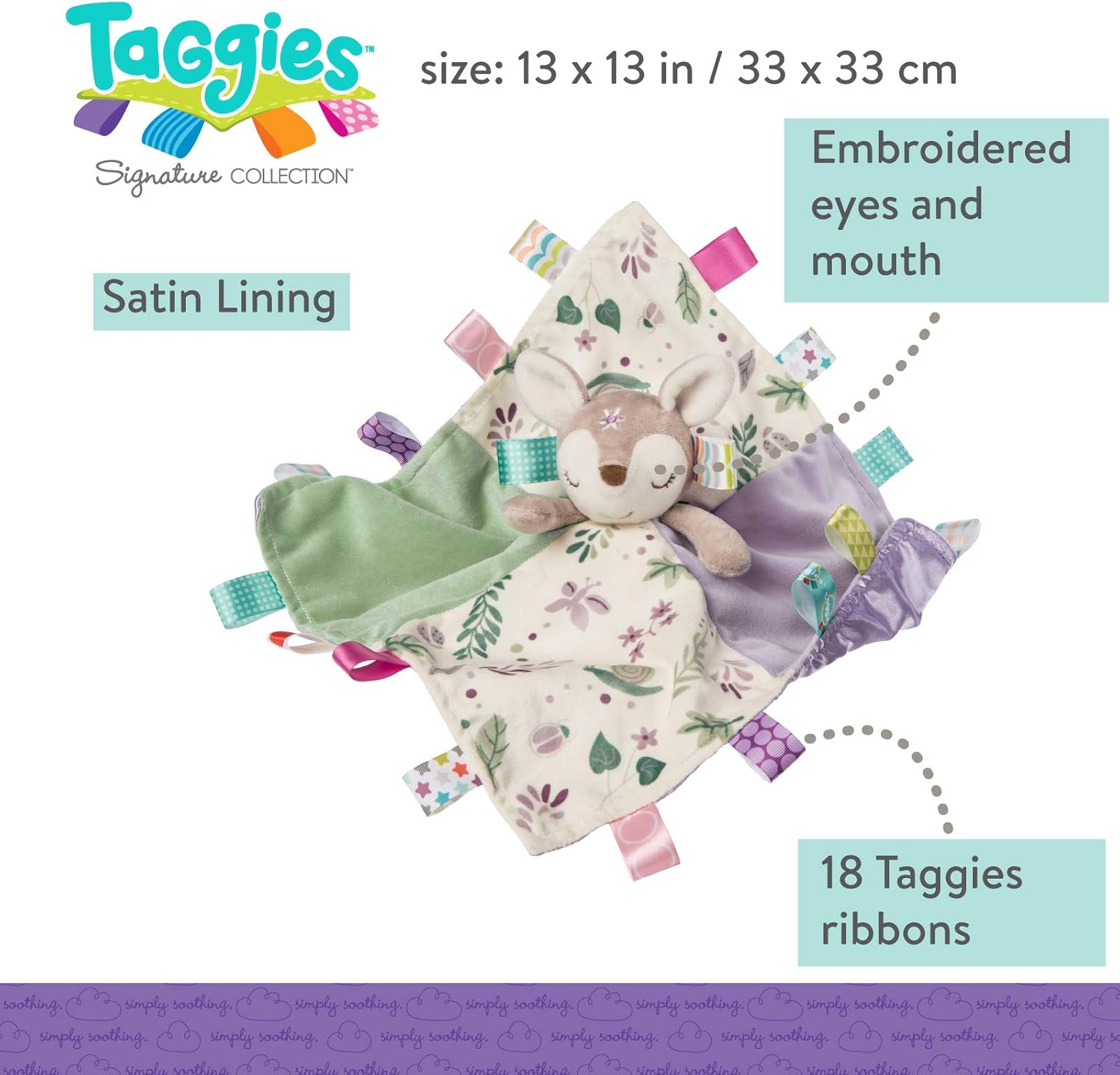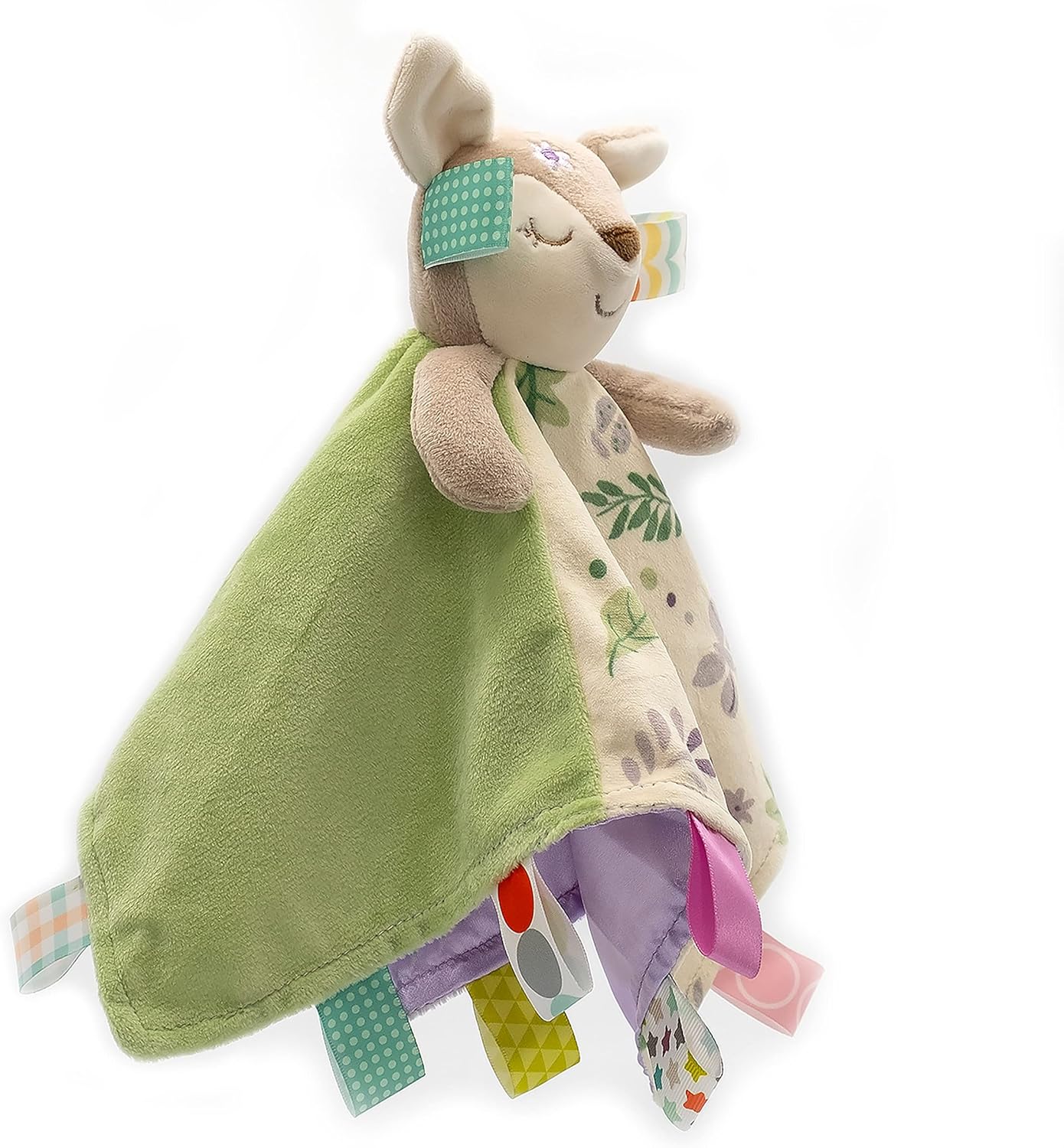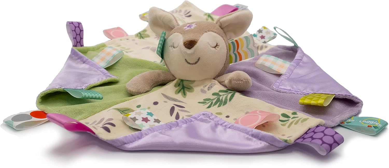 Giocattolo e coperta in uno morbido cervo in cima attaccato 30,5 x 30,5 cm; Flora Fawn è marrone chiaro e crema con occhi assonnati ricamati e un dolce sorriso Ideale per coccolare: la coperta combina quadrati di viola e salvia con crema a motivi floreali; presenta una fodera in raso viola sotto TAGS I BAMBINI AMANO ESPLORARE: Decorato con tag interattivi e lenitivi in raso per la gioia sensoriale del bambino; usa la coperta del personaggio come un amore confortante o per giocare a peekaboo Ogni peluche di questa collezione è realizzato con bottiglie di plastica riciclata, tra cui il materiale esterno in peluche e l'imbottitura in fibra. Hangtag è anche riciclabile e mostra il processo di creazione del nostro peluche. Regali per baby shower di alta qualità: da combinare con peluche, sonaglio e giocattolo increspato della collezione Flora Fawn di Taggies