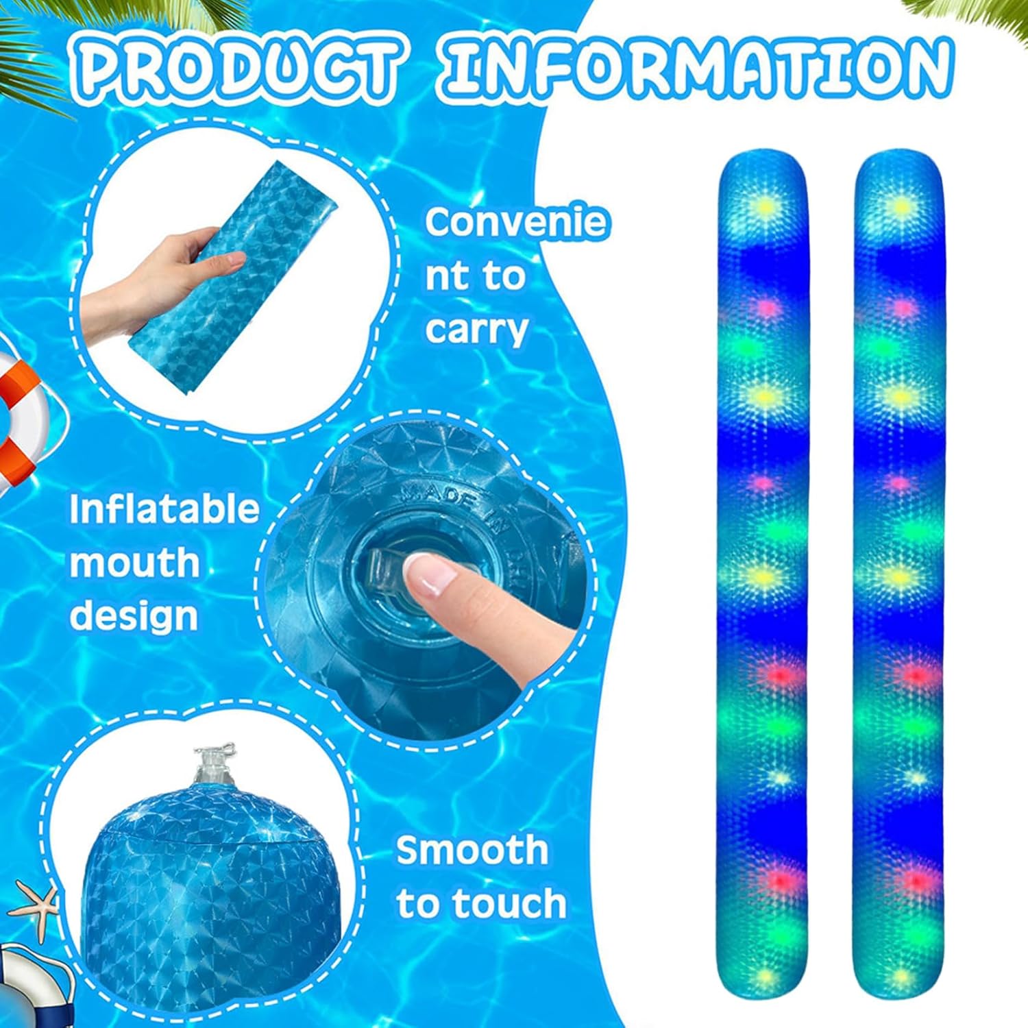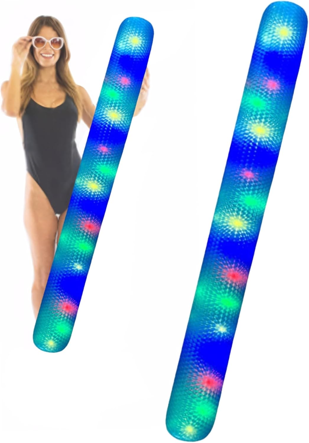 Design portatile e gonfiabile: facile da gonfiare, sgonfiare e riporre, questo leggero tubo da piscina è ideale per viaggi, vacanze e gite spontanee sulla spiaggia o sul lago. Misura extra lunga 63: goditi più divertimento e supporto con questo tubo gonfiabile da piscina di grandi dimensioni, perfetto per rilassarsi, galleggiare o giocare in piscine, laghi e in spiaggia. Materiale in PVC liscio: realizzato in PVC liscio di alta qualità, questo noodle da piscina è di lunga durata, eccellente galleggiabilità e una sensazione morbida e confortevole sulla pelle. Versatile per ogni occasione: che tu stia nuotando, rilassandoti o organizzando una festa a bordo piscina, questo tubo da piscina aggiunge divertimento e funzionalità extra alle tue avventure acquatiche. Luce LED integrata: illumina le tue nuotate notturne o le feste in piscina con una luce integrata, aggiungendo un tocco divertente e luminoso alla tua esperienza galleggiante, perfetta sia per bambini che per adulti.