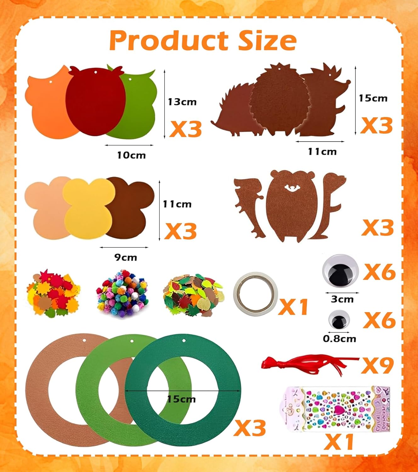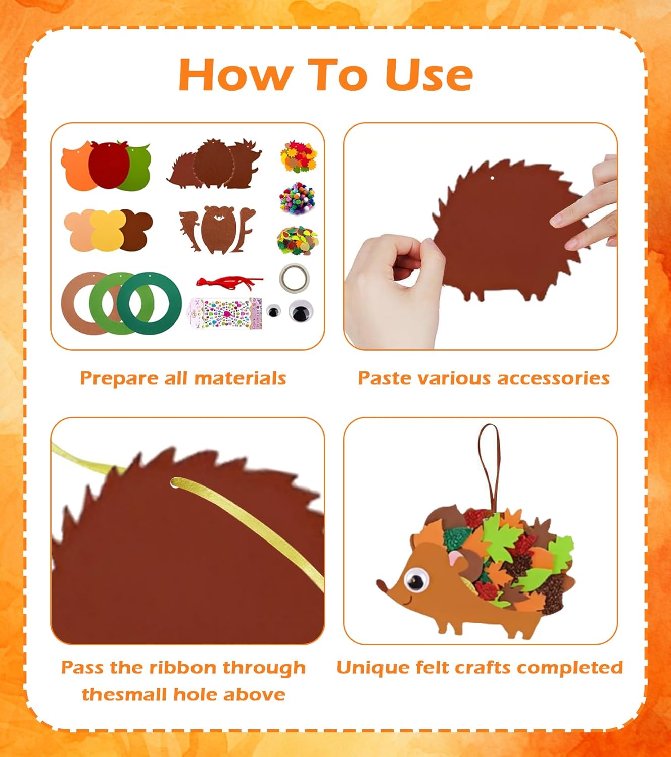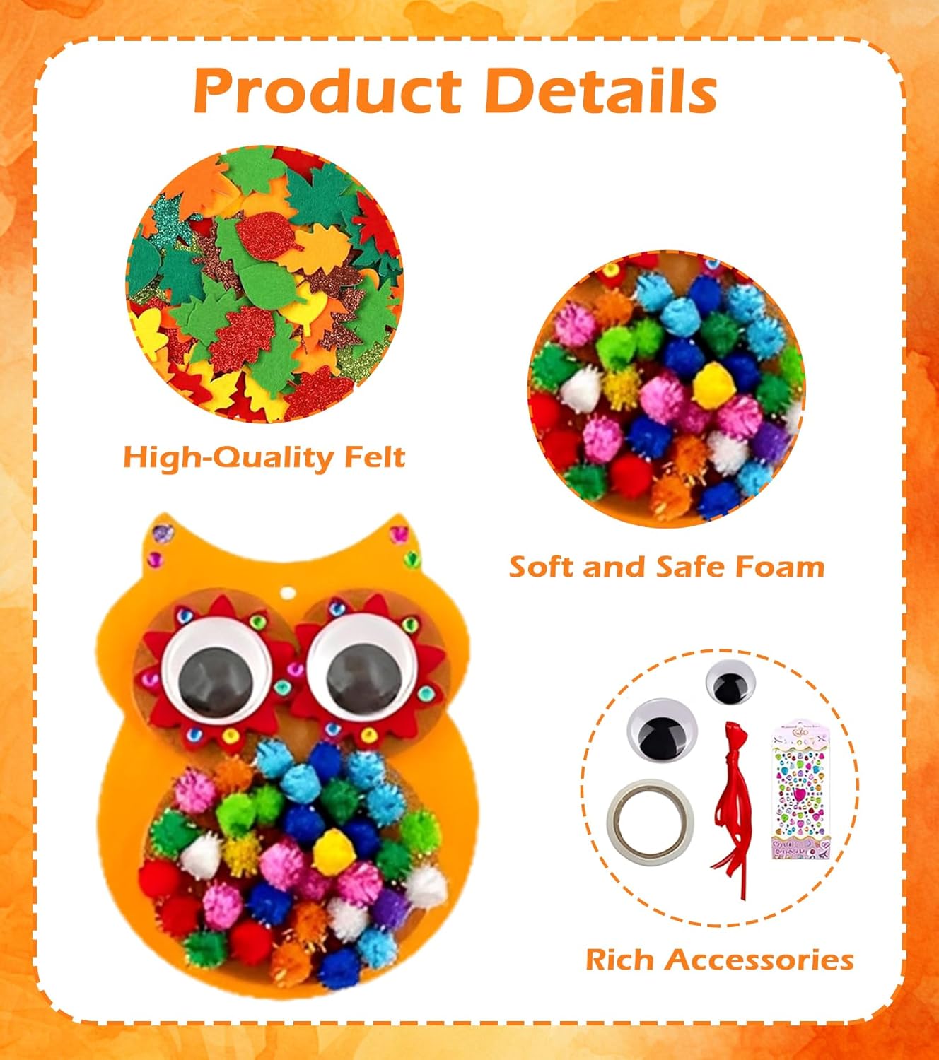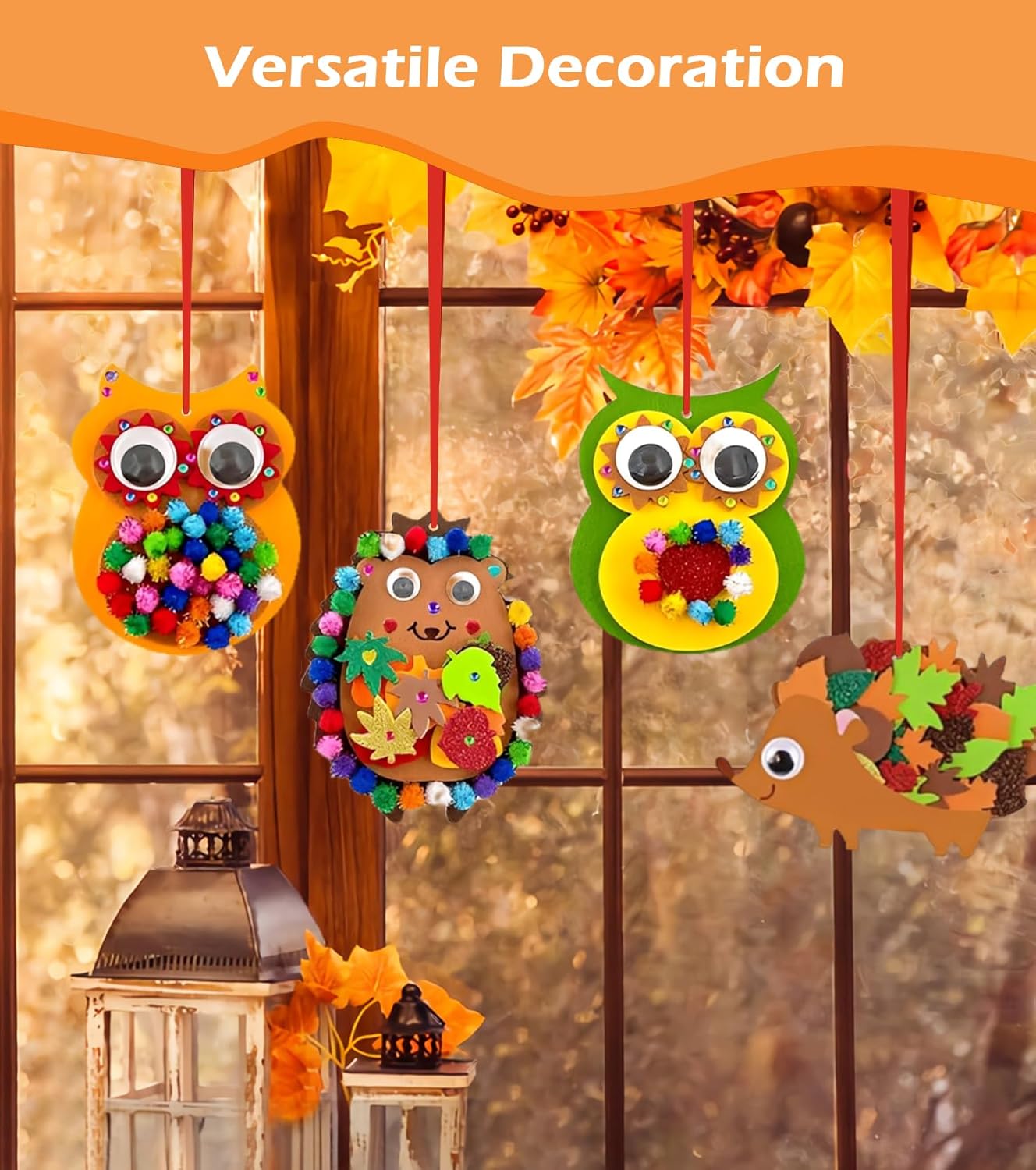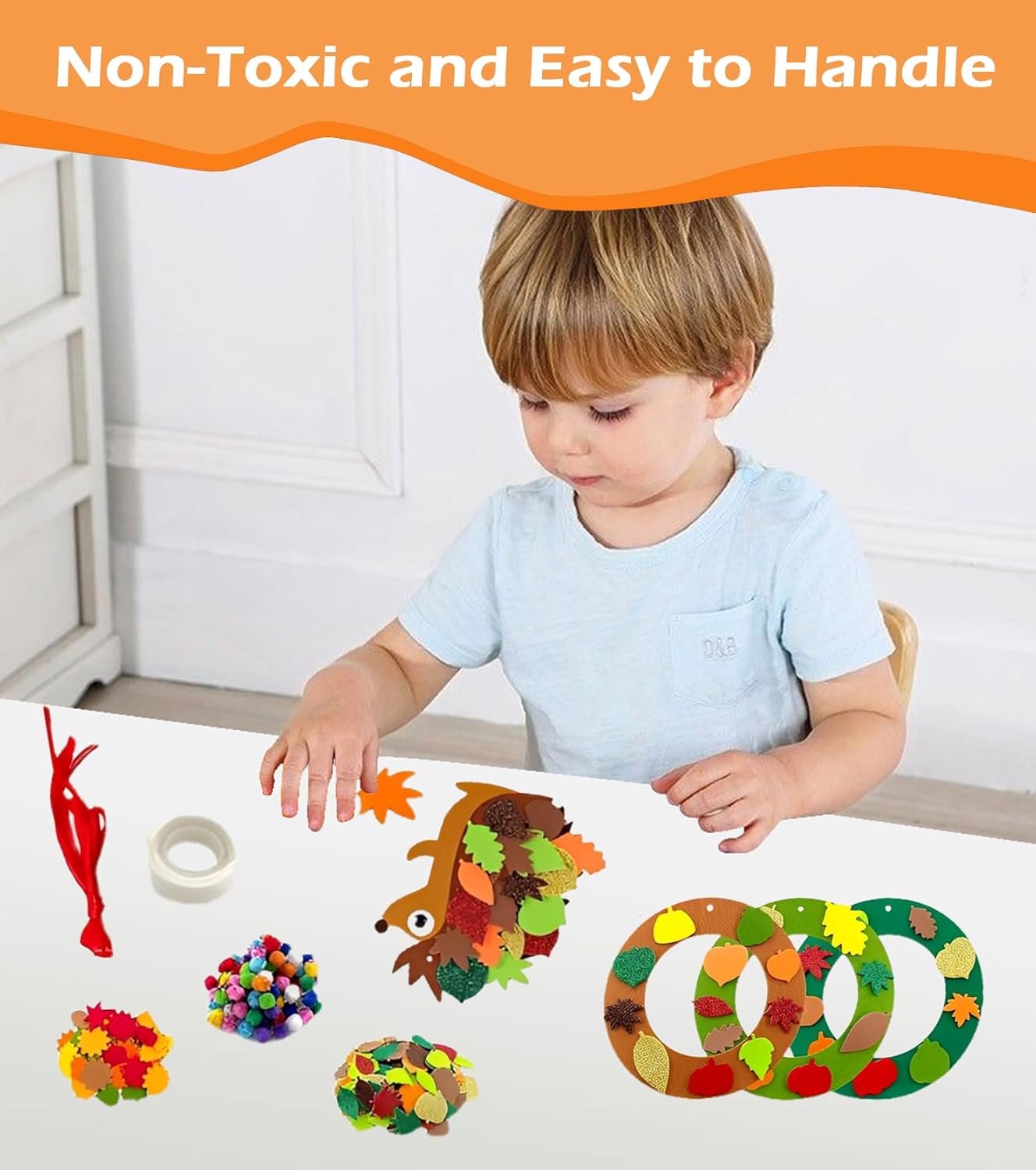Ampio set fai da te – Il nostro set per l'autunno per bambini contiene gufi, ricci e ghirlande in feltro e gomma espansa, nonché adesivi, nastri e pompon. Tutto in un unico set, in modo che i bambini possano iniziare subito a fare il fai Materiali sicuri e adatti ai bambini: il set fai da te in feltro per bambini è realizzato in feltro colorato, leggero e atossico e gomma espansa. Tutte le parti sono sicure per le mani piccole, resistenti e ideali per il fai da te con la famiglia. Creatività e motoria fine: il set fai da te in gomma espansa per bambini supporta giocosamente lo sviluppo di fantasia, coordinazione occhio-mano e destrezza. I bambini possono implementare le proprie idee e presentare con orgoglio le loro opere d'arte. Facile da usare: le parti autoadesive consentono di creare senza problemi senza forbici o colla. Anche i bambini più piccoli possono creare facilmente i motivi, mentre i genitori devono solo aiutare con adesivi fini. Perfetto per feste e decorazioni: che si tratti di feste autunnali, Halloween, Ringraziamento o Natale: con questo set per bambini per l'autunno si creano graziose decorazioni che abbelliscono finestre, pareti o regali e entusiasmeranno anche come pensierino.