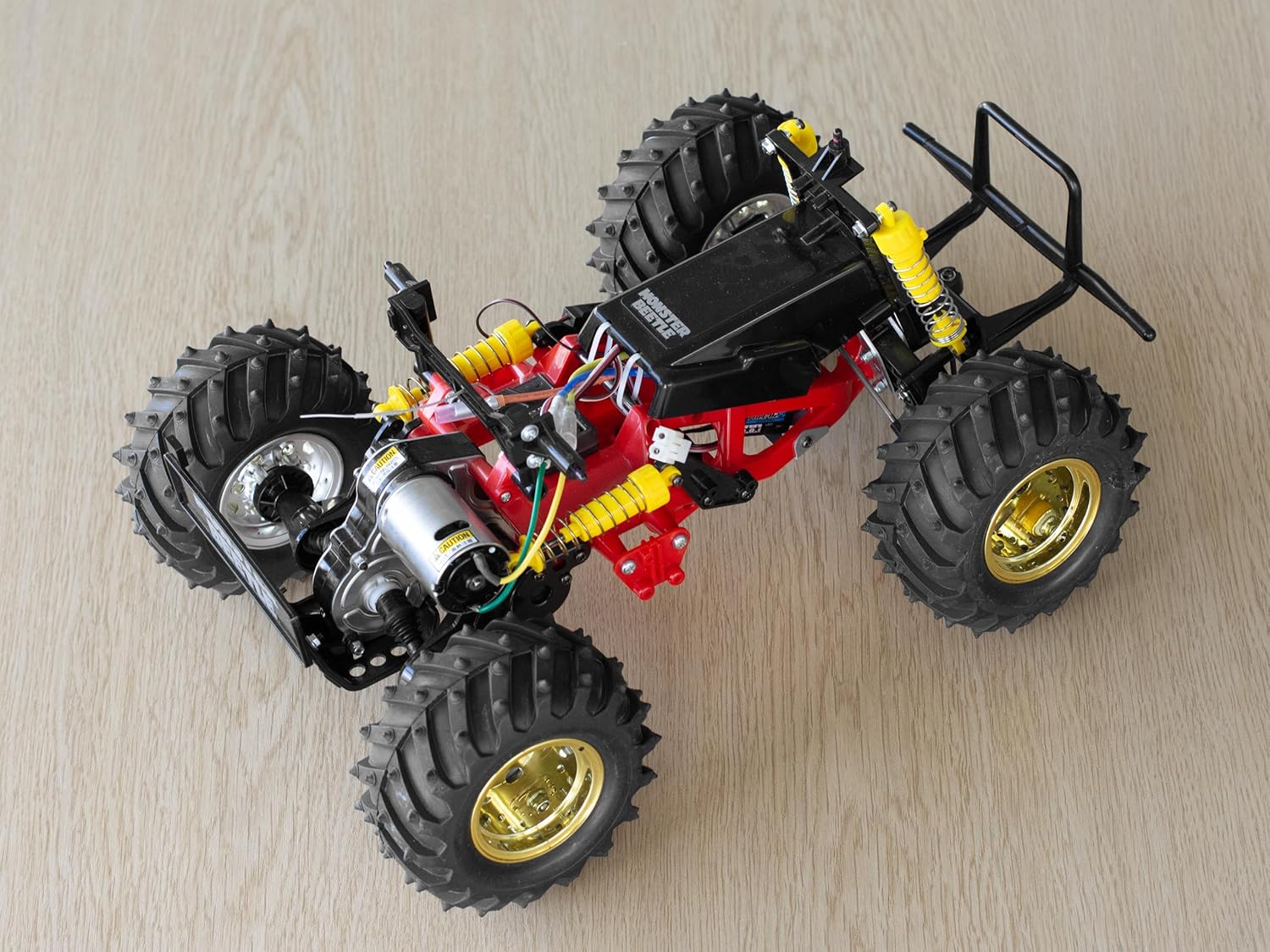 Tamiya Kit di controllo radio di marca per auto. È incluso un ESC (Electronic Speed Controller). Necessario per completare: unità di controllo radio a due canali, servo sterzo, batteria e caricabatterie da 7,2 volt e Tamiya TS Paint Questa versione di riedizione del kit di montaggio Monster Beetle presenta una serie di aggiornamenti pur mantenendo il layout di base della vettura fuoristrada originale rilasciata nel 1986. È dotato di un corpo di Maggiolino personalizzato realistico raffigurato in resina di polistirene resistente, con parti metalliche fornite nel kit per aggiungere il tocco finale alle maniglie e ai telai dei fari. Una figura di driver in resina è la ciliegina sulla torta! Il telaio della trazione posteriore di questo modello resistente si basa su un telaio spaziale in ABS resistente per resistere alla guida fuoristrada a tutte le azioni. Le sospensioni indipendenti a 4 ruote utilizzano ammortizzatori a olio CVA e hanno configurazioni anteriori a doppio braccio trasversale e posteriori a braccio trascinante. Ammortizzazione e presa superlative sono fornite da pneumatici con punte da 130 mm di diametro, 58 mm di larghezza su ruote placcate oro appariscente. Gli alberi universali efficienti e durevoli sono dotati di stivali di gomma. Lunghezza: 410 mm. Larghezza: 285 mm. Altezza: 240 mm. Interasse: 247 mm.