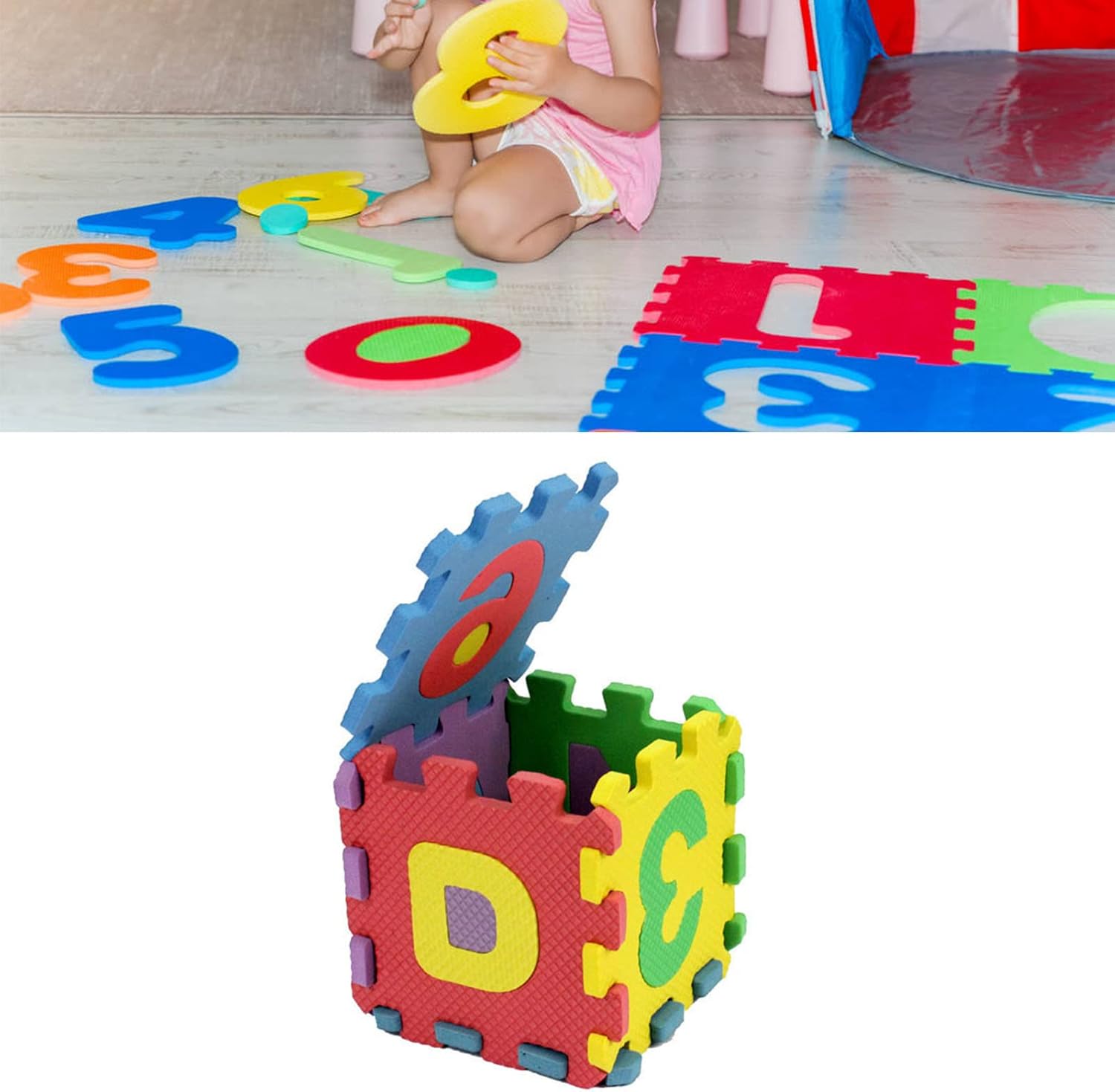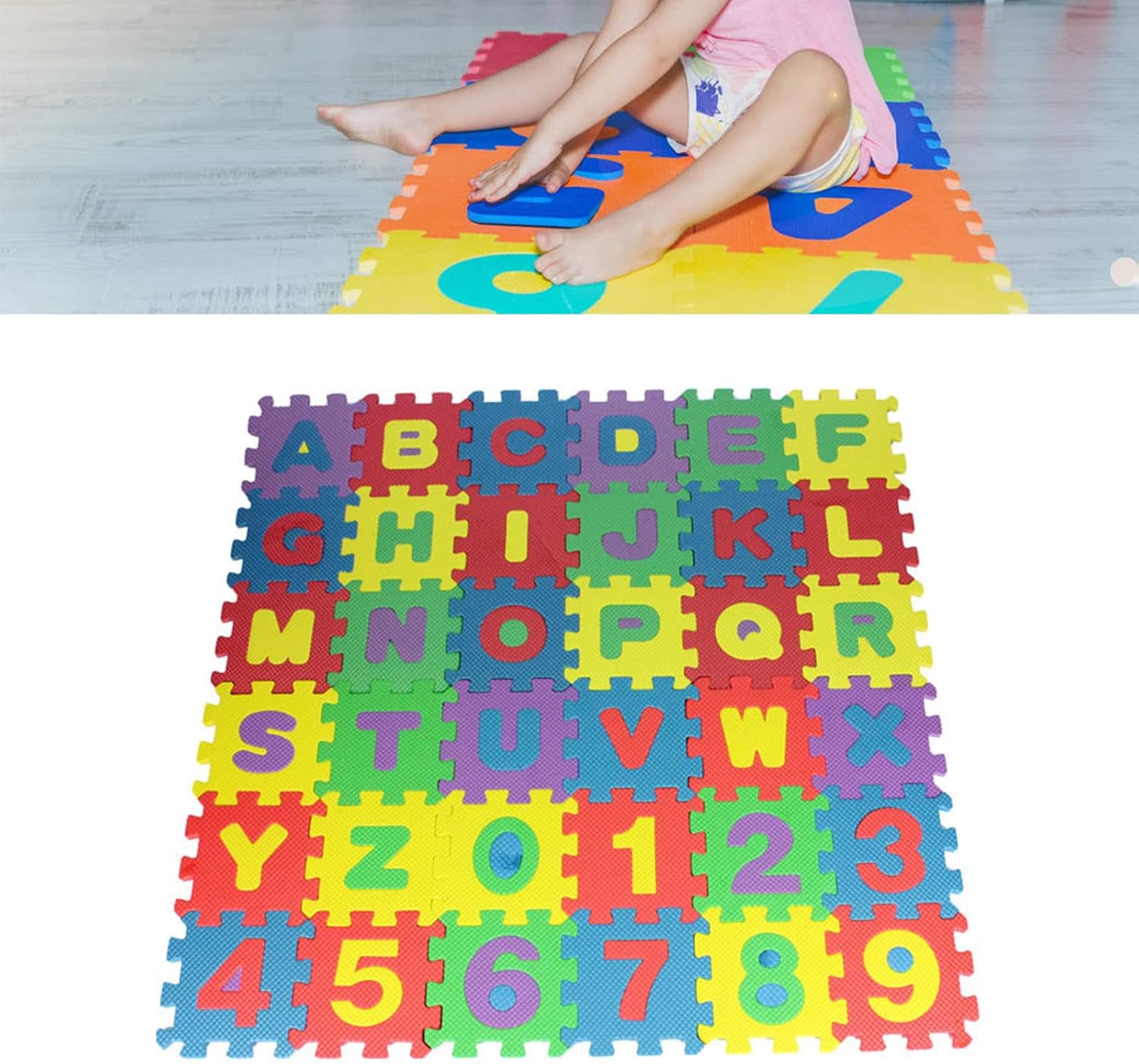 Colori brillanti: i tappetini da gioco sono disponibili in un'ampia gamma di colori accattivanti che stimolano lo sviluppo del bambino e lo mantengono impegnato e divertente. Area di gioco divertente: il tappetino da gioco in schiuma ad incastro presenta un alfabeto ABC dai colori vivaci e numeri che si collegano sul pavimento per creare un'area di gioco divertente. Facile da pulire: tappetino in schiuma da gioco rimovibile, può essere impilato, superficie liscia, può essere pulito direttamente con un asciugamano bagnato, facile da pulire. Morbido e confortevole: il bambino può gattonare in modo sicuro e confortevole sul tappetino in schiuma per sviluppare ulteriormente le sue capacità motorie. Schiuma EVA: realizzata in schiuma EVA ipoallergenica, è spessa e morbida, Sicurezza, non facile da deformare, resistente alla trazione e può essere utilizzata a lungo.
