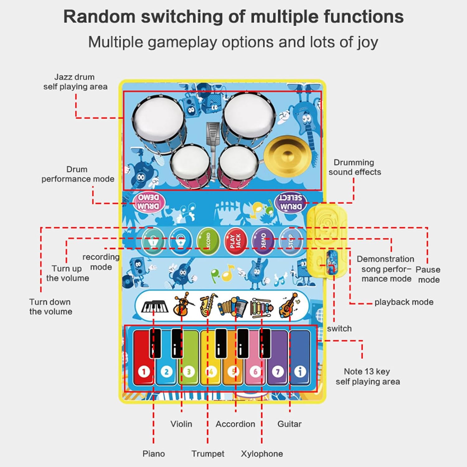Adatto a bambini di 3 anni interessati alla musica o ai genitori che vogliono coltivare le abilità musicali del loro bambino Scatena il talento musicale del tuo bambino con questo giocattolo portatile per pianoforte. Perfetto per sviluppare il ritmo e le abilità musicali a casa, a scuola o all'aperto, questo giocattolo per piano è perfetto per il tempo libero, feste o spettacoli, aggiungendo valore interattivo e di intrattenimento Realizzato in tessuto sicuro e plastica, questo tappetino per pianoforte garantisce ore di gioco. Il tamburo portatile ergonomico e confortevole rende facile da suonare Un regalo perfetto per compleanni, feste e occasioni speciali che aggiungono felicità e creatività ai bambini