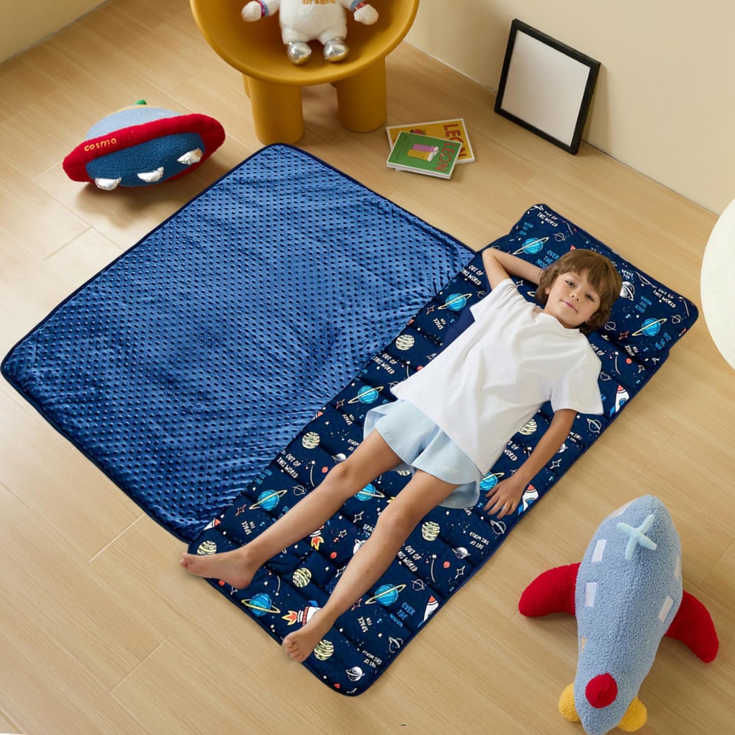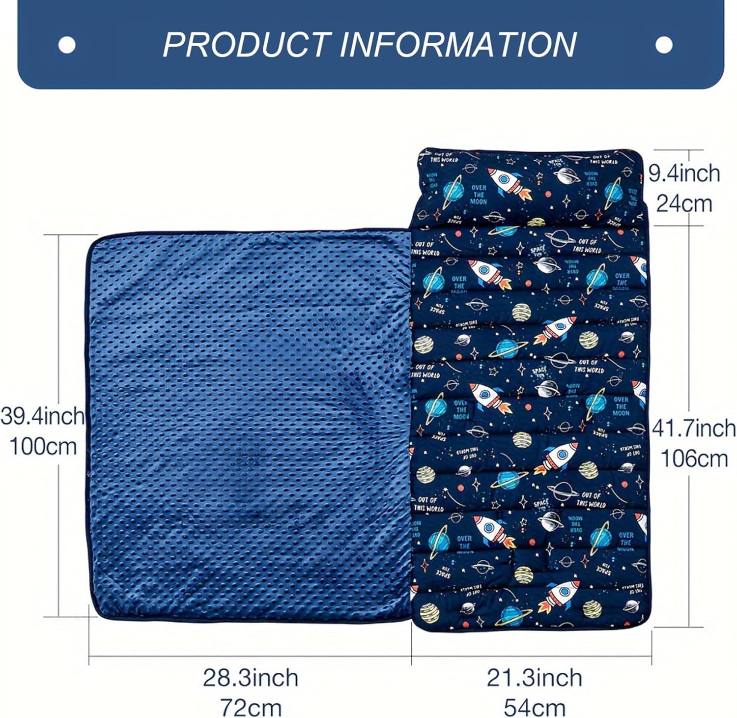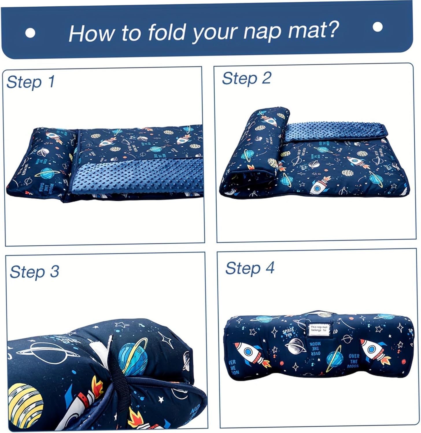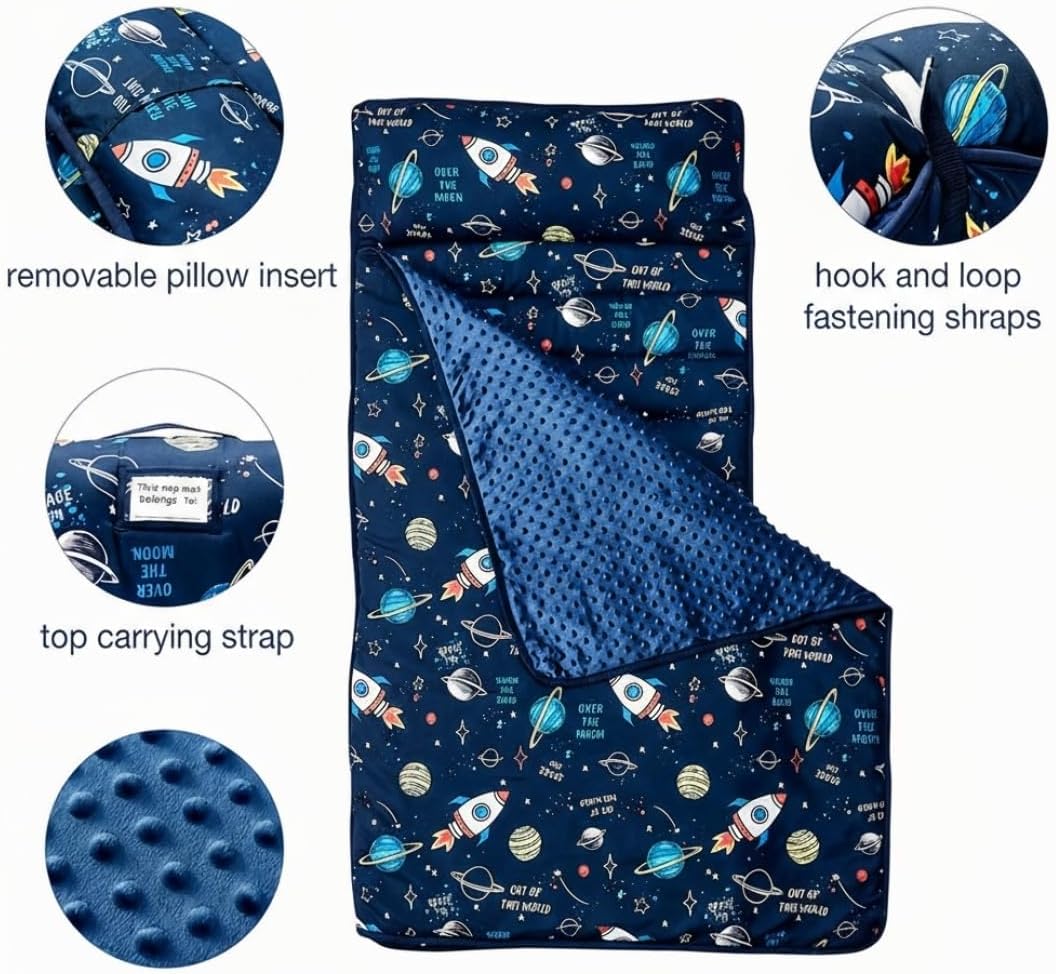 Tasca con nome personalizzata: include una pratica tasca con nome per una facile identificazione, ideale per aule o spazi per dormire condivisi, garantendo che il tappetino per il pisolino di tuo figlio torni sempre a casa. Coperta morbida: la coperta in peluche aggiunge calore delicato e consistenza rilassante, creando un ambiente di sonno confortevole che aiuta i bambini a sistemarsi rapidamente. Stile arrotolabile portatile: dotato di cinghie di fissaggio a strappo e di una tracolla superiore, questo tappetino per il pisolino arrotola in modo compatto per un facile trasporto all'asilo nido, alla scuola materna o in viaggio. Design anti-calcio: il fissaggio sicuro della coperta aiuta a evitare che il tuo piccolo sollevi dalla coperta, mantenendo il calore durante i sonnellini per un riposo e un comfort migliori. Inserto del cuscino rimovibile: l'inserto del cuscino può essere facilmente rimosso per la pulizia o la regolazione, mantenendo il tappetino fresco, igienico e adattato alle esigenze di comfort del tuo bambino.