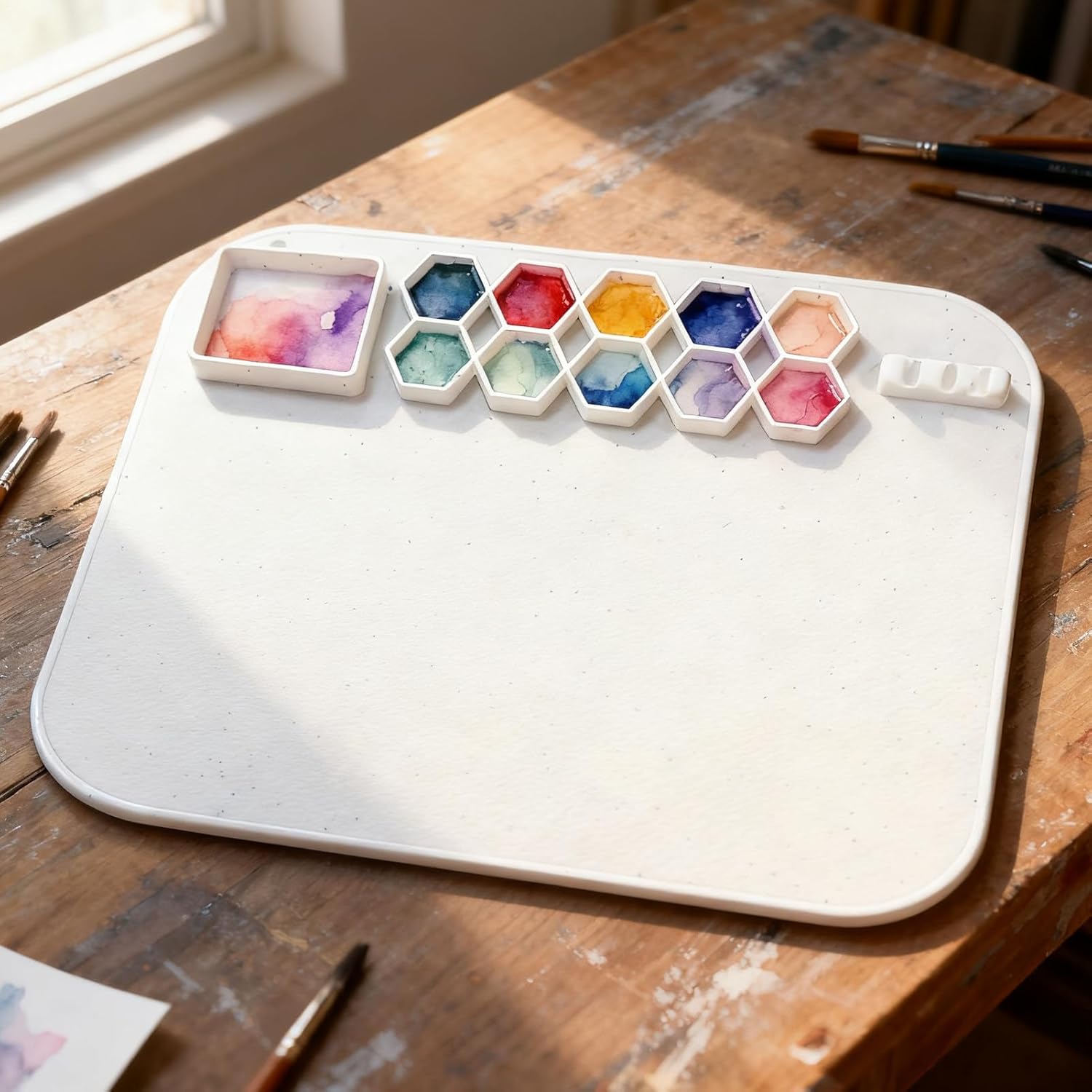Tappetino per pittura adatto ai viaggi: la struttura pieghevole di questo tappetino per pittura in silicone migliora la portabilità e semplifica lo stoccaggio, ideale per gli artisti durante il lavoro sul campo o come accessorio complementare per gli studi domestici. Superficie artistica riutilizzabile: il tappetino da pittura per bambini offre una superficie versatile in silicone come panno per dipingere e tavolozza di colori con superfici lavabili e riutilizzabili. Le aree di miscelazione della vernice integrate consentono di dipingere in modo creativo a scuola o a casa con una facile pulizia. Design di pittura efficiente: con il tappetino per pittura in silicone per bambini, la disposizione intelligente delle zone di colore e il portaspazzole a forma di U assicurano che gli utensili siano sempre a portata di mano, promuovendo un'esperienza di pittura senza soluzione di continuità e supportando l'esplorazione artistica in qualsiasi ambiente. Resistente allo stiramento e alle pieghe: realizzato in silicone di alta qualità, questo tappetino per pittura resiste efficacemente allo stiramento e alle pieghe, mantenendo la sua forma a lungo e fornendo una superficie morbida e delicata senza segni di rughe. Supporta la creatività senza soluzione di continuità sia nei progetti artistici professionali che nei progetti fai-da-te. Area di lavoro sicura: la superficie antimacchia impedisce l'ingresso di liquidi, garantendo un ambiente di lavoro protetto per lavori di progettazione precisi e garantendo un'esperienza di verniciatura senza preoccupazioni e senza problemi