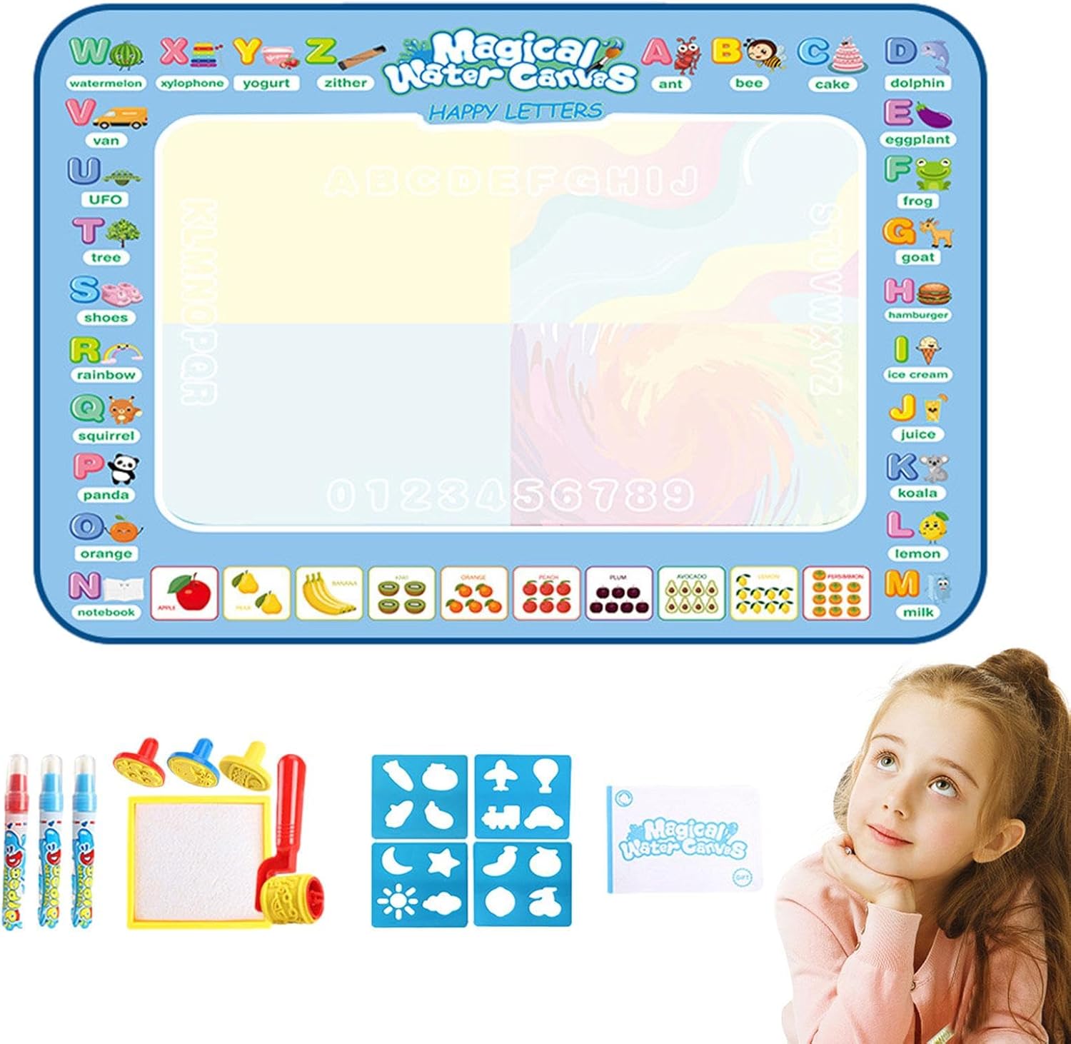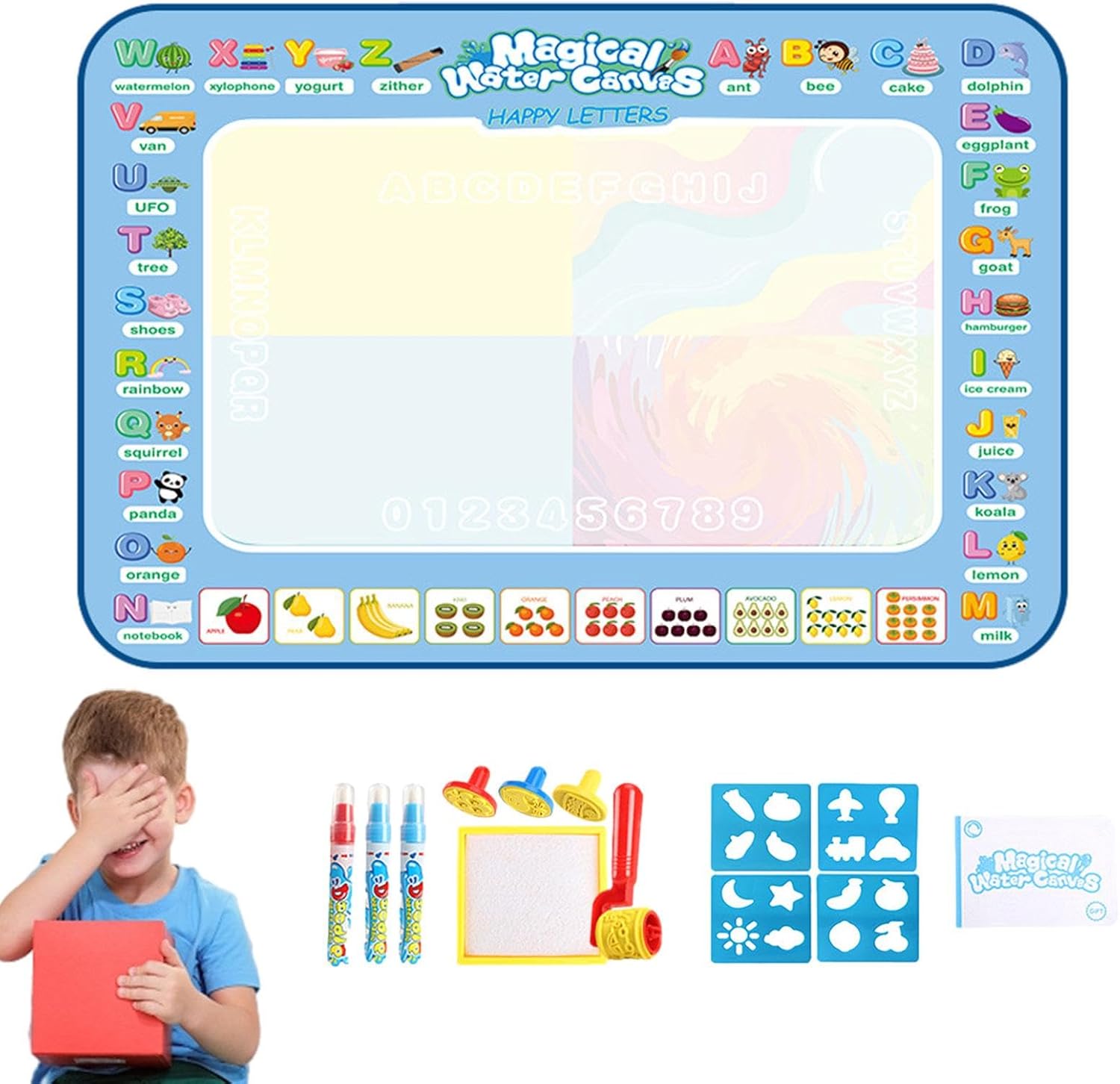 Niente più disordine: crea un parco giochi igienico e ordinato per loro con il tappetino in tela Water Doodle Mat. Non c'è bisogno di preoccuparsi di vestiti macchiati o pareti rivestite di vernice. Liberate la creatività: stimolate la creatività e l'immaginazione del vostro bambino con questo tappetino per scarabocchi acquatici. Un piacere infinito li aspetta mentre disegnano con acqua su diversi modelli. Migliora la loro percezione del colore ed esercita la coordinazione occhio-mano per un'esperienza di apprendimento divertente. Può essere riutilizzato: questo tappetino per pittura ad acqua in tela riutilizzabile non si limita al semplice disegno. Usalo anche per praticare lettere, numeri e forme Modo d'uso: liberare la loro creatività con la penna riempita d'acqua e guardare i colori magicamente appaiono sul Doodle Mat. Divertimento senza danni, inchiostro e macchie per età, facile e sicuro da usare. Regalo caloroso: questo tappeto scarabocchi ad acqua viene fornito con un libretto di pittura che contiene diversi tipi di disegni di cartoni animati e passaggi di pittura, rendendo la pittura più interessante ed educativa per loro.